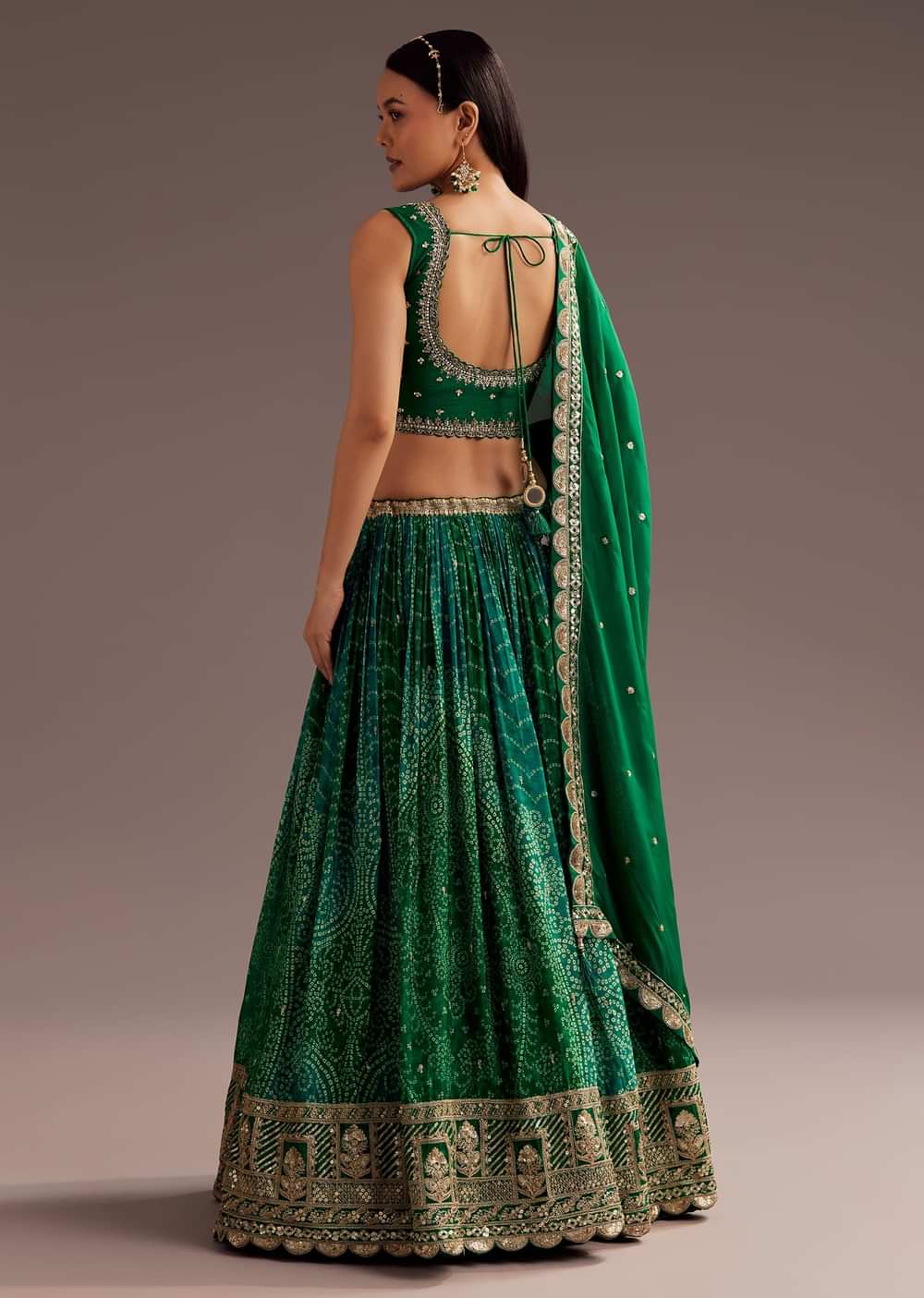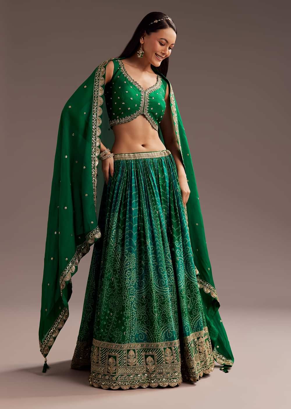 Embrace the joyous spirit of festivities with this vibrant green lehenga set. The choli shimmers with sequins work, beautifully complemented by a traditional bandhani lehenga adorned with zari and sequins border. Paired with a lightweight organza dupatta, delicately embellished with sequins, this ensemble is perfect for haldi or mehendi celebrations filled with color and joy.