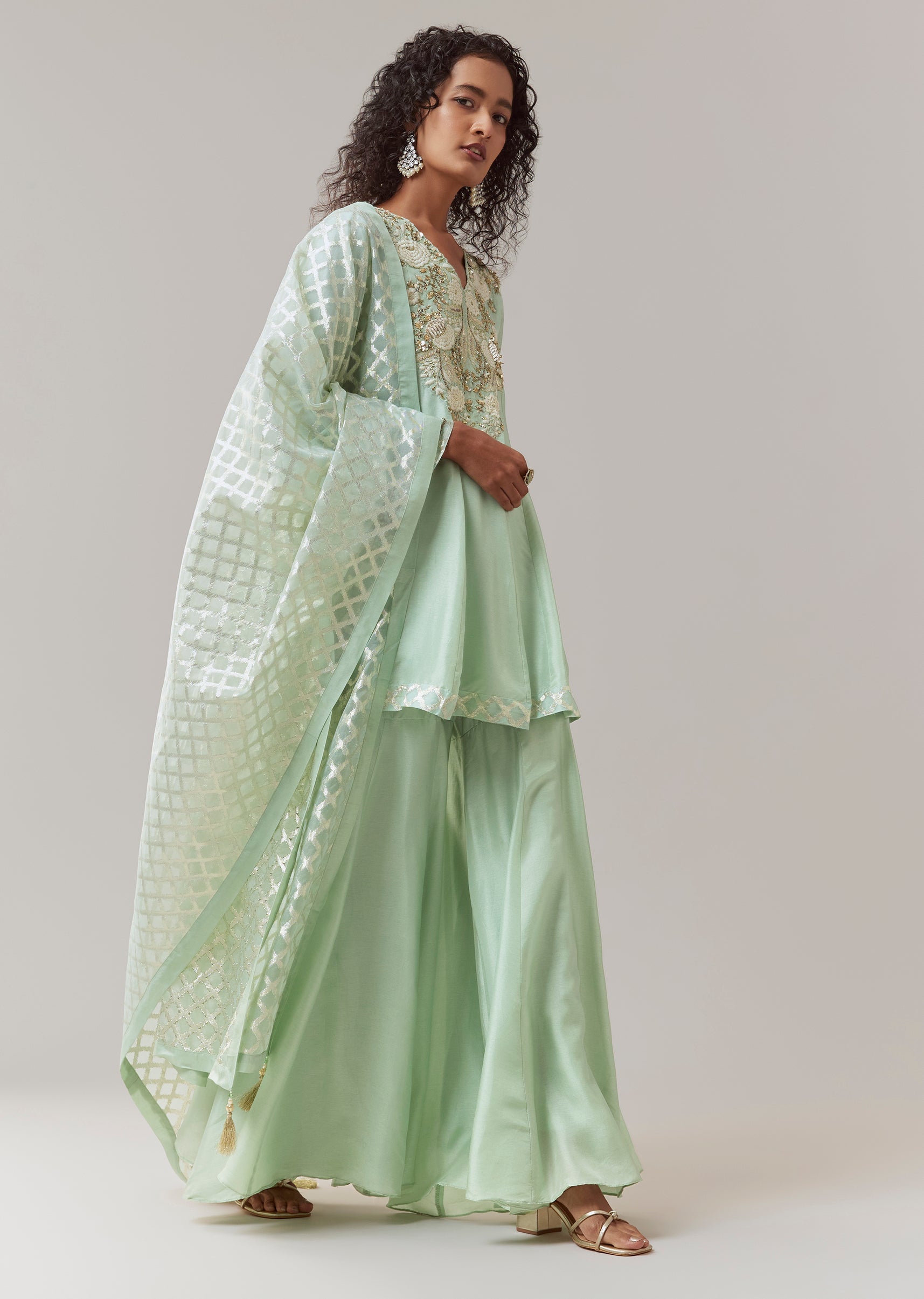 Green Silk Embroidered Kurta Sharara Set