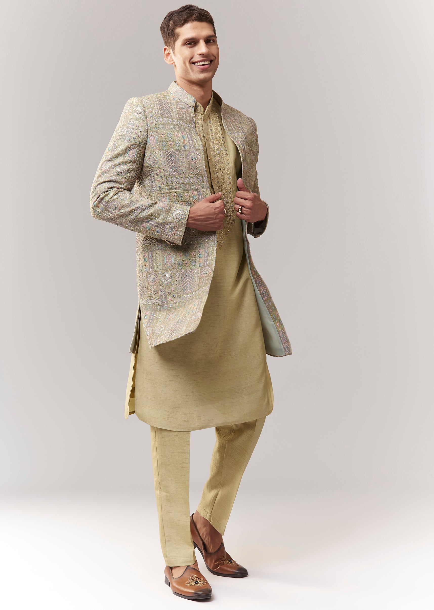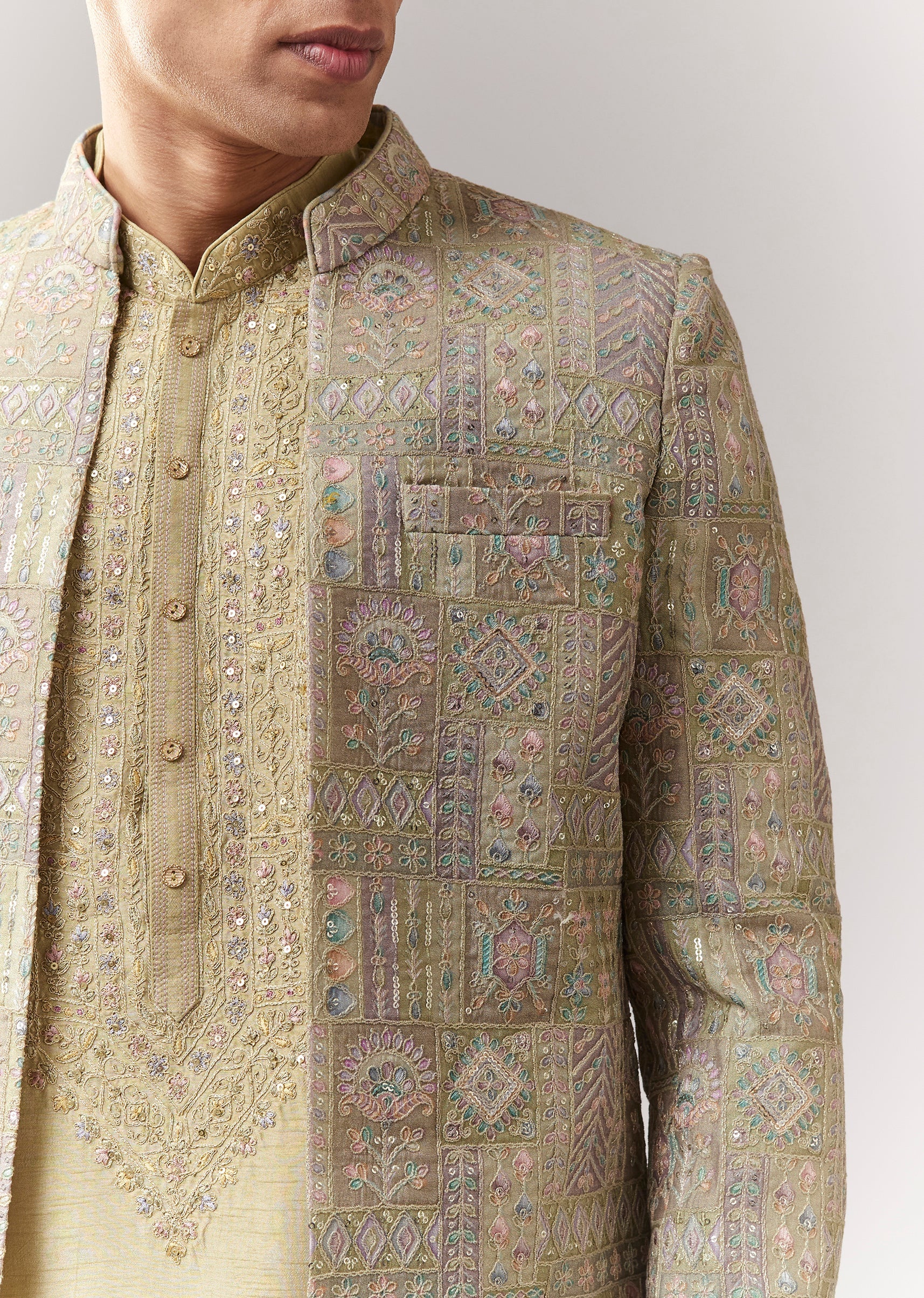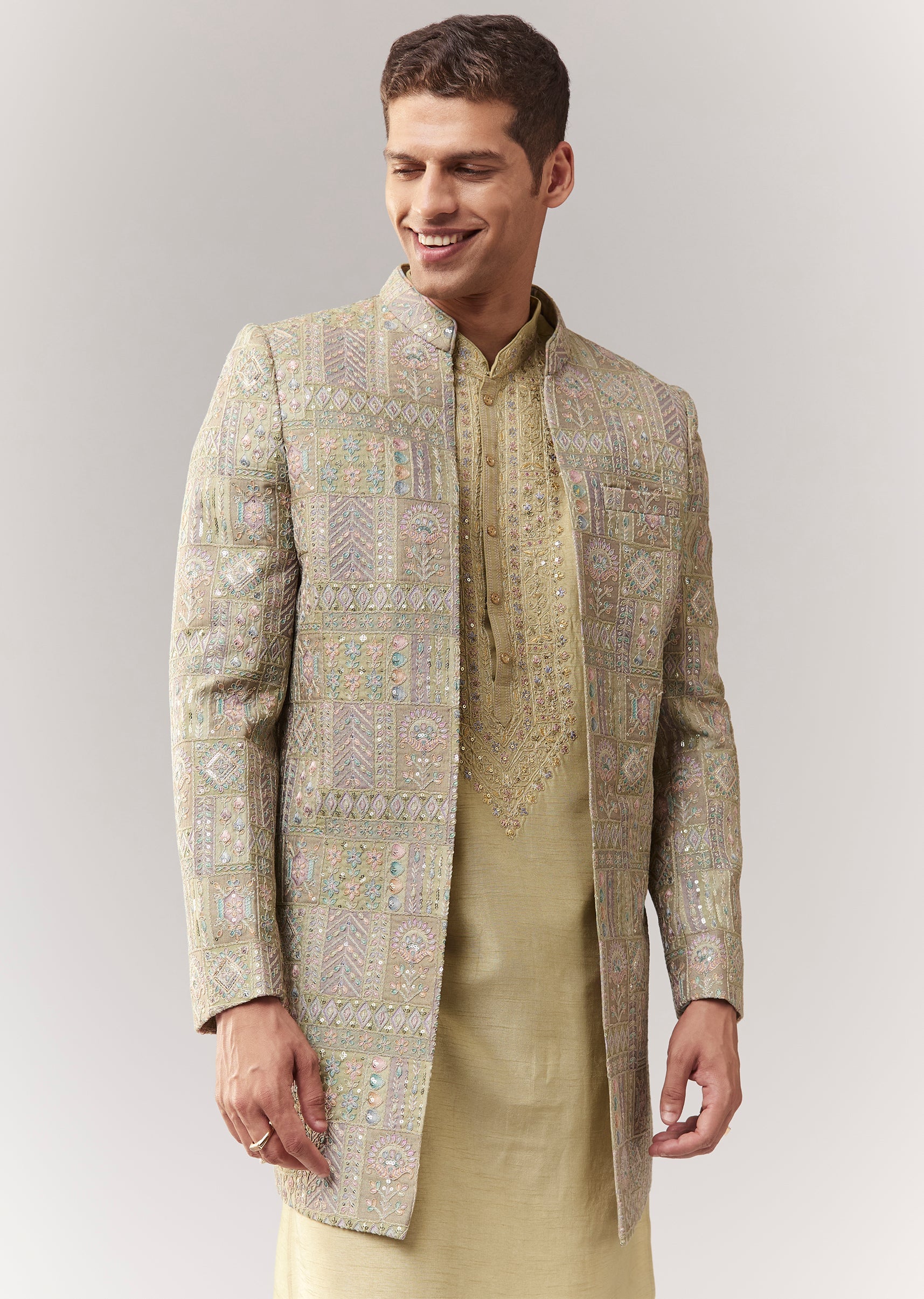 A festive green silk indo-western featuring sequin and thread/resham detailing. Mandarin collar, full sleeves, with front buttons and hook-eye fastening. Includes indo-western kurta/jacket styling with straight pants (mid-waist). Ideal for wedding, engagement, and mehendi for groomsmen. Awarded as the Most Trusted Brand, we're delivering styles you love, just as promised.