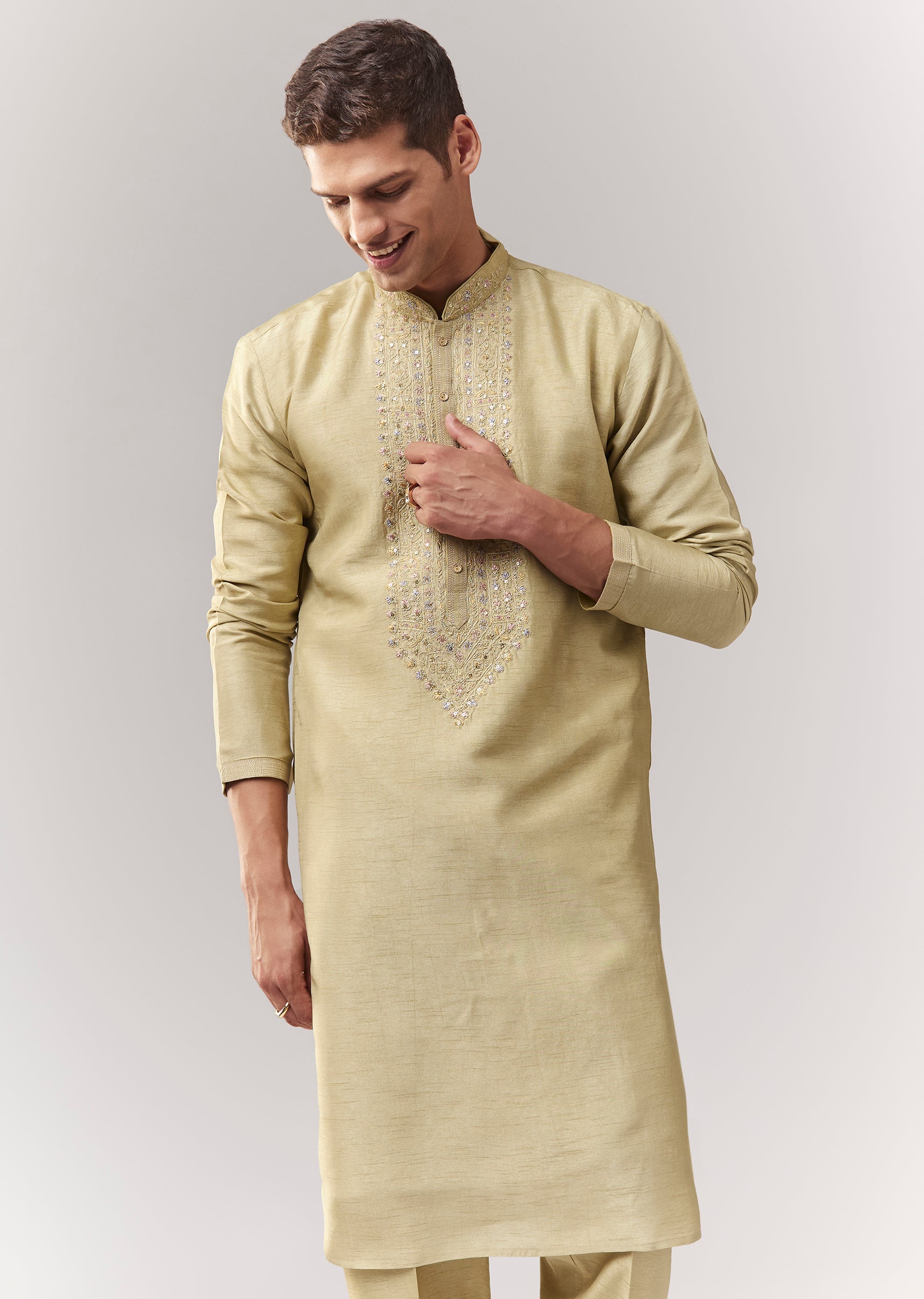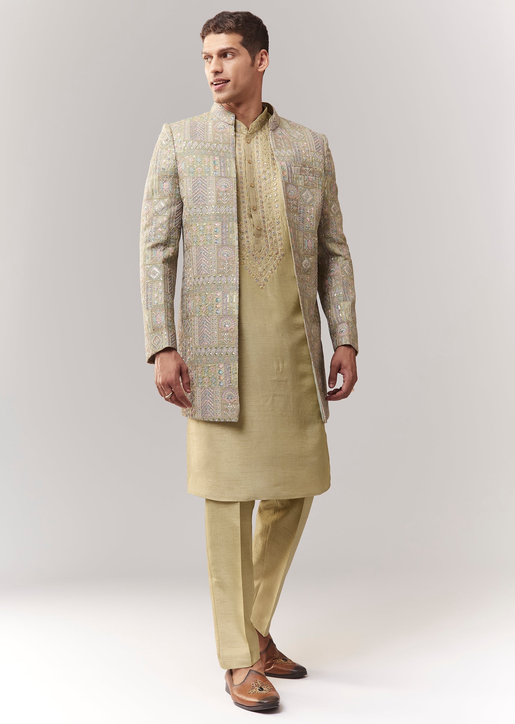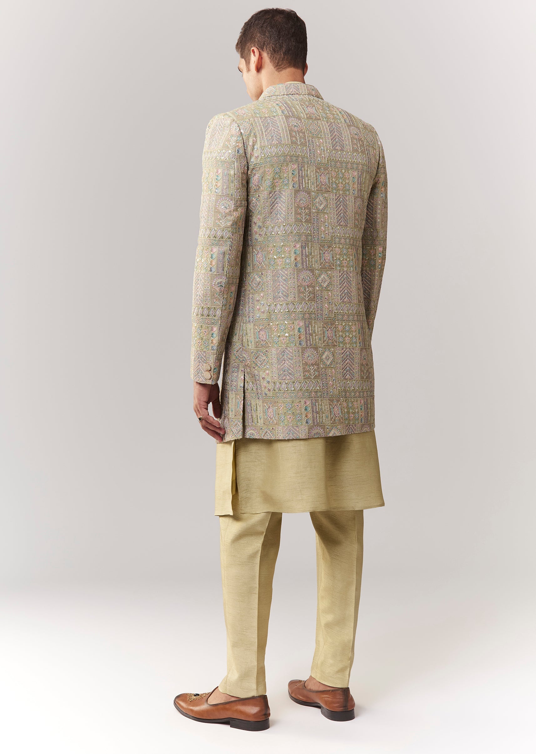 A festive green silk indo-western featuring sequin and thread/resham detailing. Mandarin collar, full sleeves, with front buttons and hook-eye fastening. Includes indo-western kurta/jacket styling with straight pants (mid-waist). Ideal for wedding, engagement, and mehendi for groomsmen. Awarded as the Most Trusted Brand, we're delivering styles you love, just as promised.