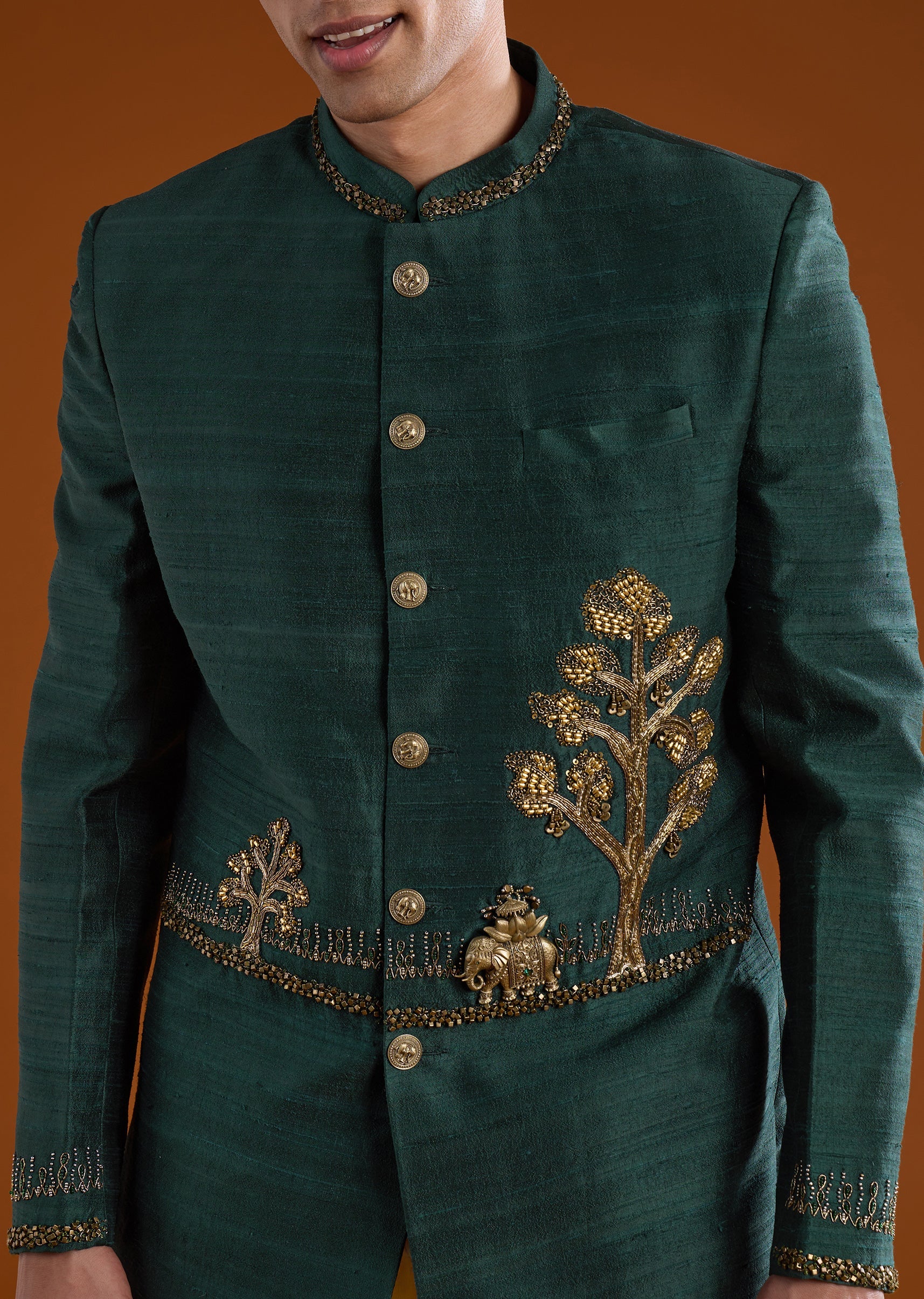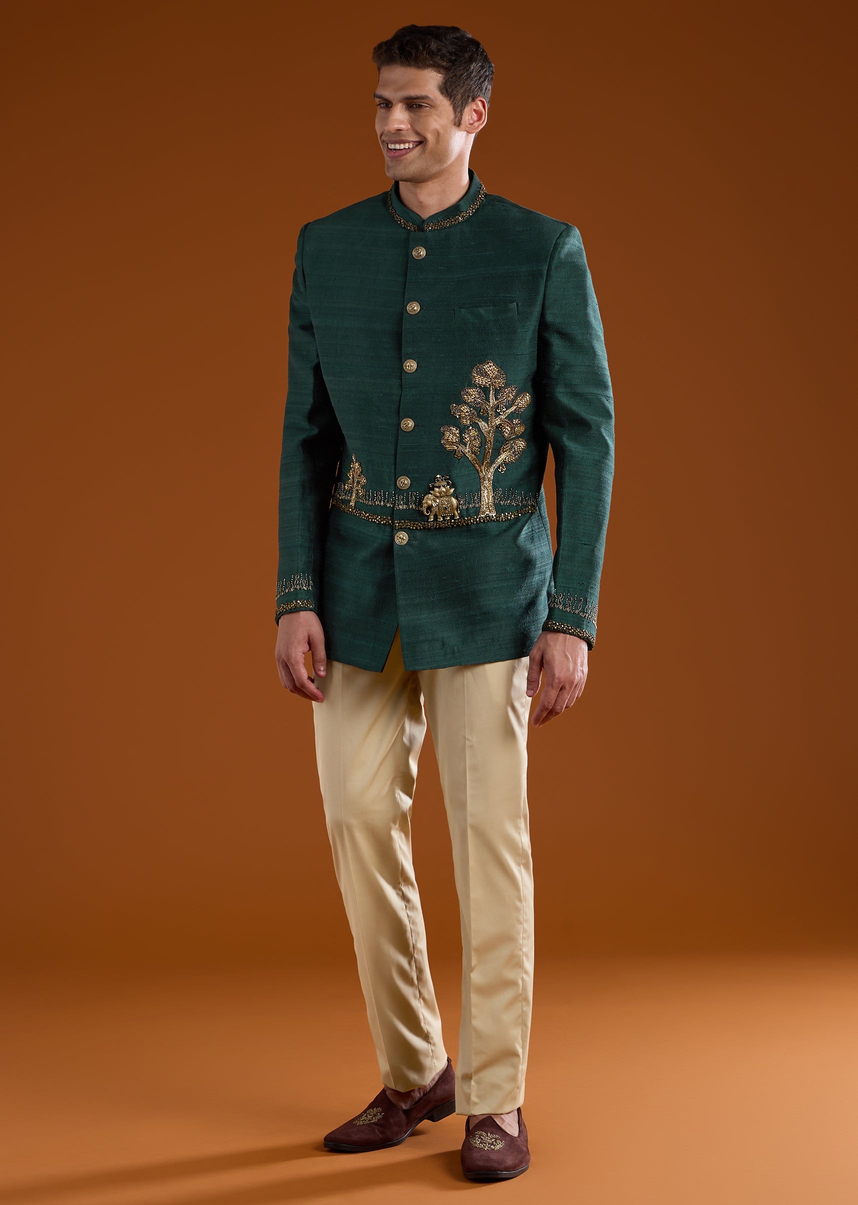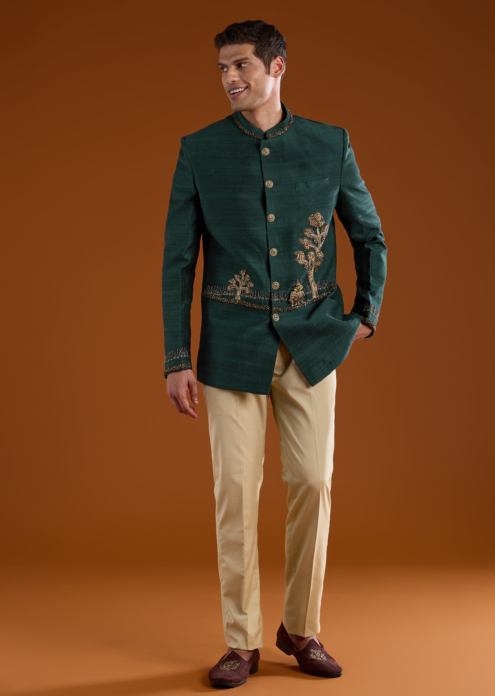 Marked by rich detailing and regal presence, this silk and raw silk jodhpuri pants set is crafted for elevated traditional dressing. The ensemble is adorned with intricate zari work, complemented by bead, stone, and metal embellishments that add depth and a refined festive sheen. Full sleeves and a mandarin collar create a strong, structured silhouette rooted in classic jodhpuri style. Ideal for weddings, festive ceremonies, and formal cultural occasions where sophistication takes center stage.Awarded as the Most Trusted Brand, we're delivering styles you love, just as promised.