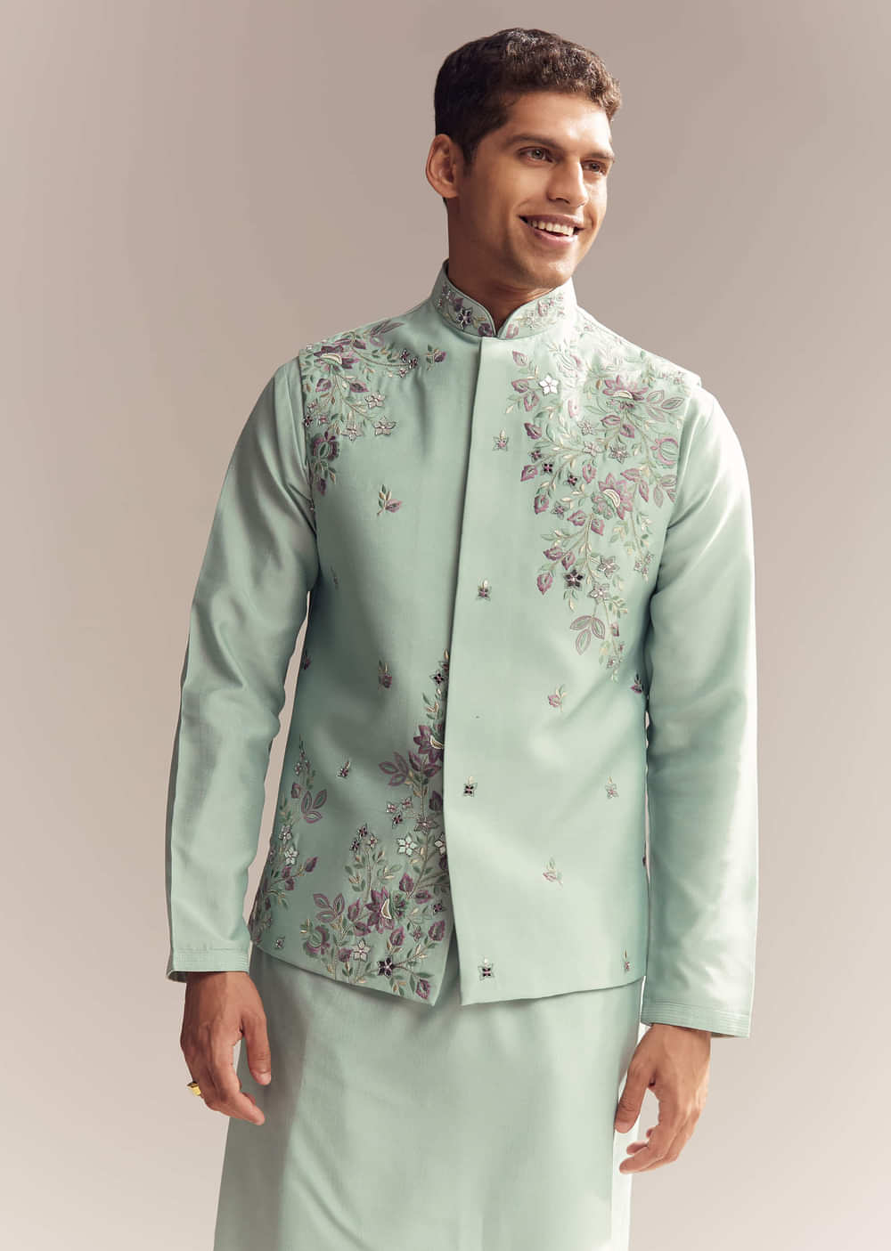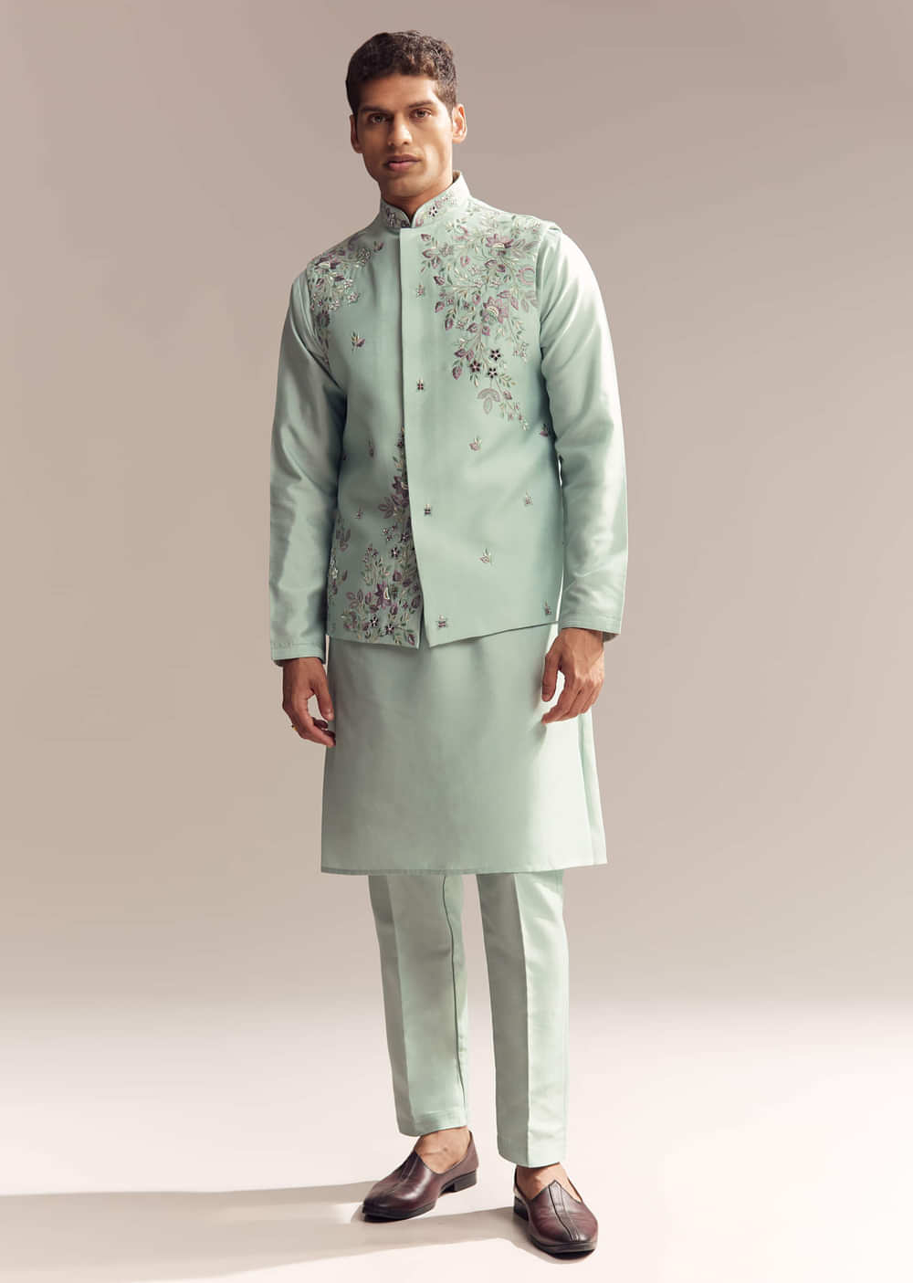 Wedding guests will love this green silk kurta jacket set for men finished with thread embroidery, mirror accents, and moti work. The fabric carries a rich sheen that photographs beautifully.... More Product Details