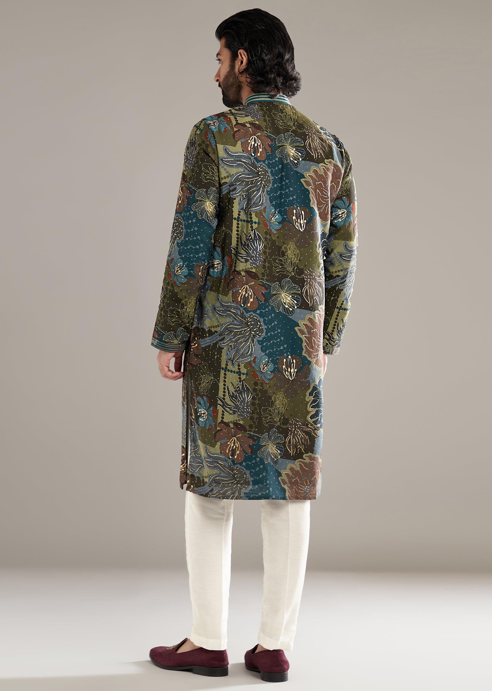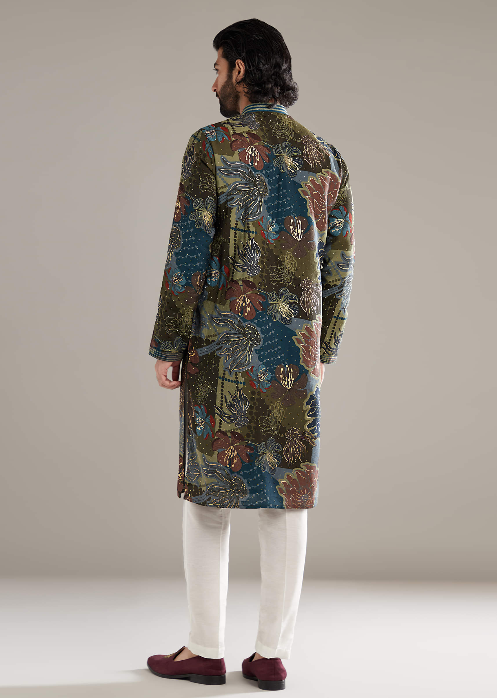 Green Silk Kurta Set For Men With Floral And Foil Print