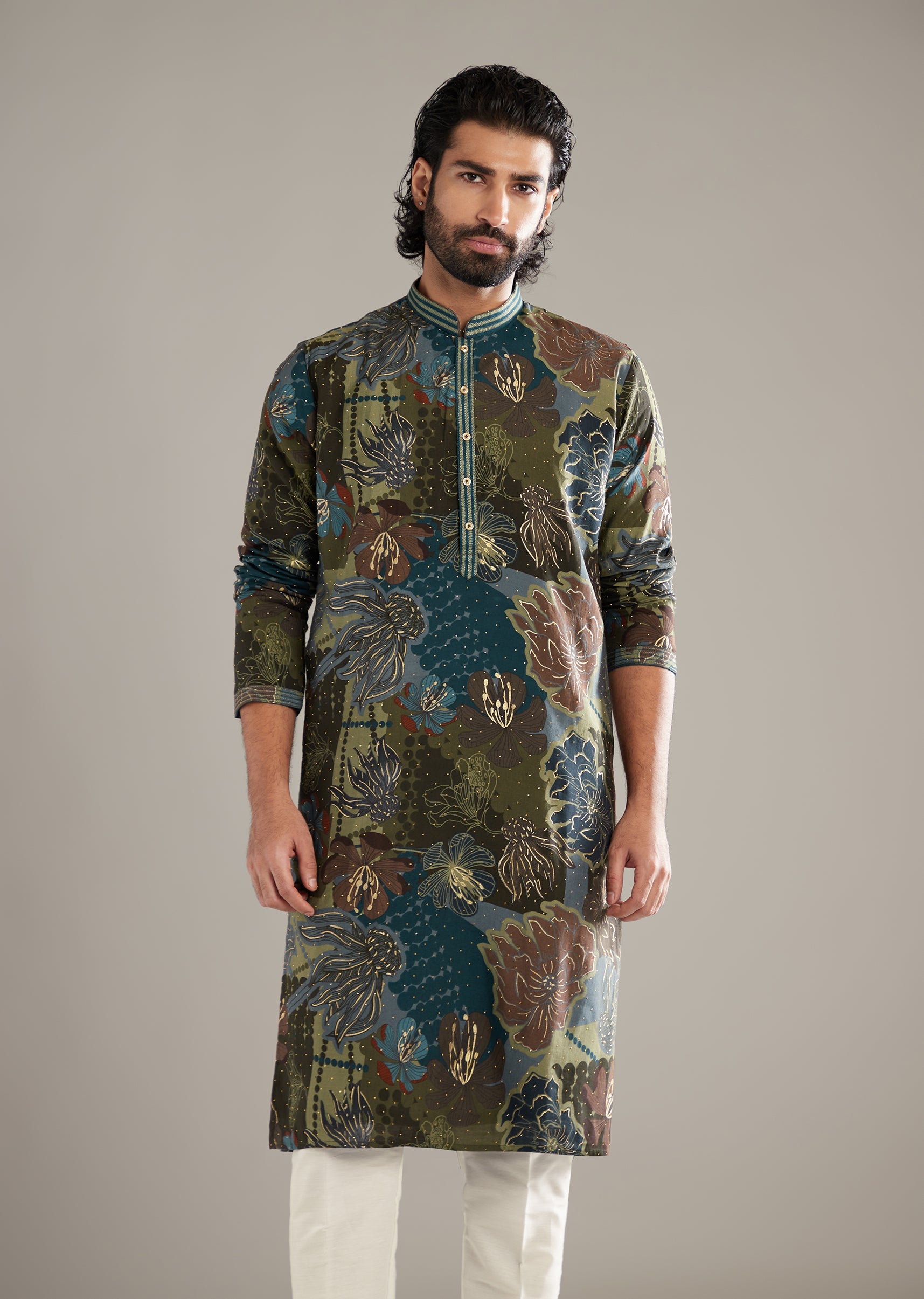 A sleek edge comes through in this green art silk men’s kurta set, with floral print lifted by foil and light stone touches that catch just the right amount of... More Product Details