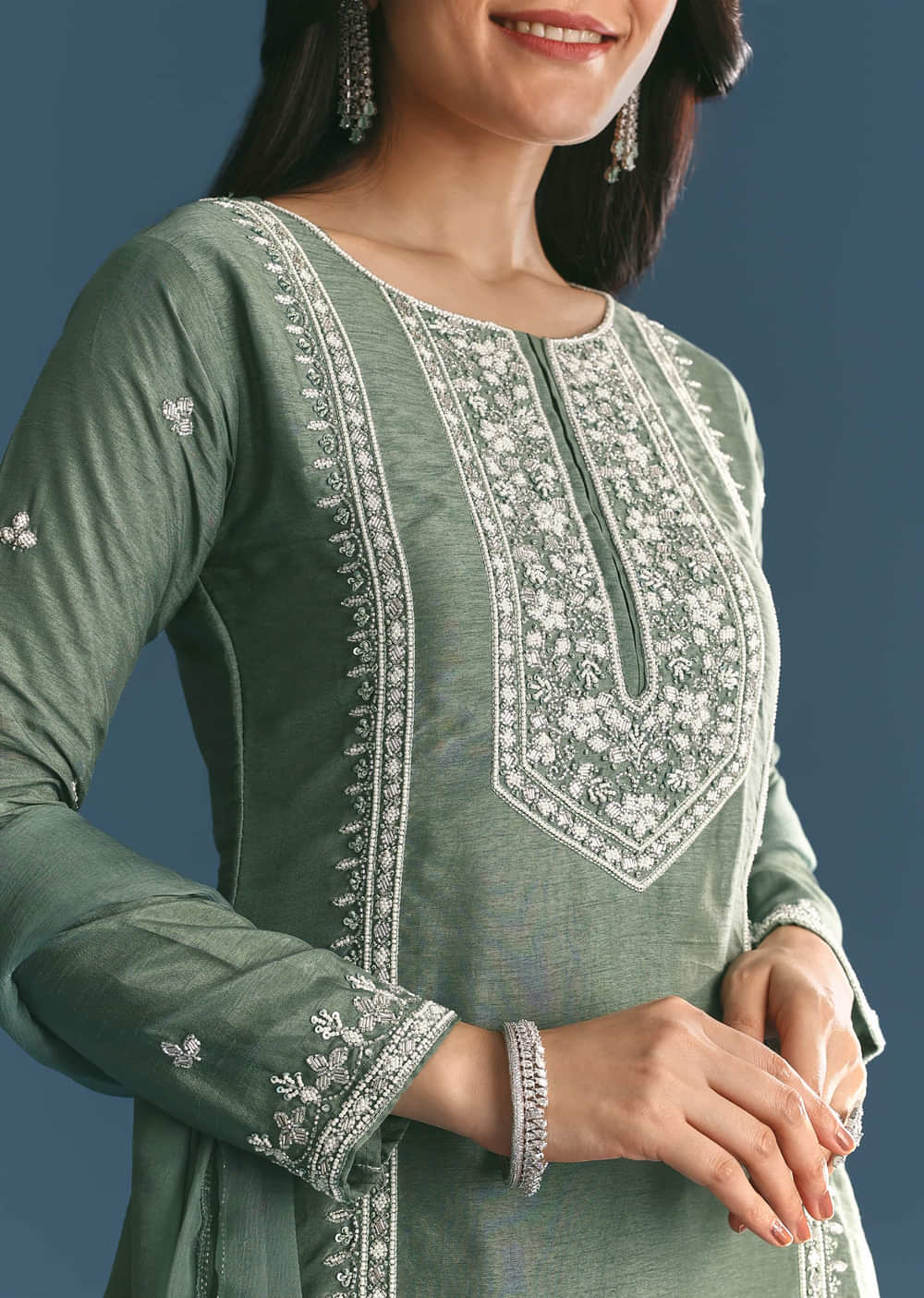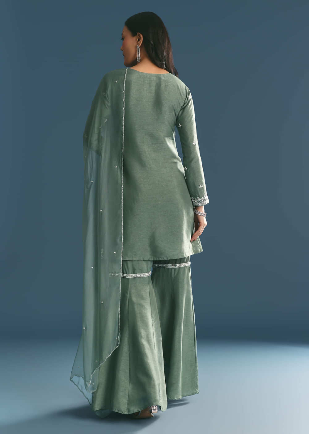 Green Silk Kurta Set With Moti And Cutdana Sharara