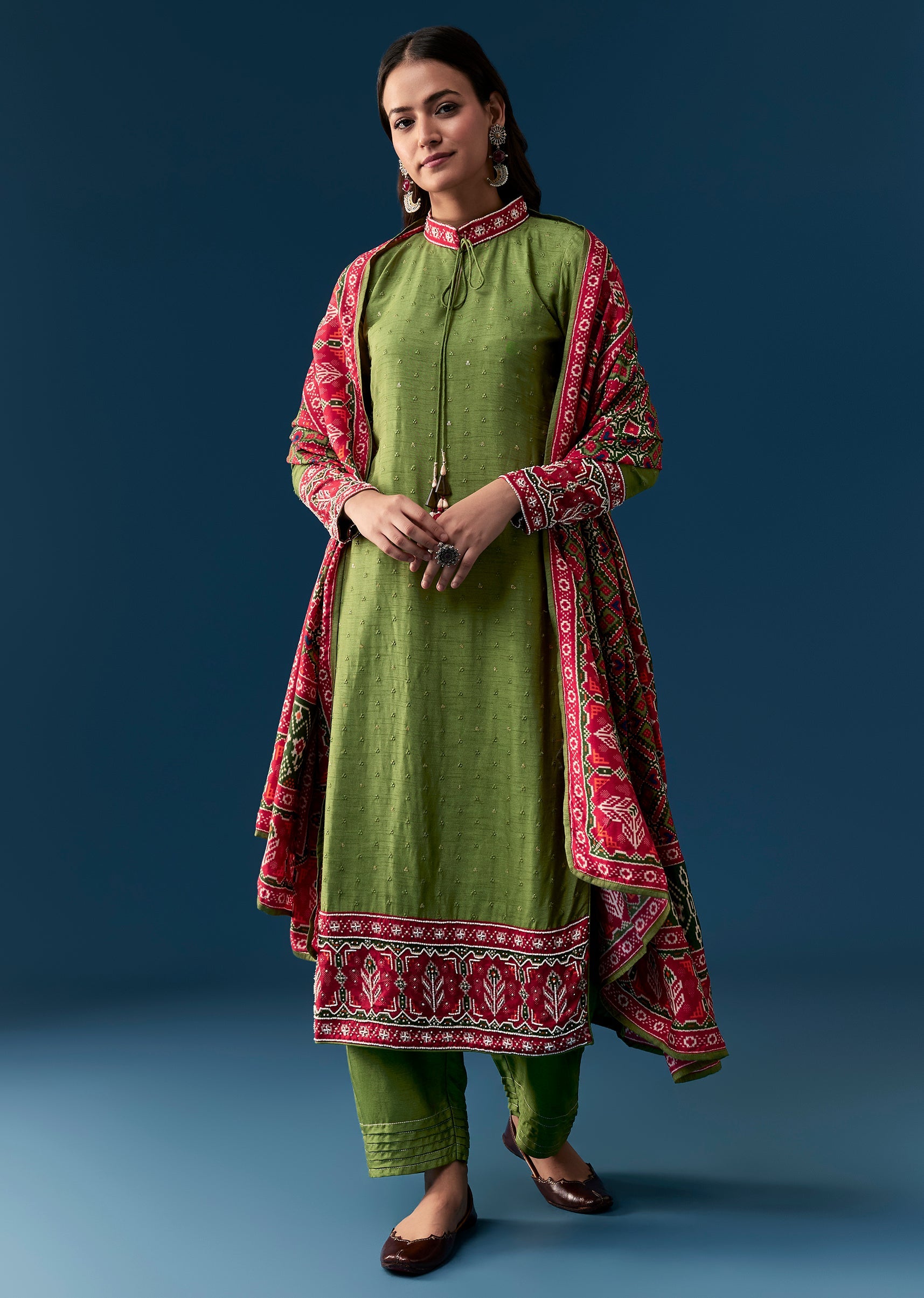 A serene blend of comfort and elegance this green silk kurta set is designed in a straight casual silhouette adorned with delicate resham butti and cut dana work. The full... More Product Details