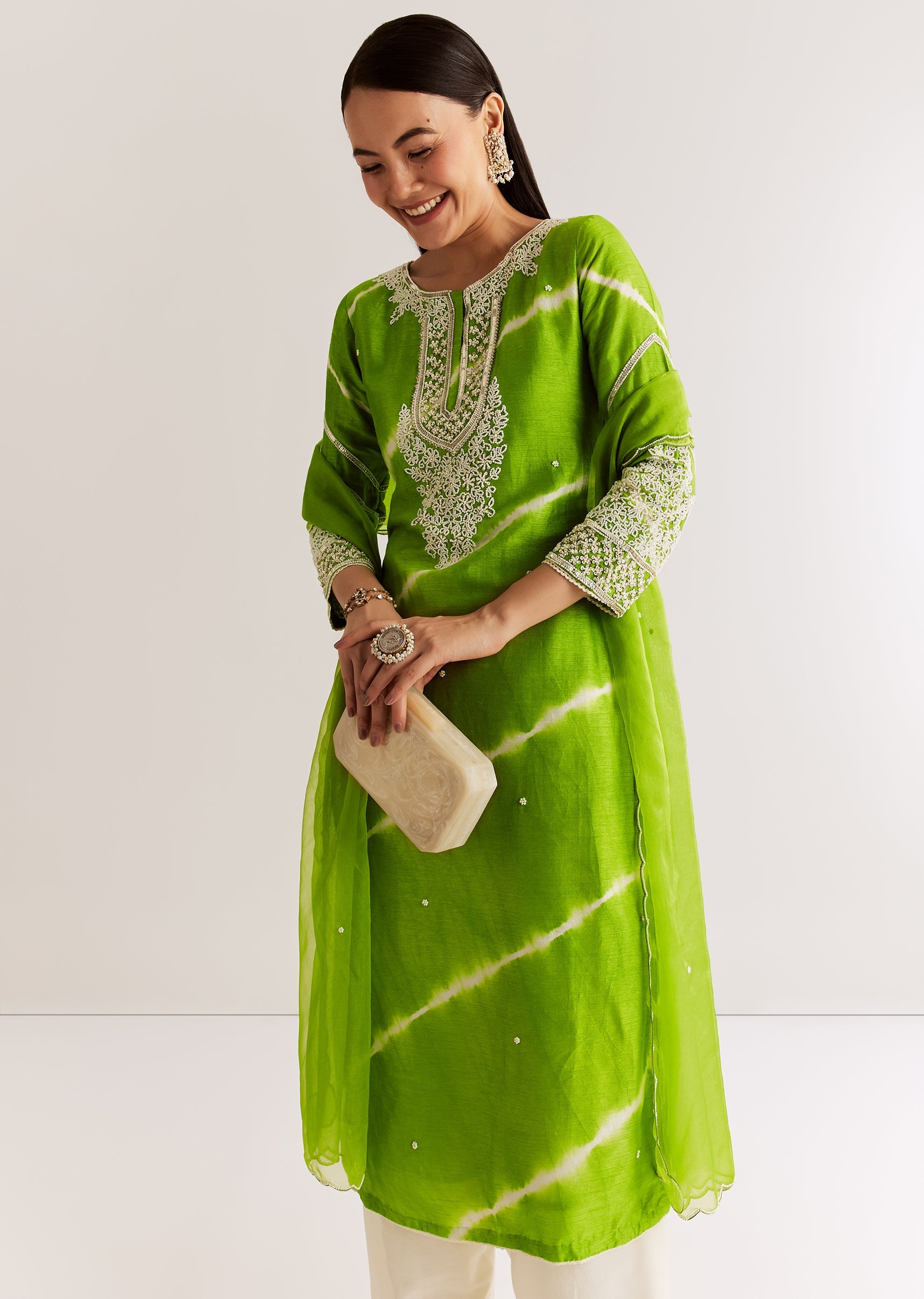 Traditional yet lively, this green silk leheriya kurta is accentuated with delicate moti work and paired with a lightweight organza dupatta that echoes the same detailing. Awarded as the Most... More Product Details
