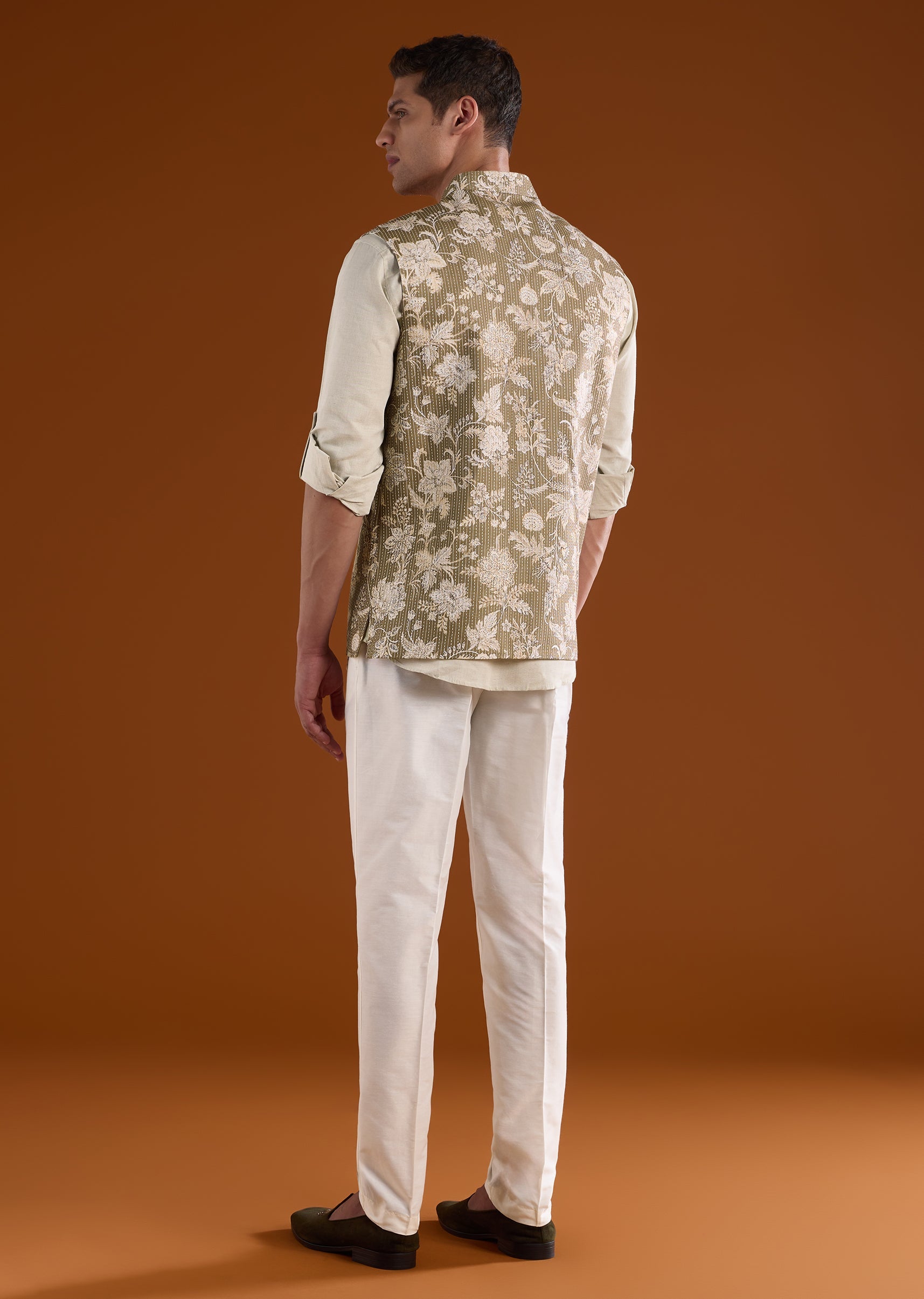 Green Silk Mens Kurta Jacket Set With Floral Pattern