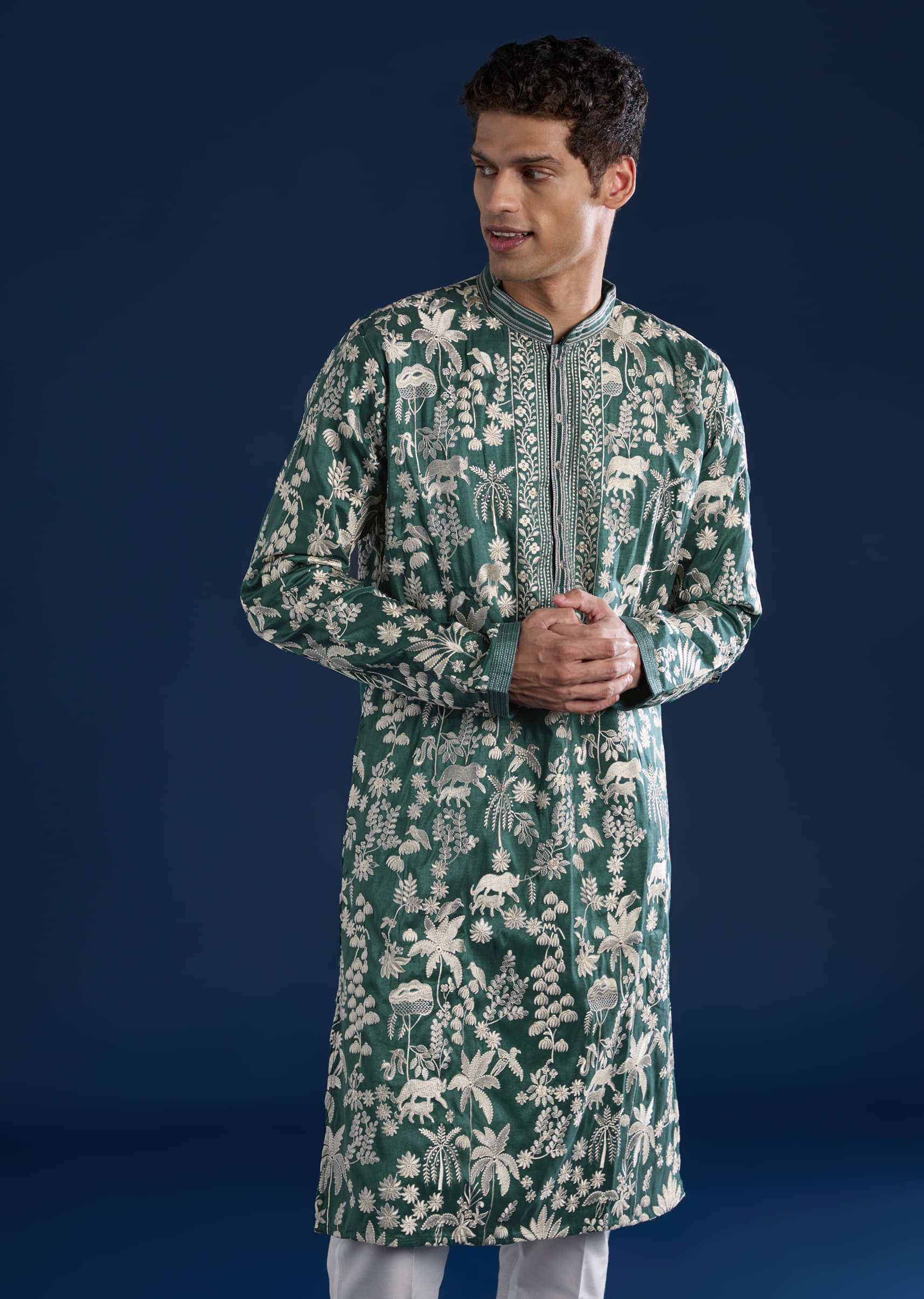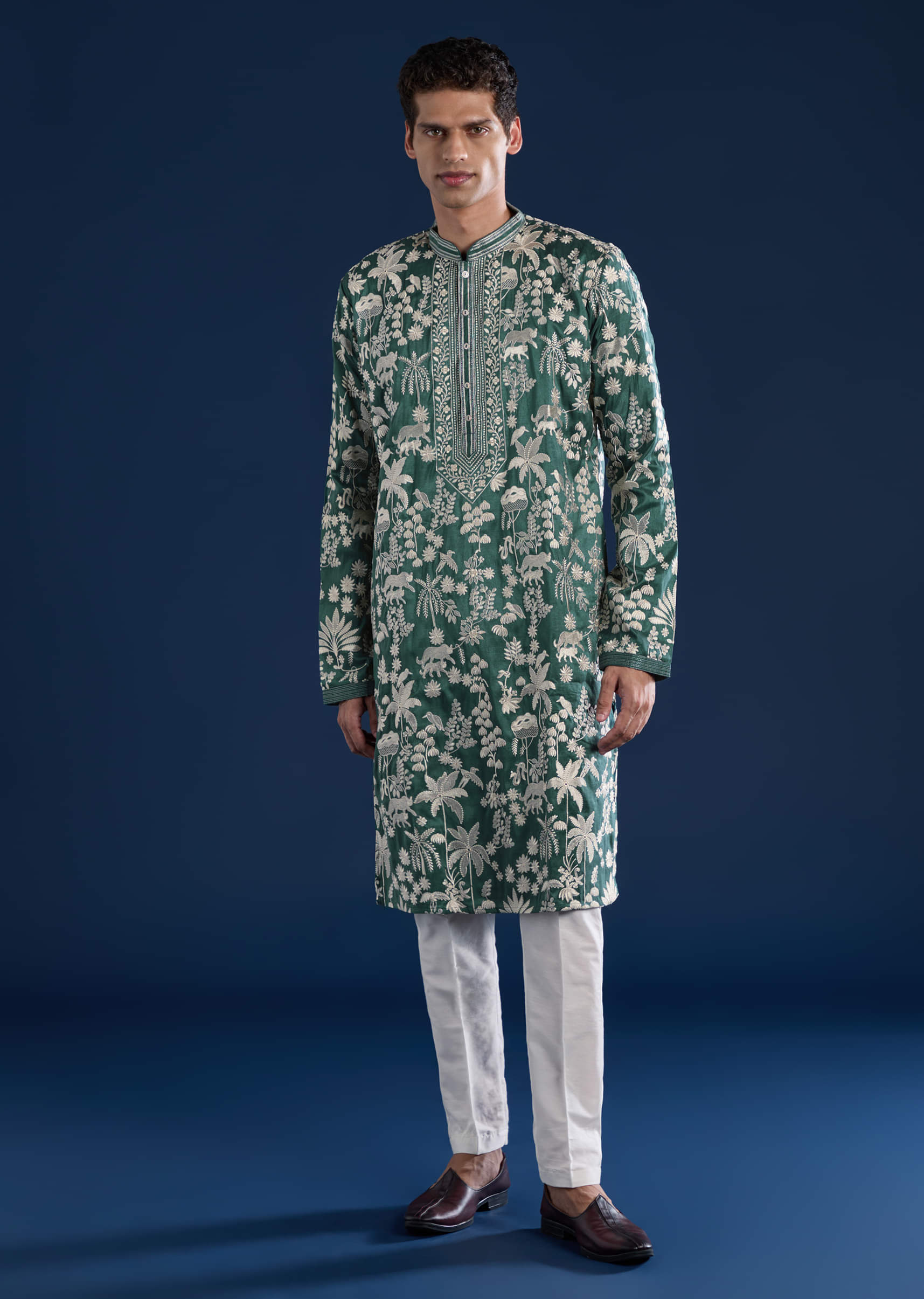 Fit Tips:Opt for a tailored fit through the shoulders and chest to highlight the kurta’s structured silhouette and detailed mirror work.