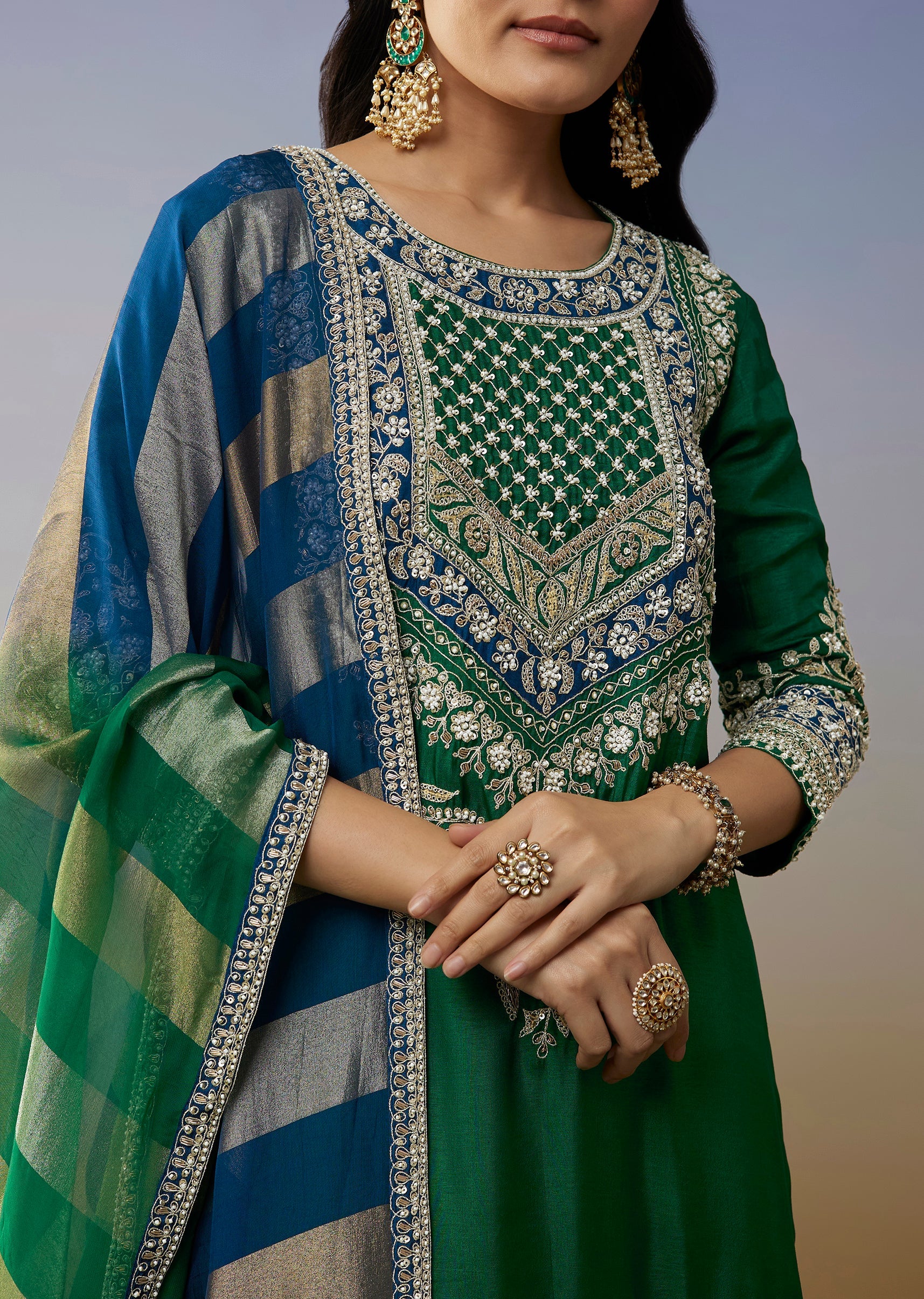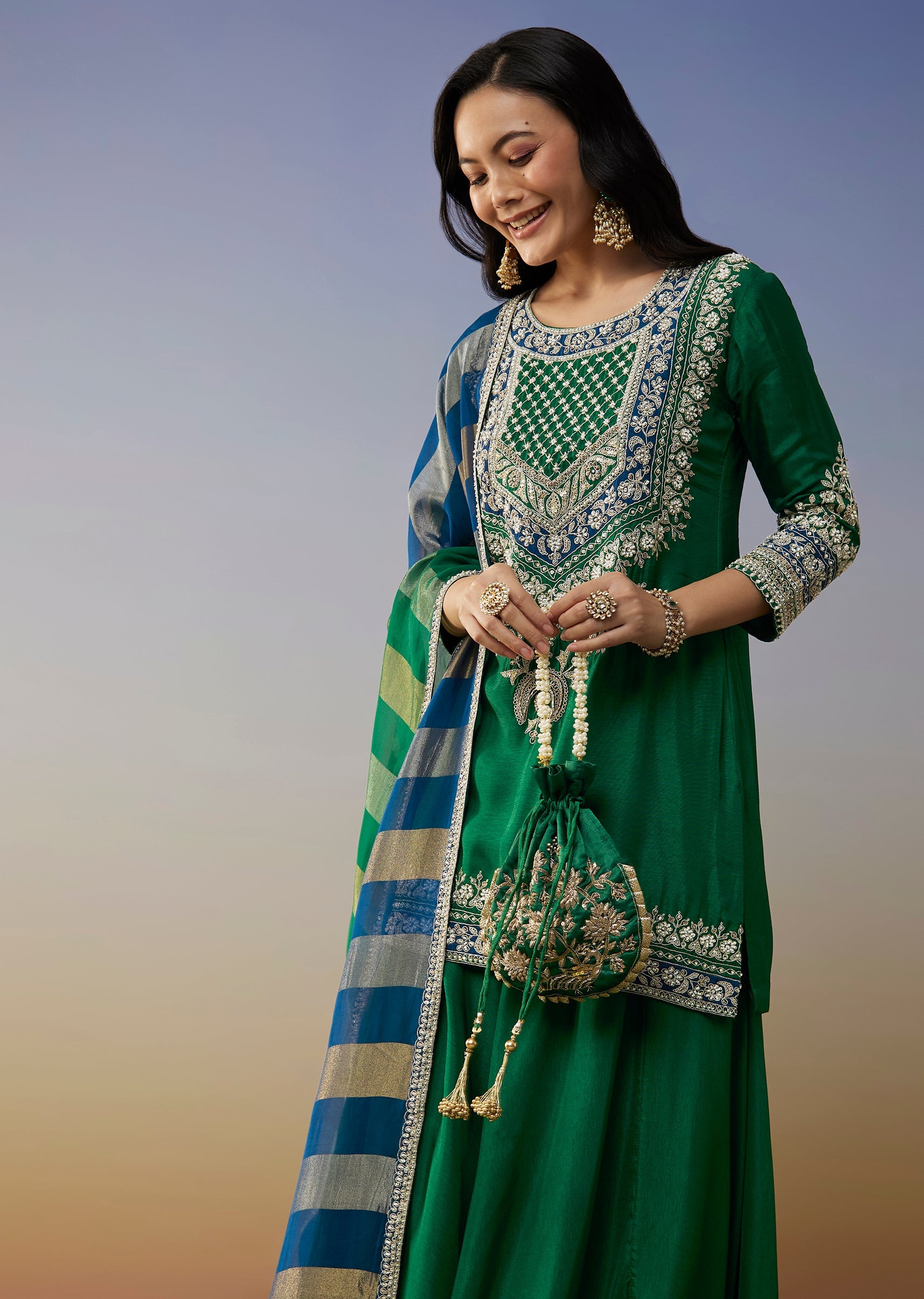 Green Silk Palazzo Suits with Moti Zardosi Work