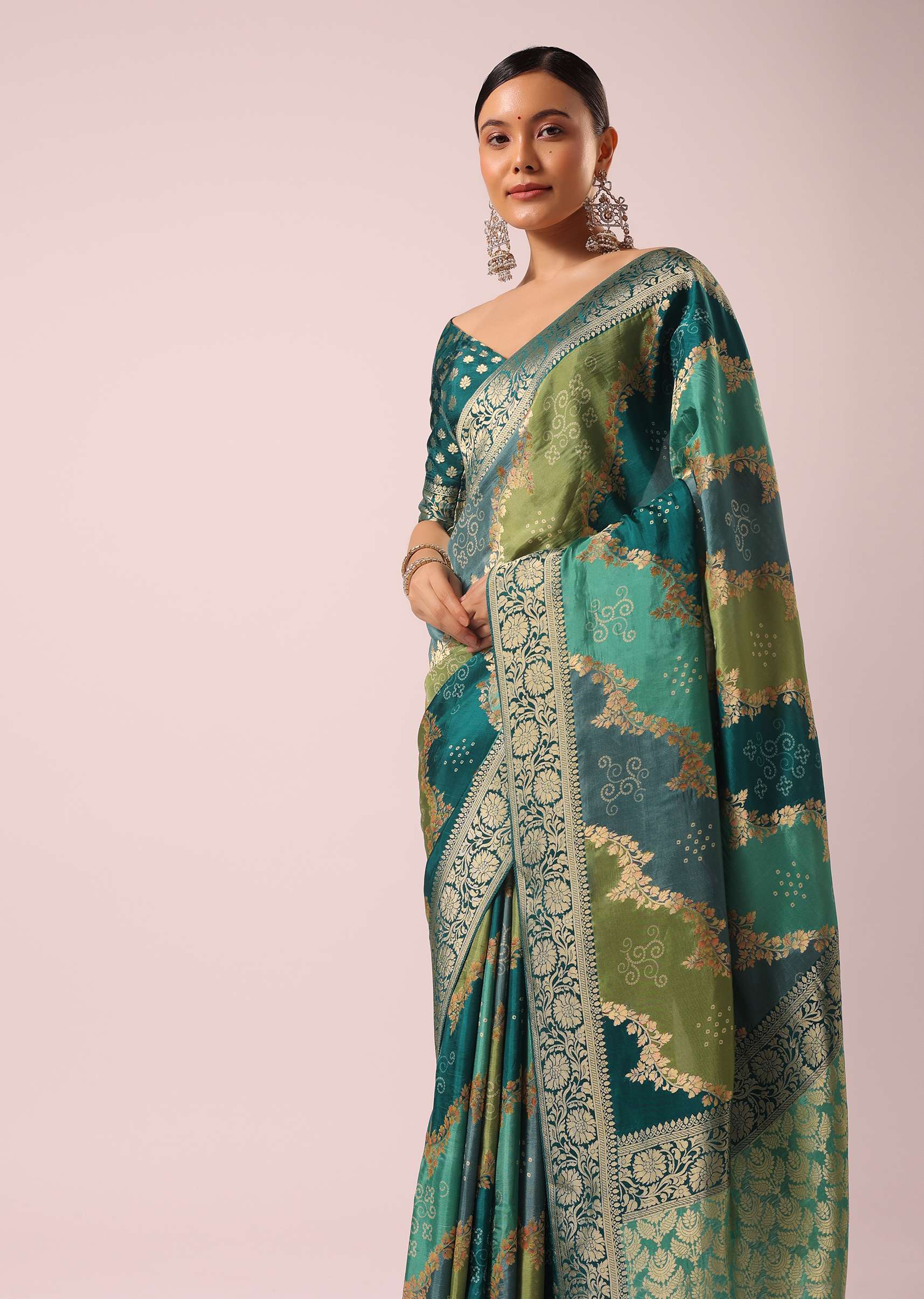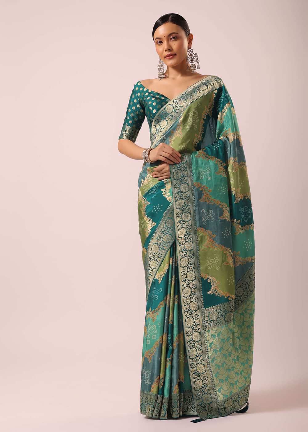 Presenting our exquisite green dola silk saree for the modern Indian woman. The saree comes with an unstitched blouse piece. It's richly crafted using traditional embroidery along with all-over bandhani buttis making it ideal for special occasions. The multi-color brocade weave detailing flaunts its captivating charm. The blouse worn by the model is designed for styling purposes. Awarded As The Most Trusted Brand We'Re Delivering Styles You Love Just As Promised.