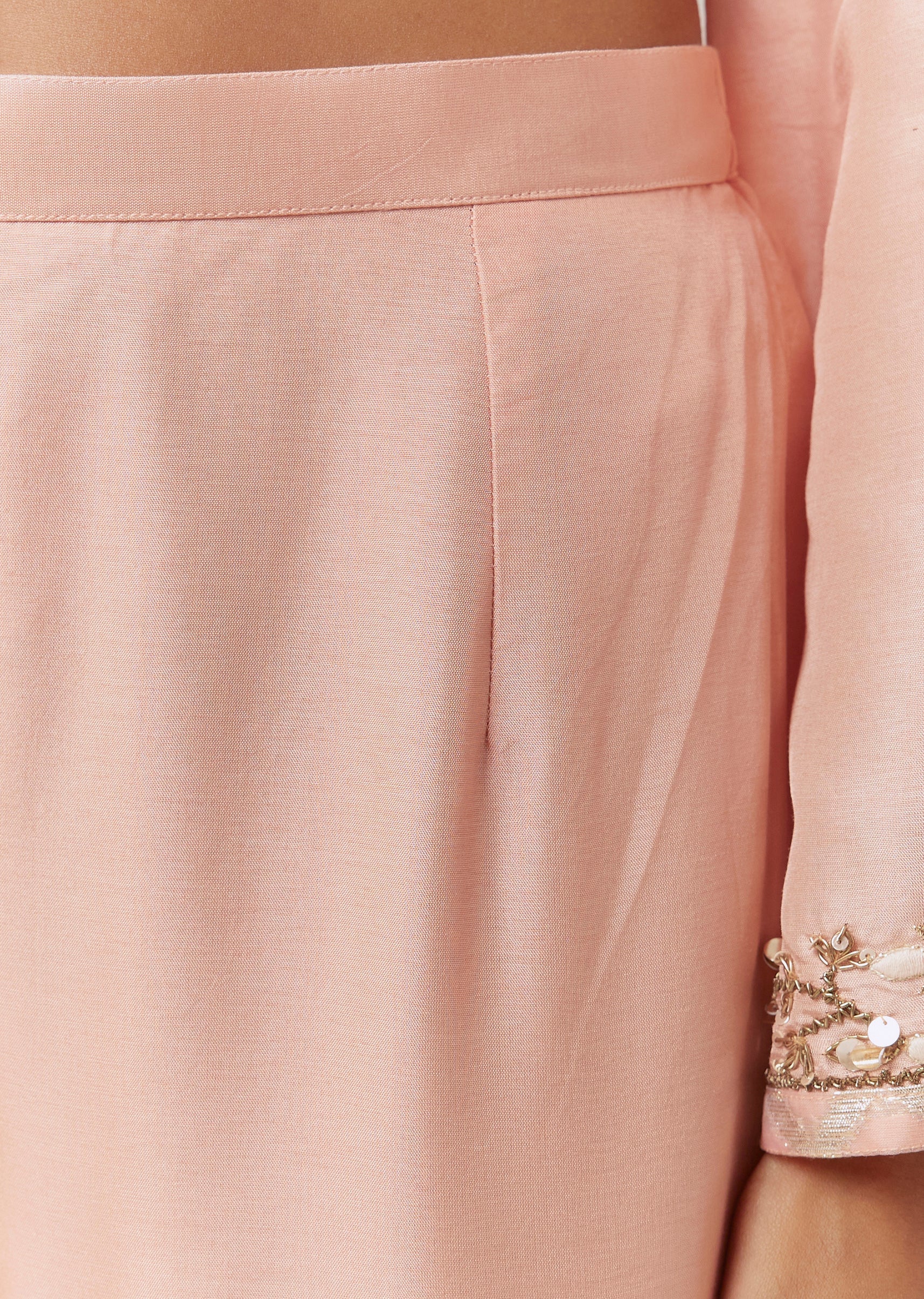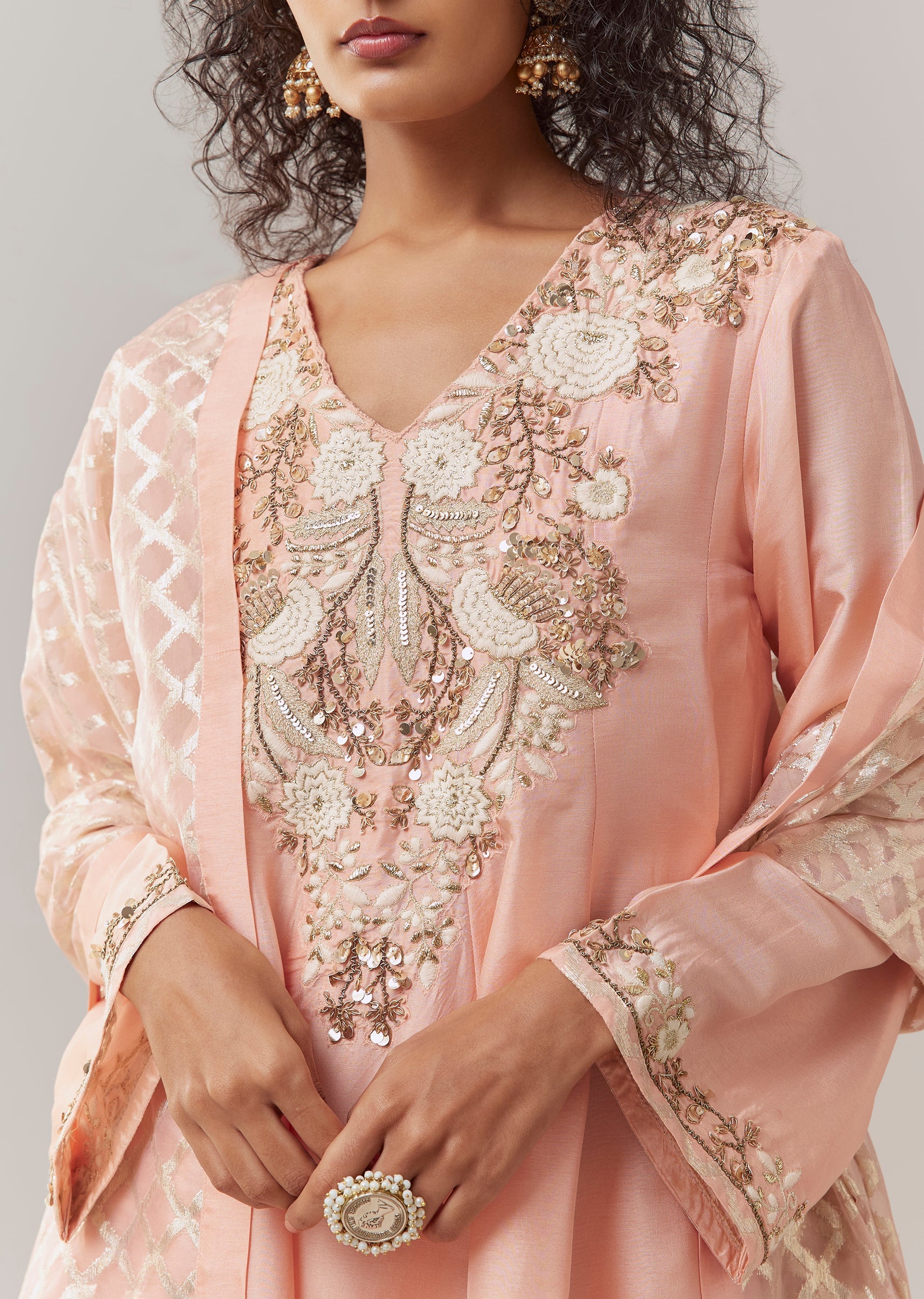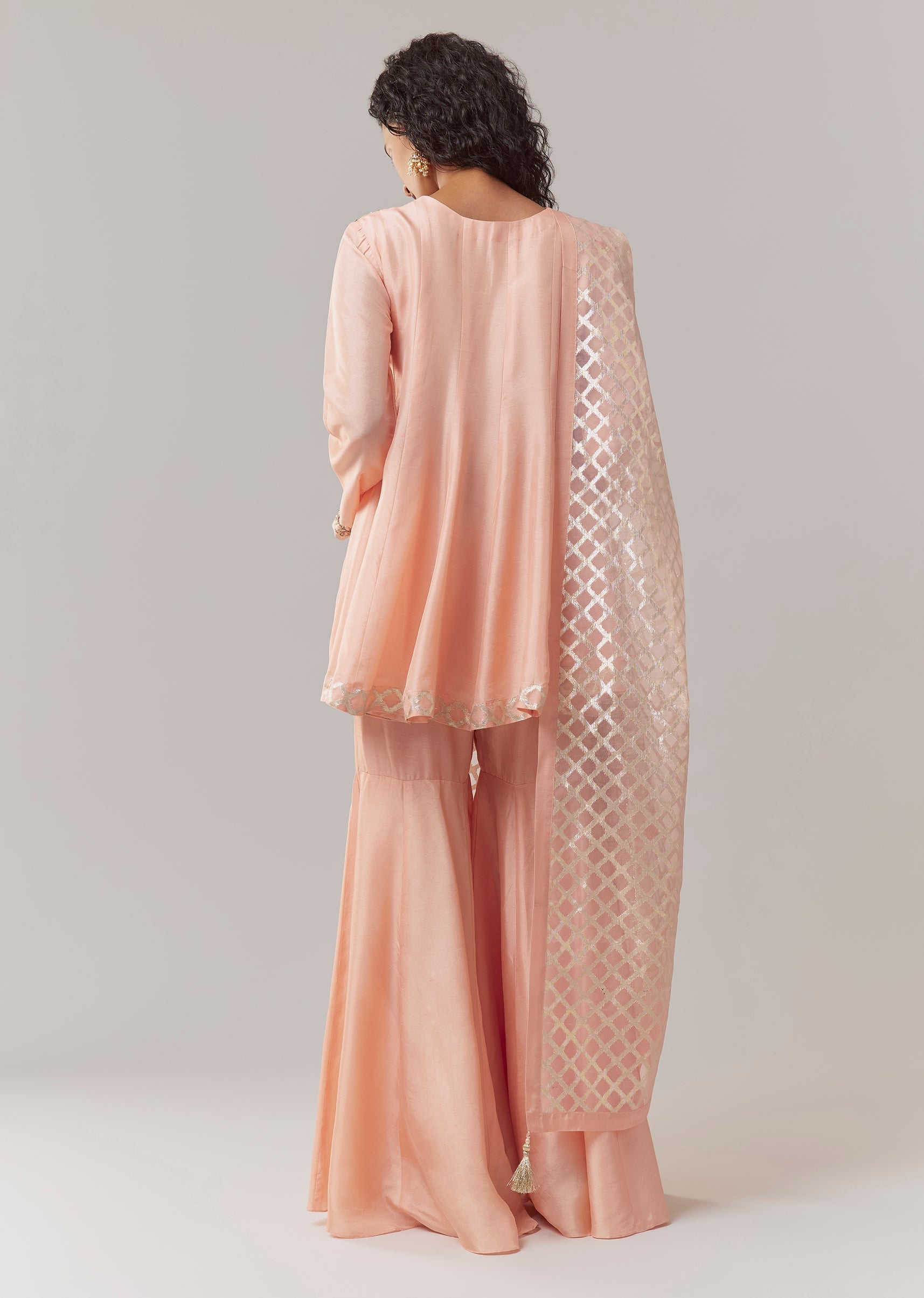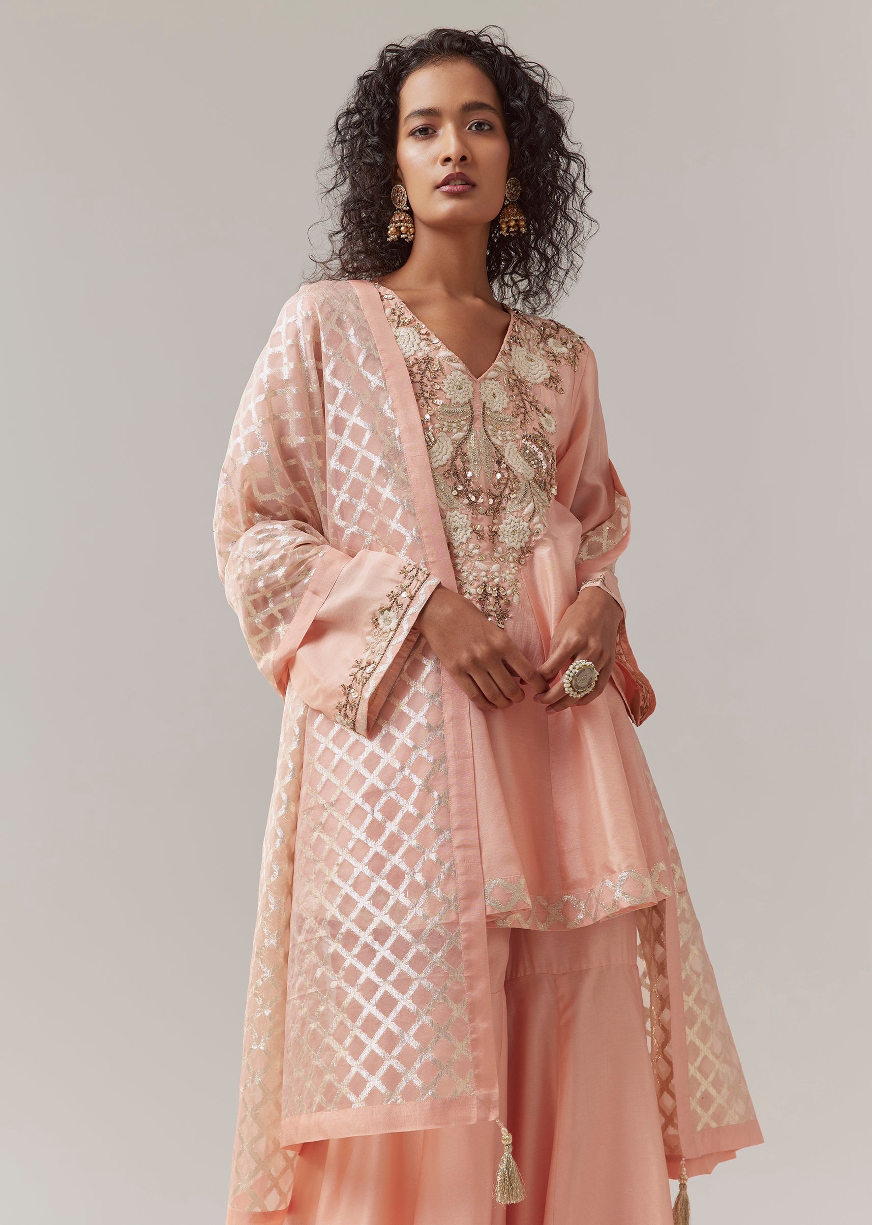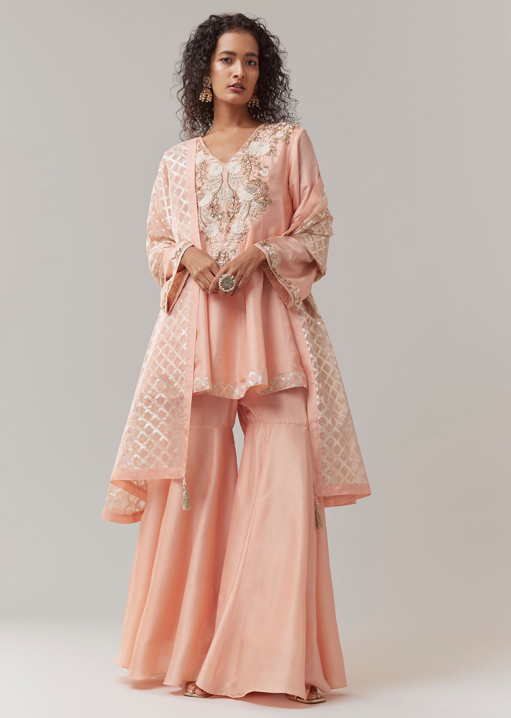 Soft, graceful, and full of charm, this pink thread and sequins work silk kurta sharara set brings a fresh festive mood. The embroidered V neck kurta with flared sleeves adds... More Product Details