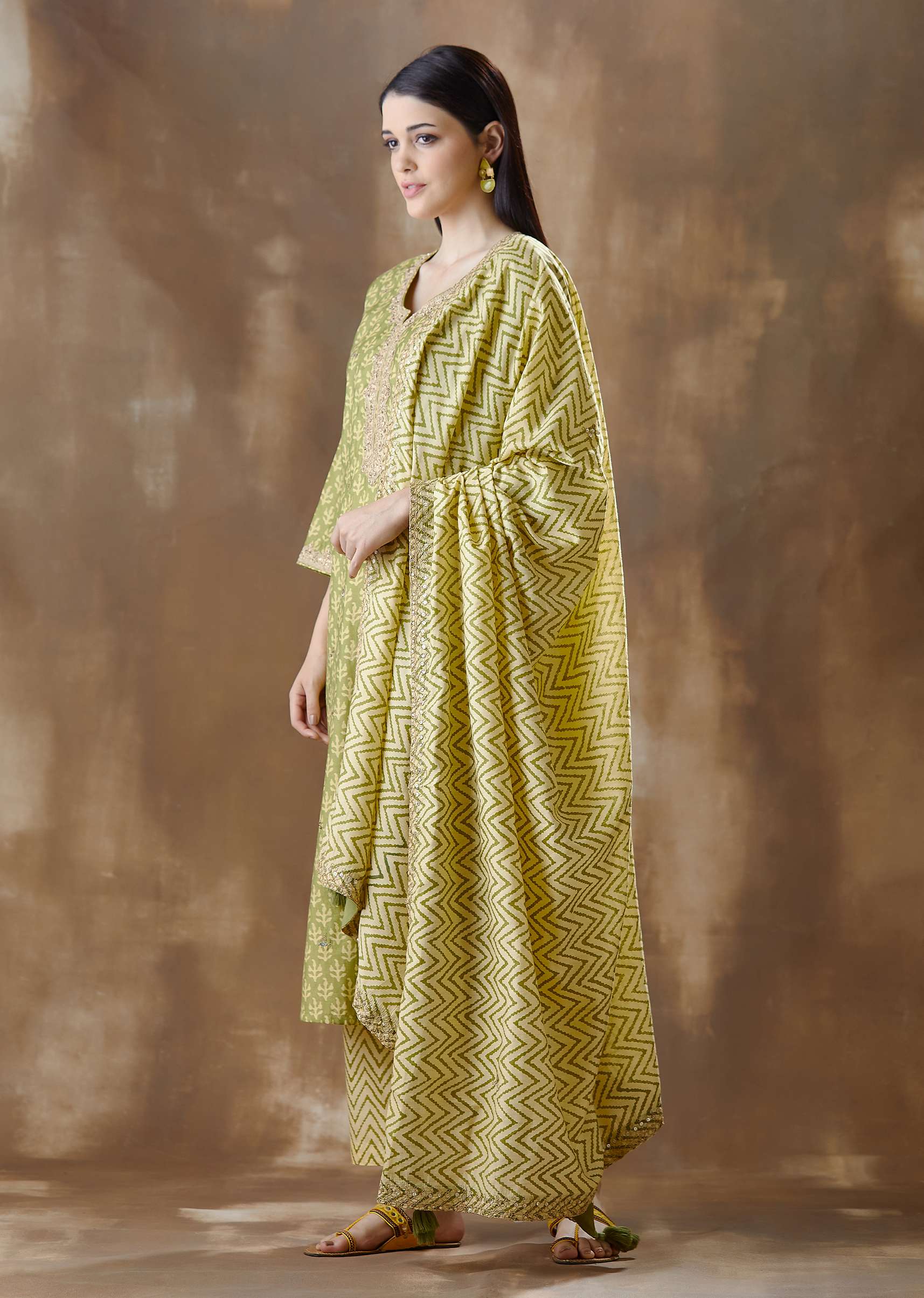 Green Straight Cut Suit In Silk With Print And Embroidered Neckline