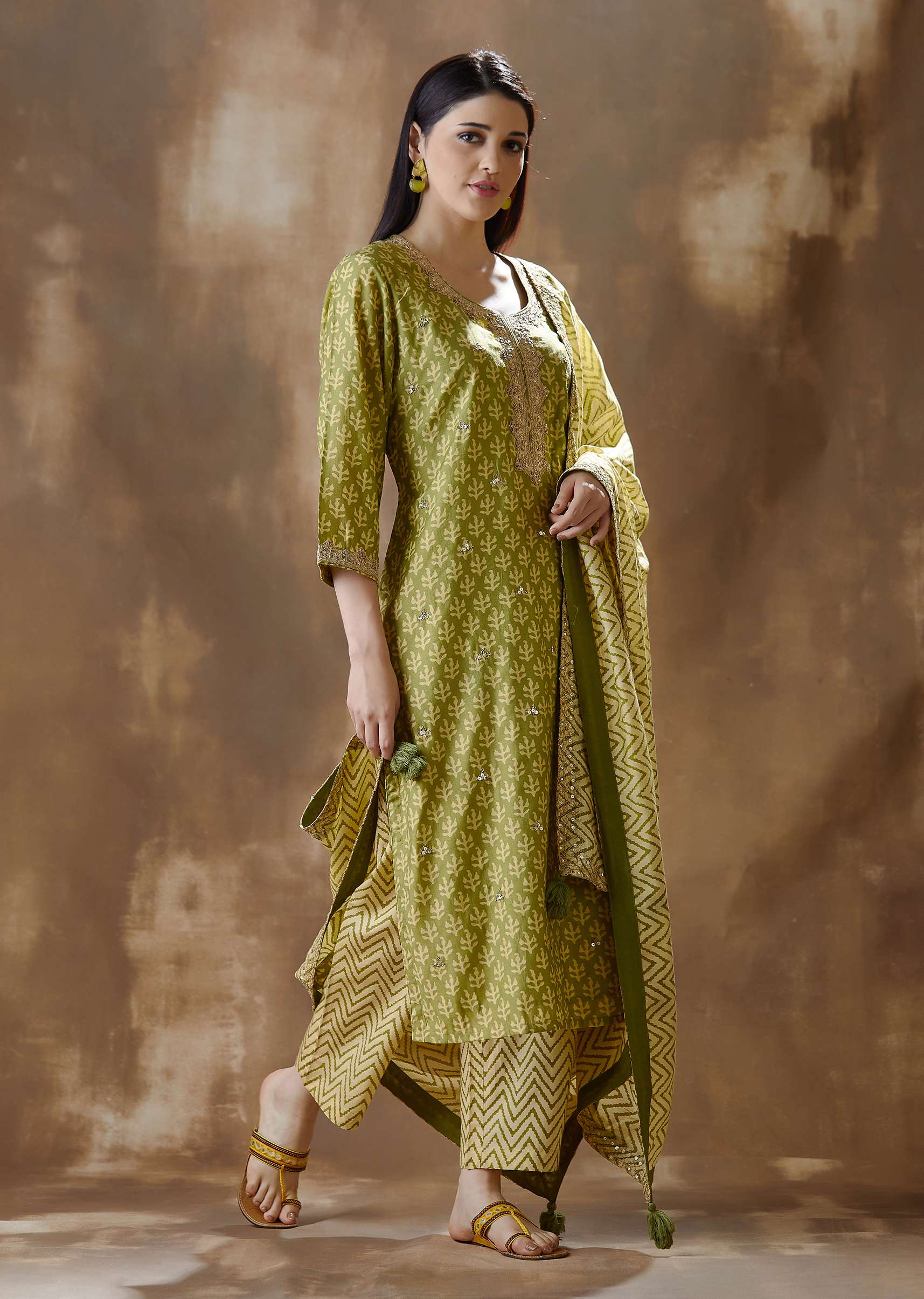 Green Daboo Print festive straight cut suit in silk with printed round neck embroidery along the neckline. It is paired with printed straight cut pant and a graceful dupatta with... More Product Details