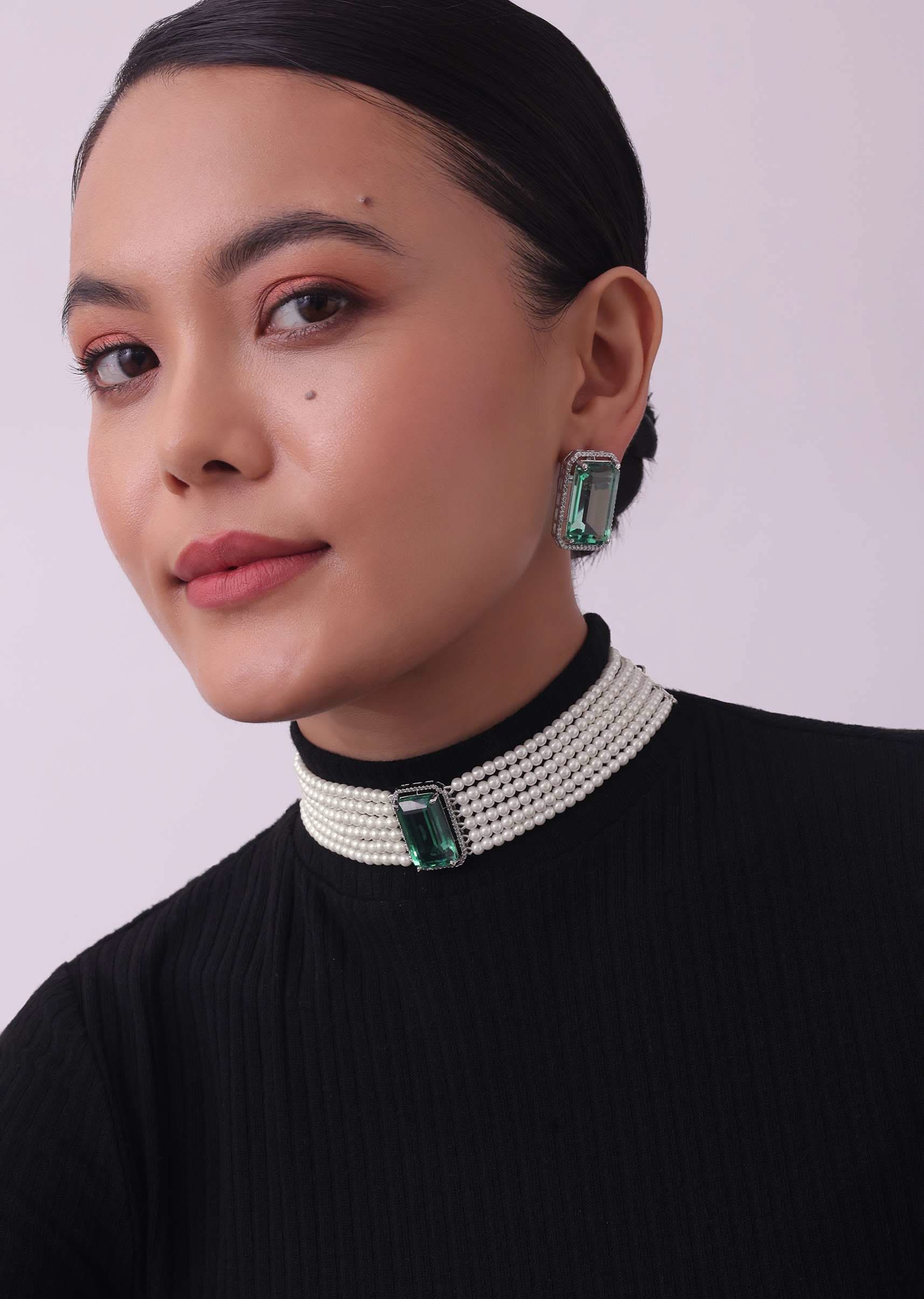Add a touch of edgy elegance to your look with our pearl choker and earring set in mix metal. This statement piece combines feminine pearls with a bold green stone in the center creating a perfect balance of sophistication and a rock 'n' roll attitude. EVENT - The set is perfect for all festive occasions including weddings.Store in a dust bag. Keep away from moisture perfume alcohol and harsh chemicals. Spot clean only. Keep away from sharp objects. Actual color may slightly vary due to photographic lighting sources and device screen settings. Awarded as the Most Trusted Brand, we're delivering styles you love, just as promised.