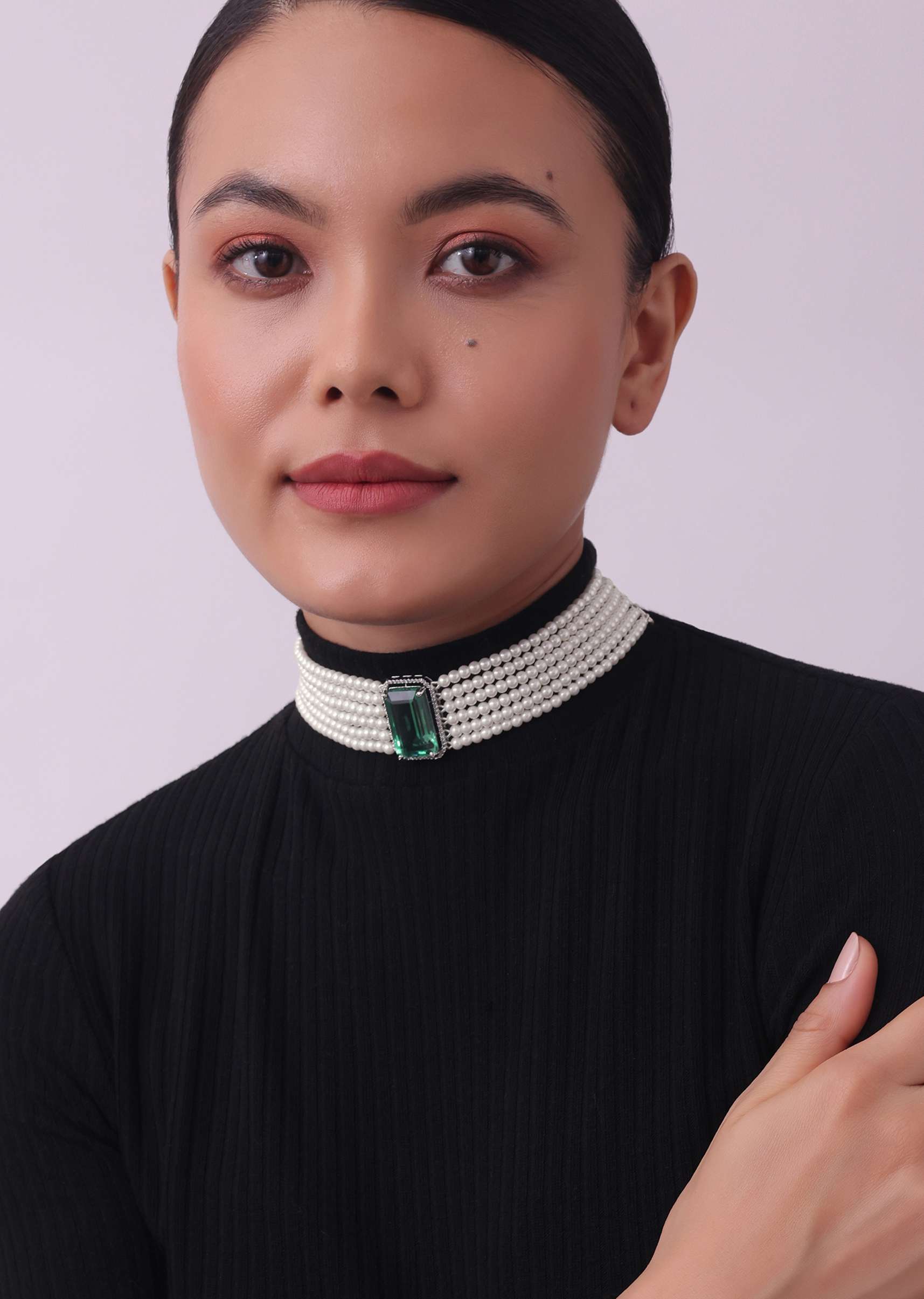 Green Studded Pearl Choker In Mix Metal