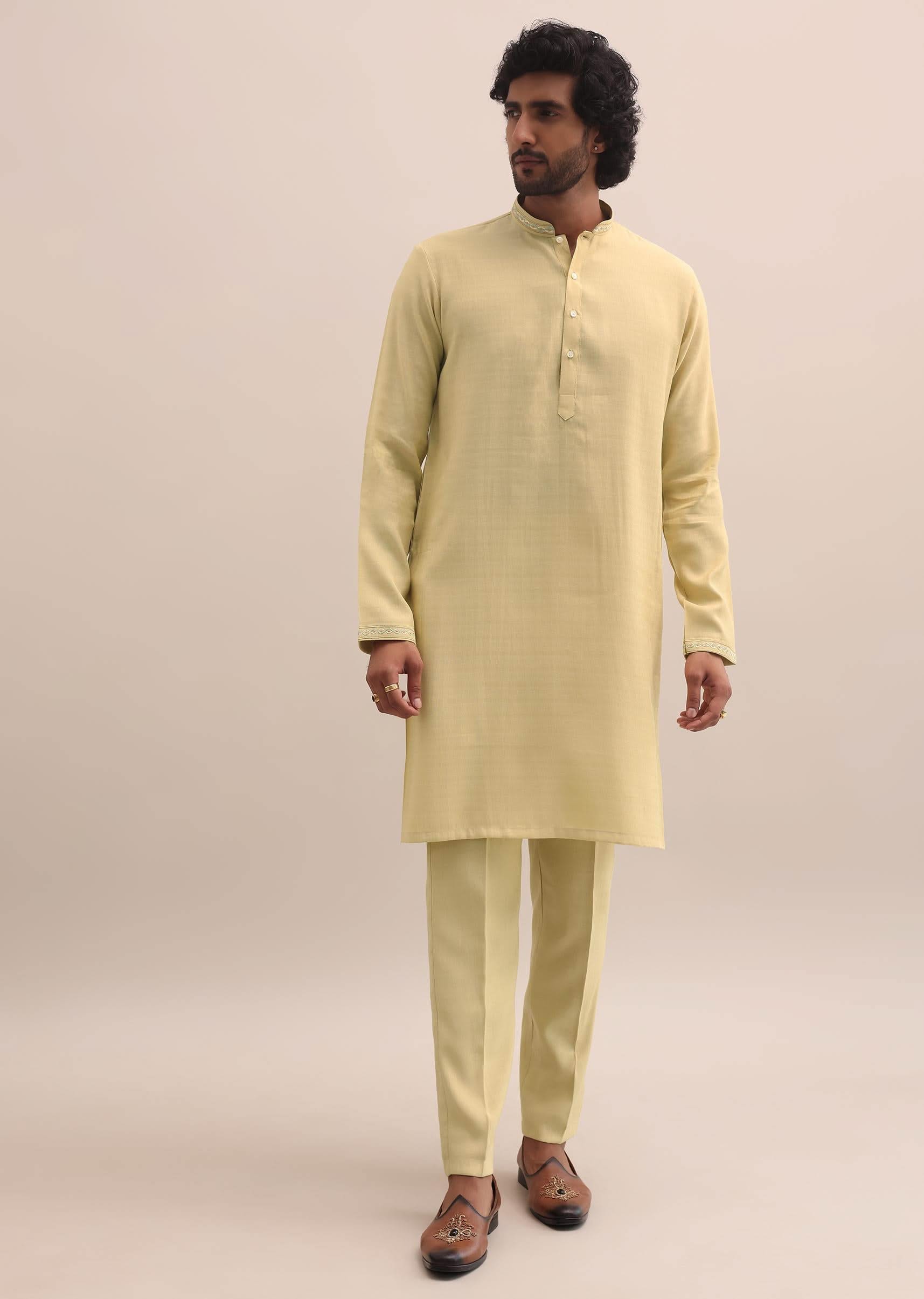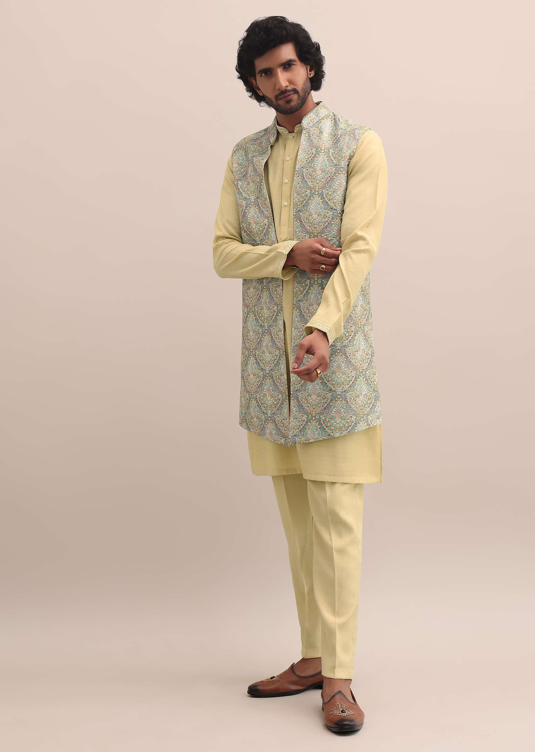 Dive into regal charm in this green embroidered kurta jacket set.Crafted in art silk fabric, it is enriched with threadwork embroidery detailing all over the jacket. Opt for this outfit... More Product Details