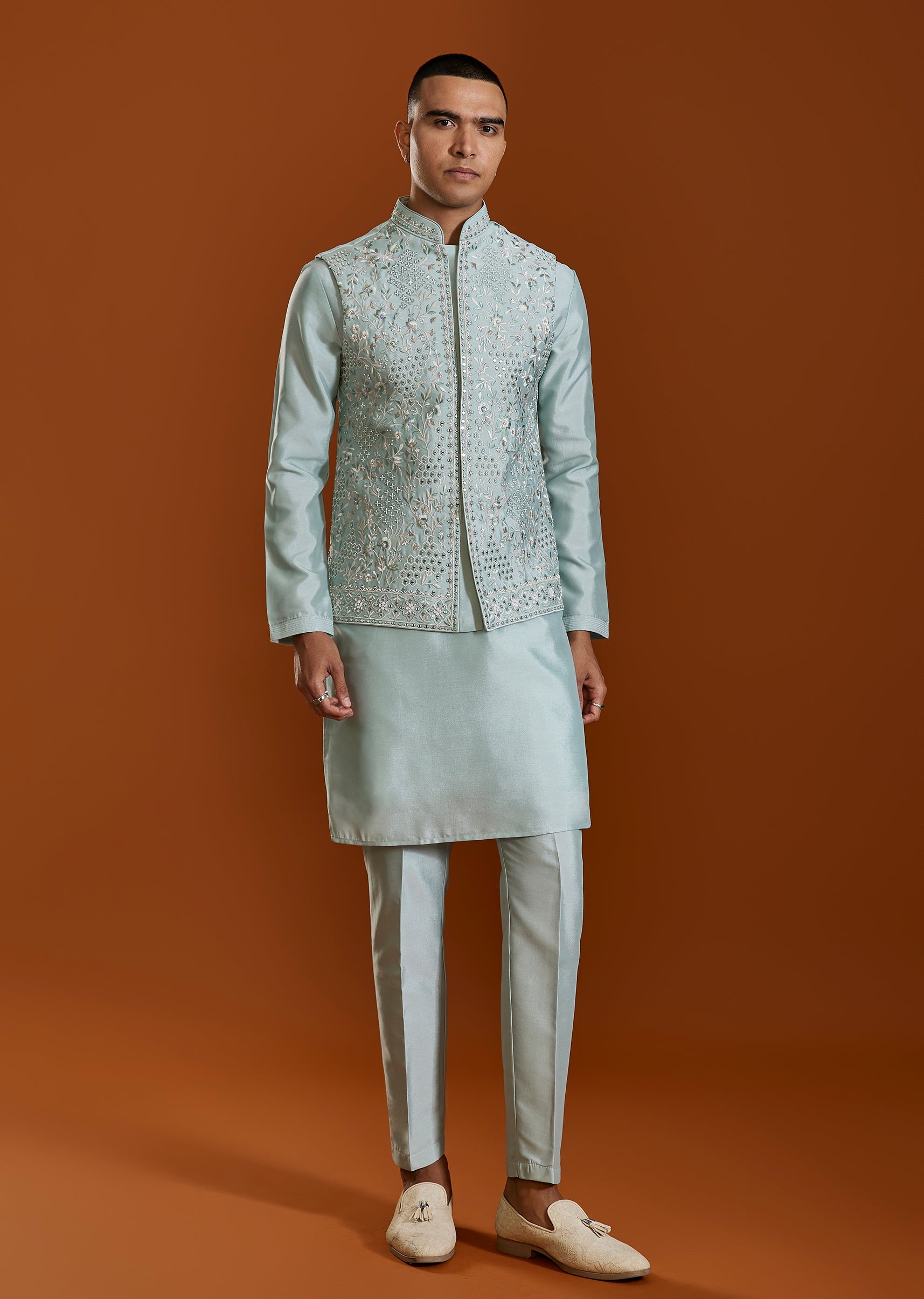 A vibrant green kurta set crafted in art silk and adorned with intricate thread, bead and mirror embellishments. The rich festive detailing and classic mandarin collar make it ideal for... More Product Details