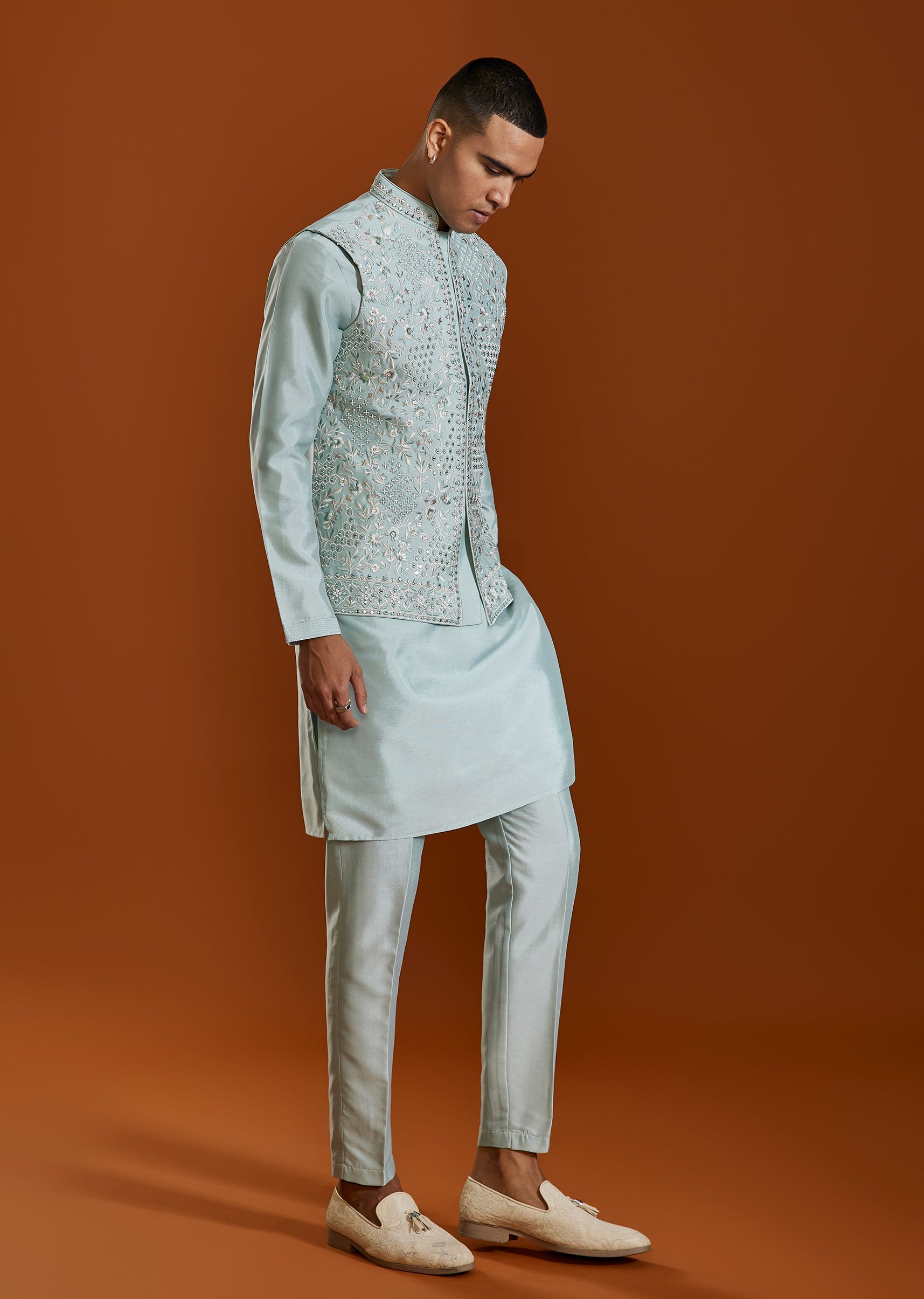 Pair with tan mojaris and minimal accessories to highlight the embroidery.