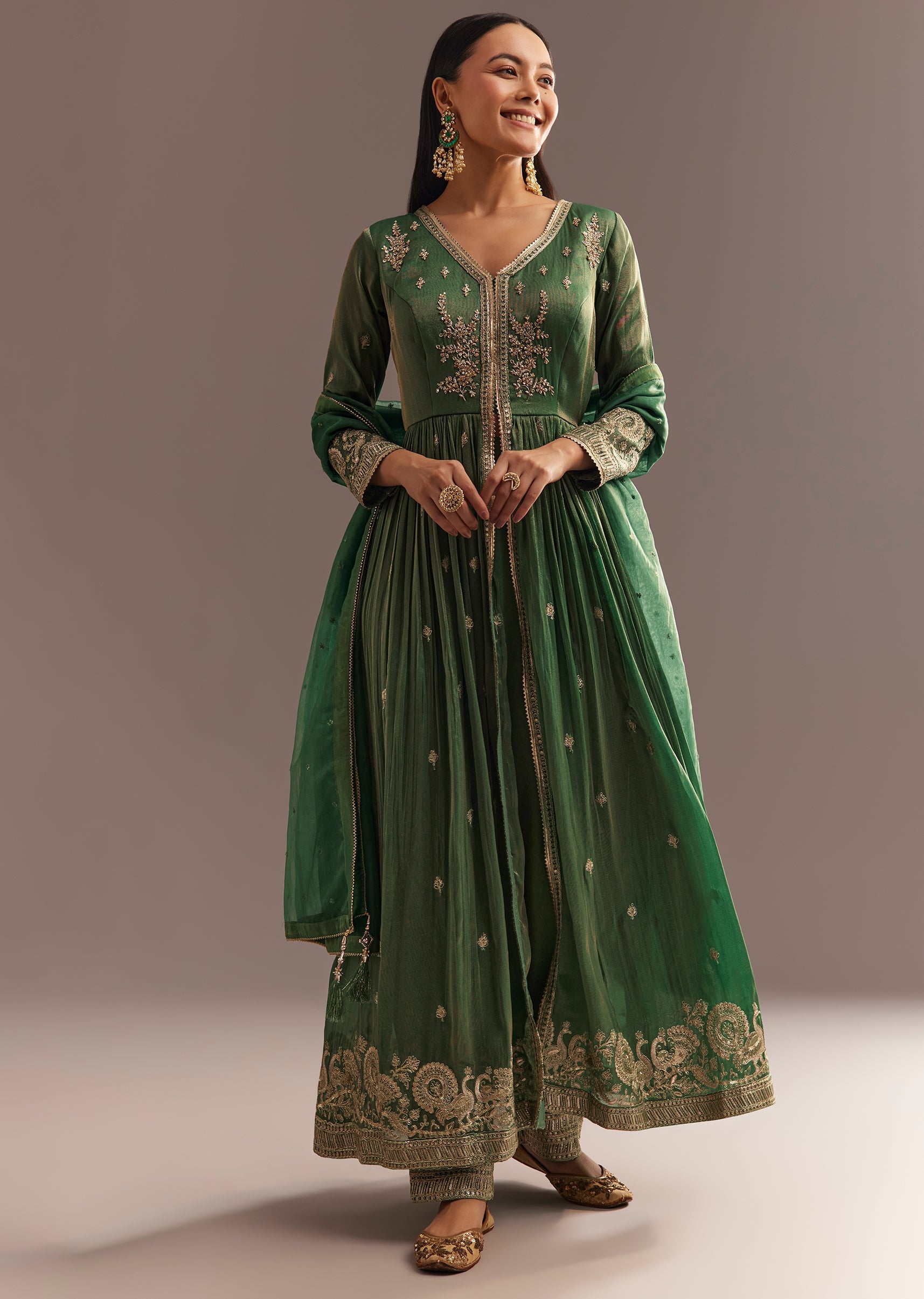 A vibrant festive look featuring a green anarkali with intricate zardosi and sequins work highlighted by a stylish front slit, paired with matching pants and an organza dupatta adorned with... More Product Details