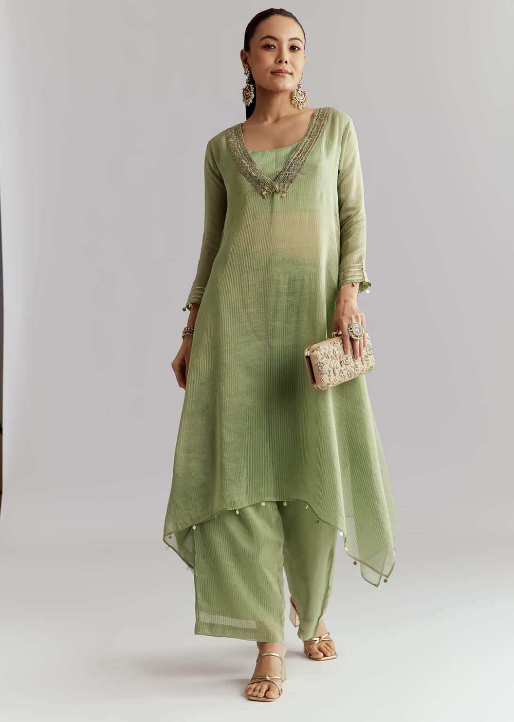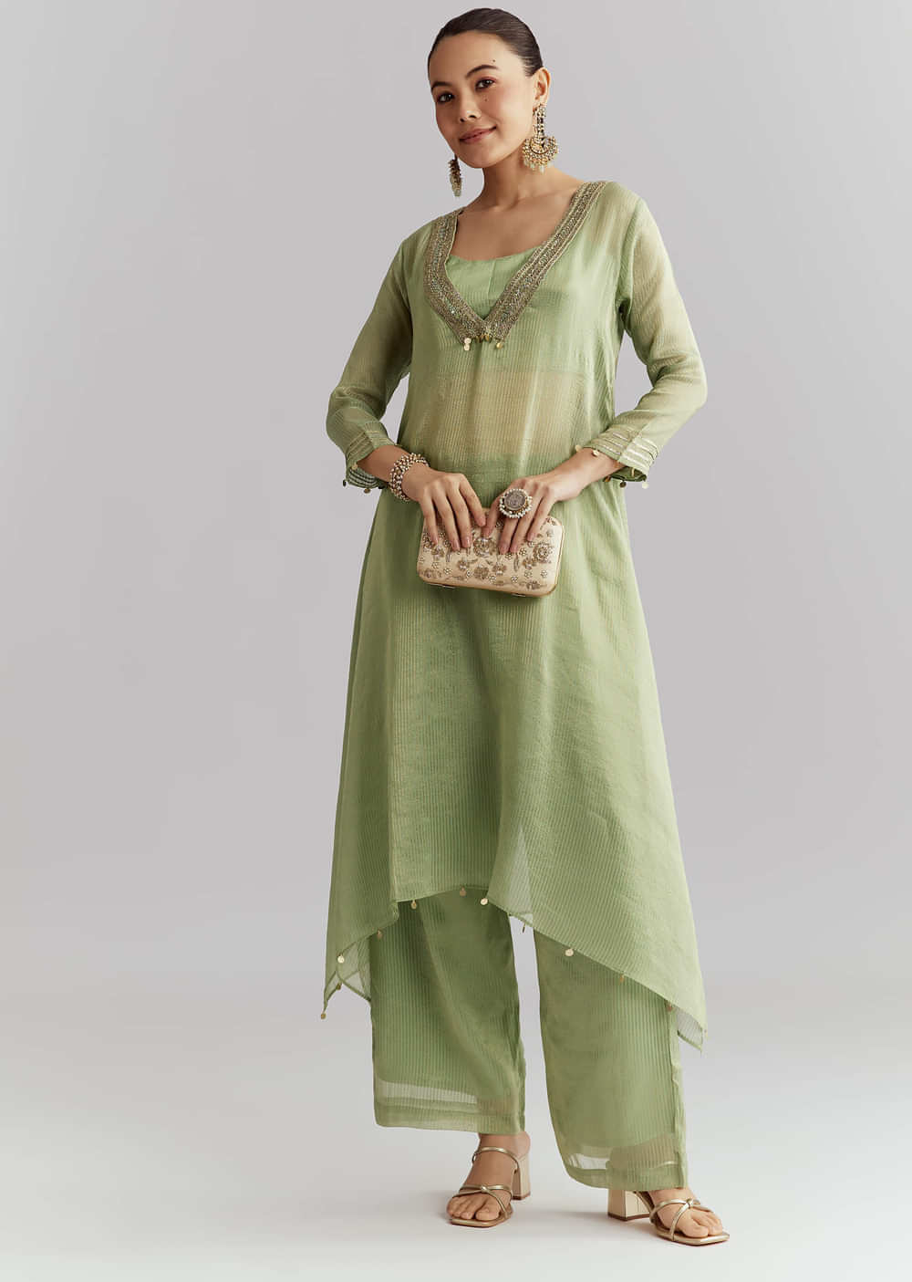For a refined take on shine, this green tissue kurta set highlights the neckline with zardosi and sequins and finishes the sleeves with gotta work for tidy detail. The airy... More Product Details