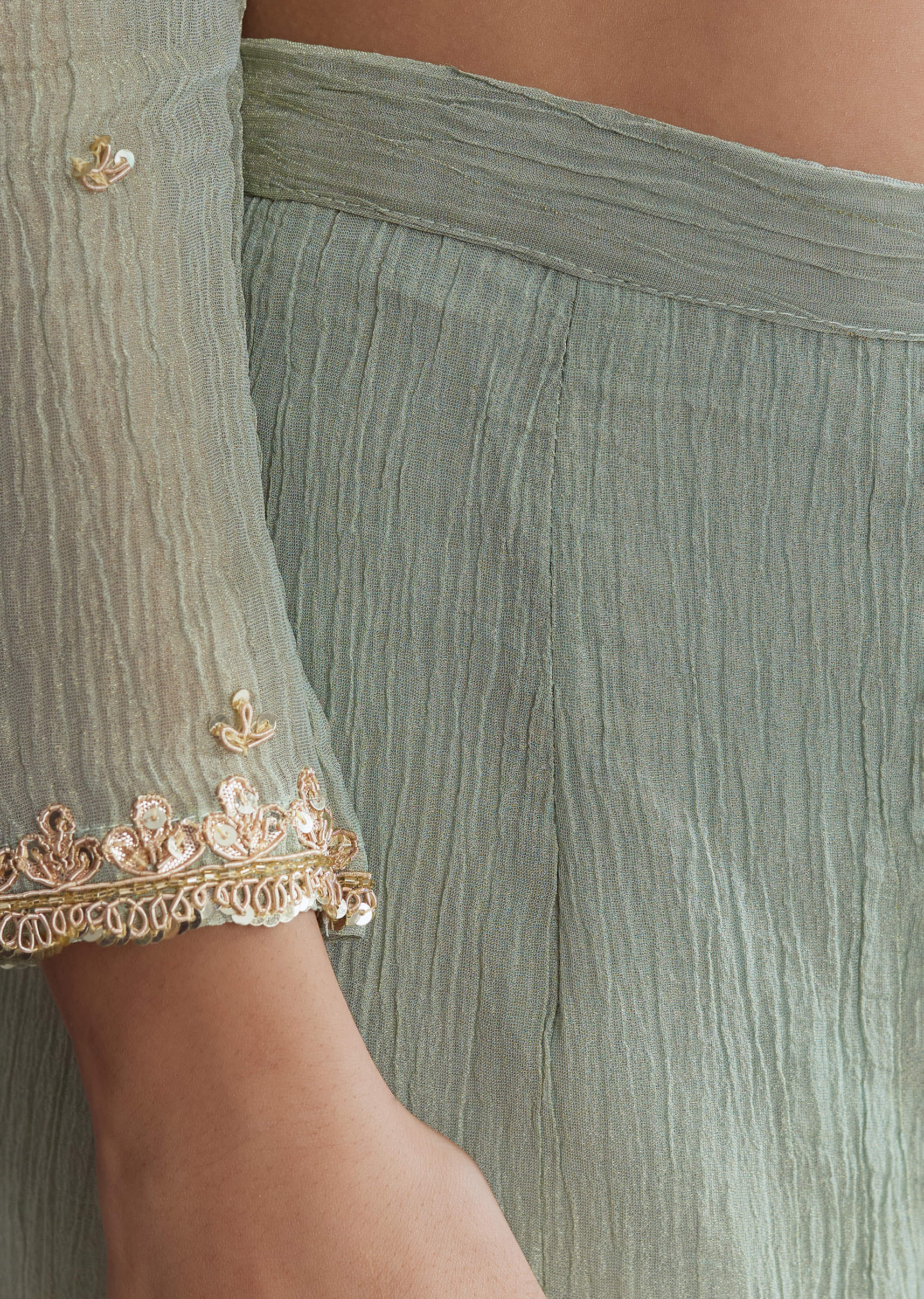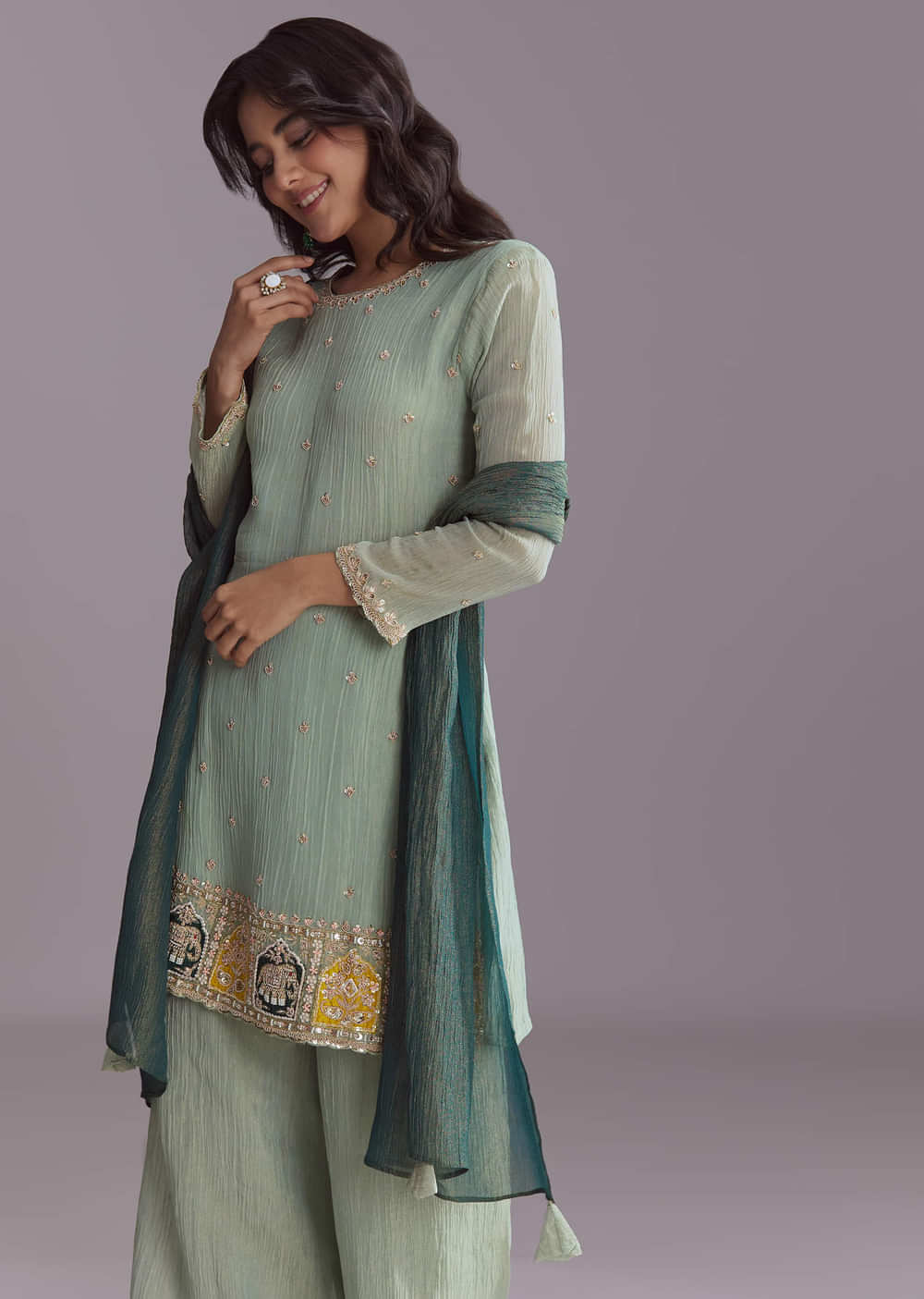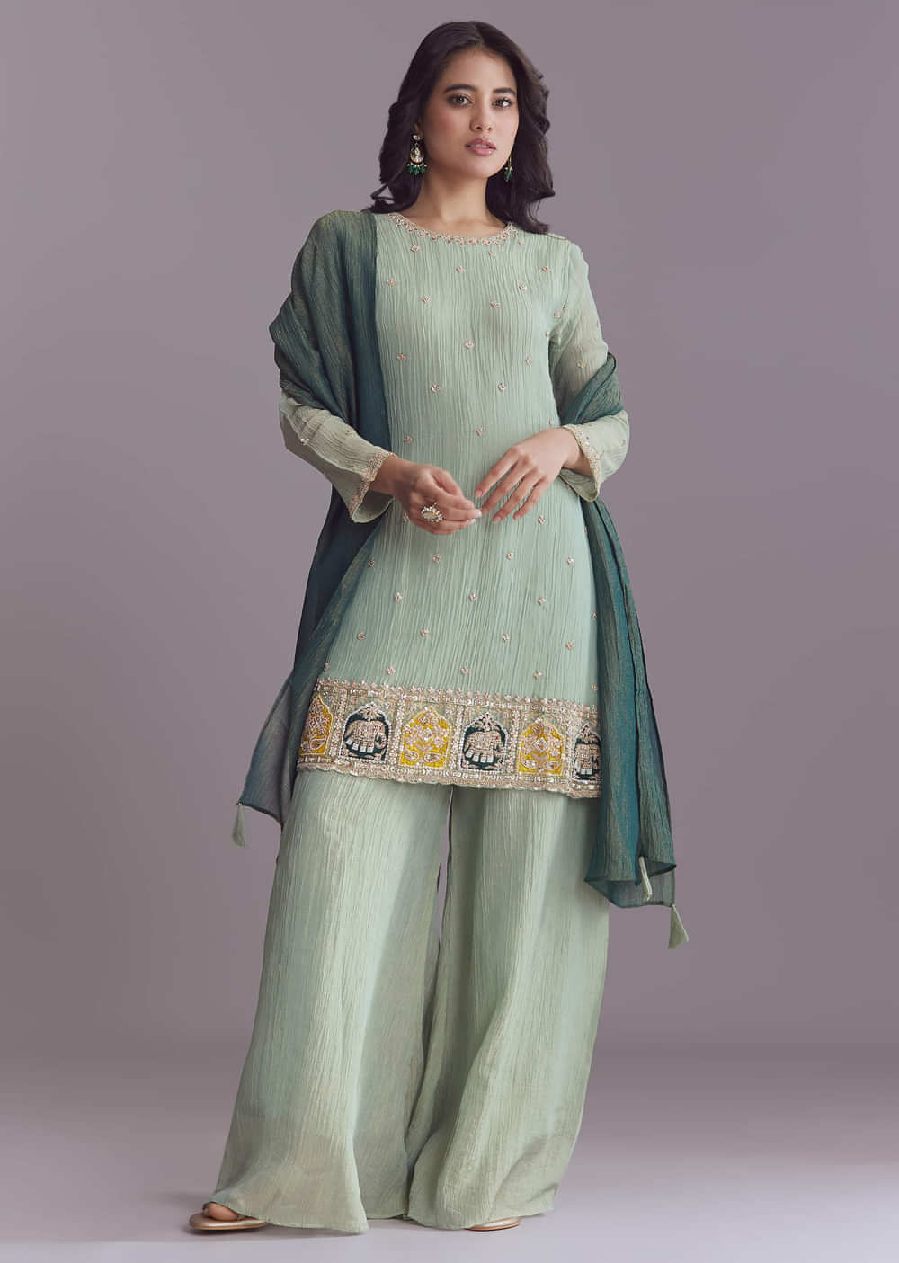 Green Tissue Palazzo Suit With Embroidery And Contrast Dupatta