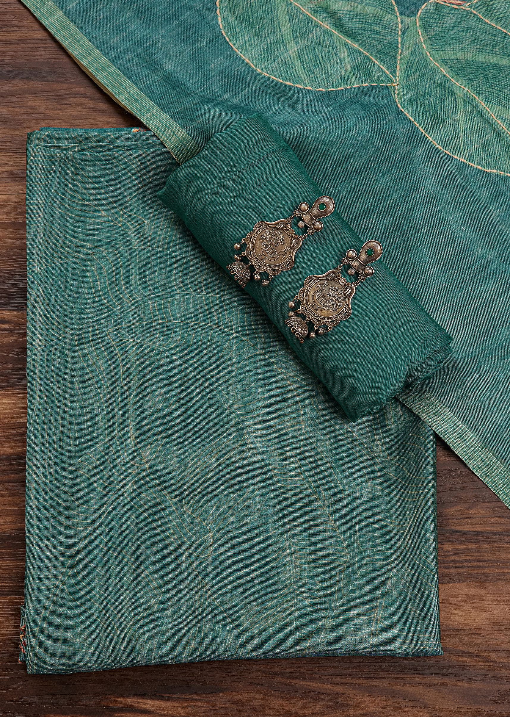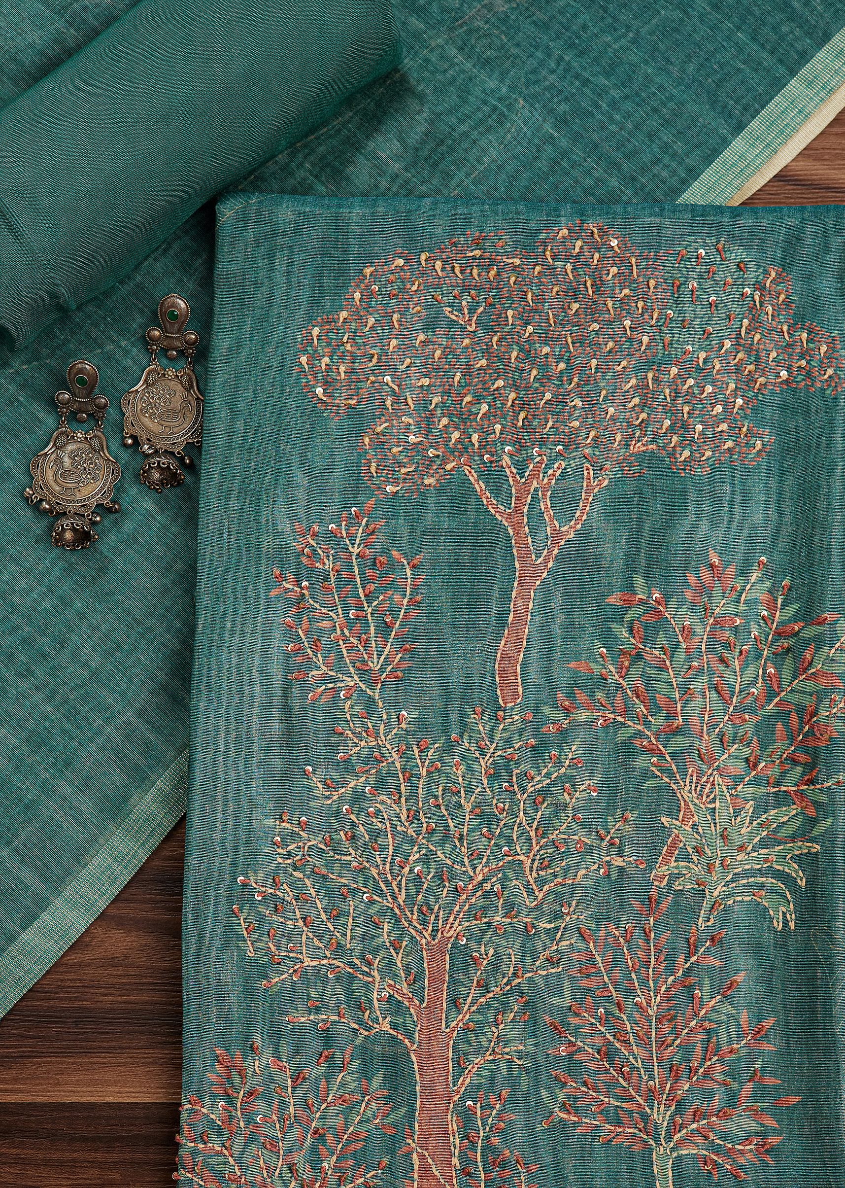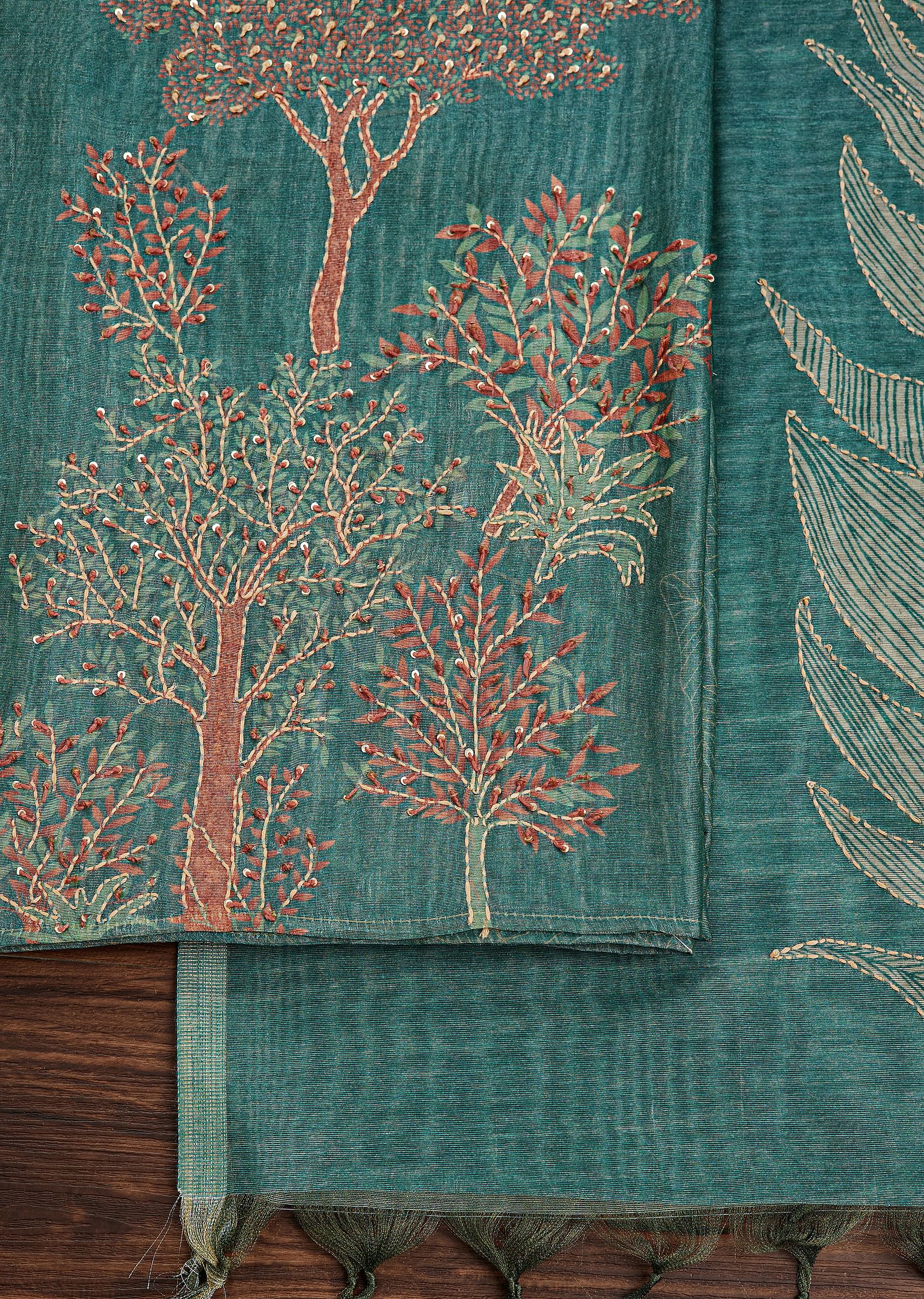Green Tussar Unstitched Suit Set With Kantha Work And Sequins