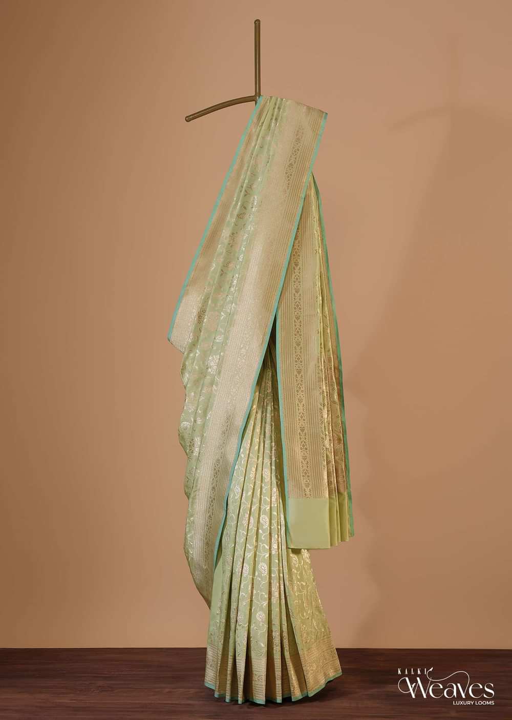 Presenting to you a classic handloom saree straight from the heart of Kalki fashion.Our green saree in banarasi uppada silk with beautifully intricated floral jaal.It comes with a matching unstitched blouse.EVENT - A perfectly elegant choice for FESTIVE OCCASIONS.NOTE - Piping border color may vary.Our premium handloom sarees might come with a slight weave difference, but that's what makes each saree a one-of-a-kind piece of art with authenticity intact in every thread.NOTE - You can get your hands on designer blouses by browsing through our saree blouse category.You can also get matching shapewear as our stylists suggested for the perfect look.WASH CARE INSTRUCTIONS -Store the Paithani saree in a Muslin cloth.Do not use naphthalene balls or chemicals where you store the saree.Do not spill any liquids on the paithani saree.Never use plastic or regular cardboard boxes to store the saree.Provide good air circulation where you store the saree.Change folds after every use because folding it the same way might leave permanent creases on the saree.Protect the saree from humid weather, especially monsoon. Awarded as the Most Trusted Brand, we're delivering styles you love, just as promised.