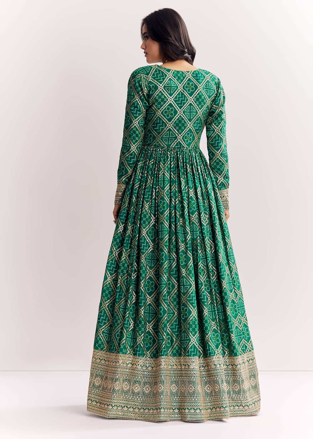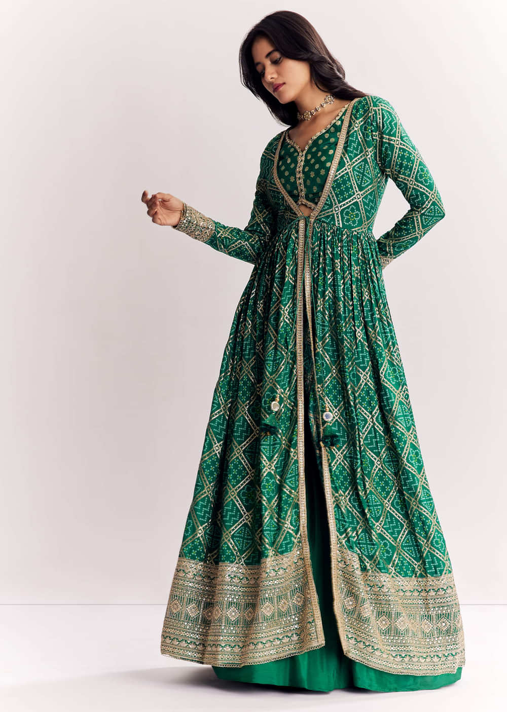 Green Weave Silk Indowestern Skirt Set With Bandhani Print Zari Work Jacket