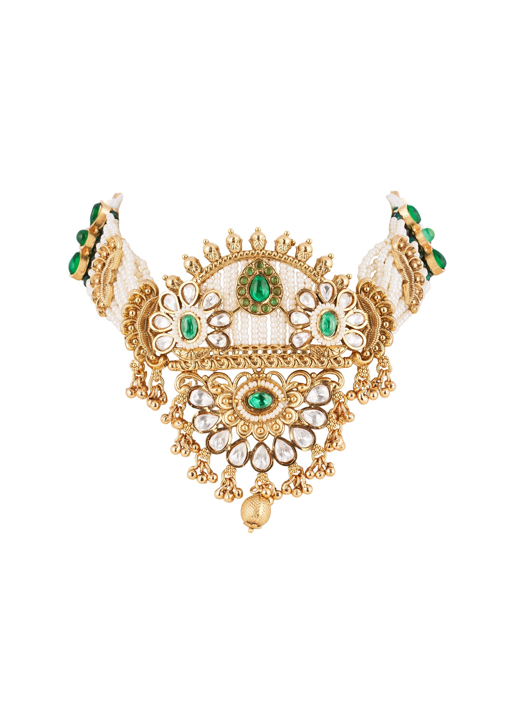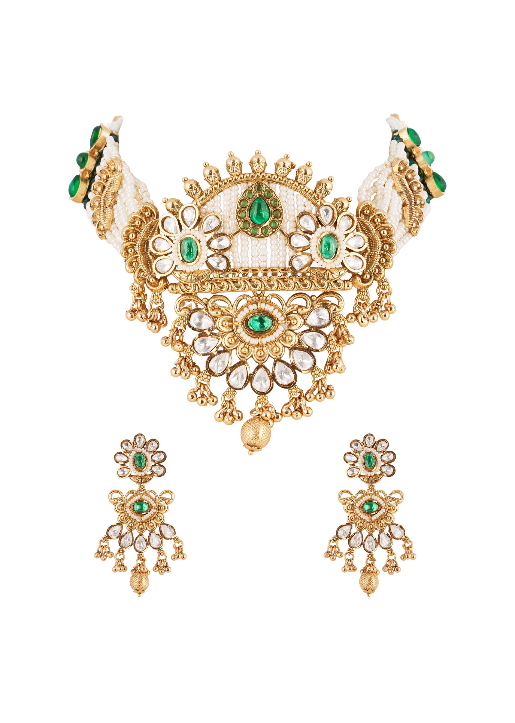 Green White Necklace Set With Refined Kundan Detail