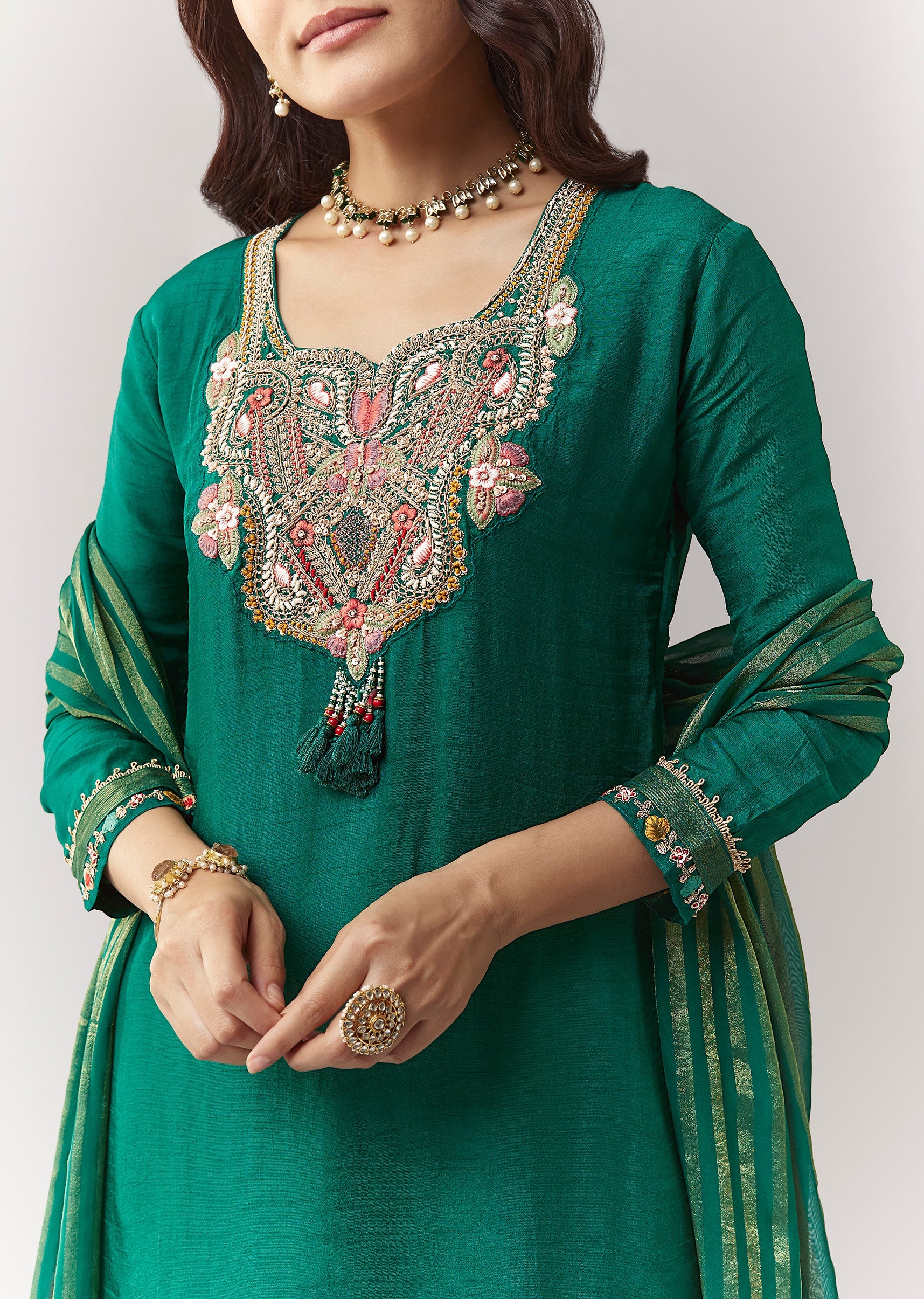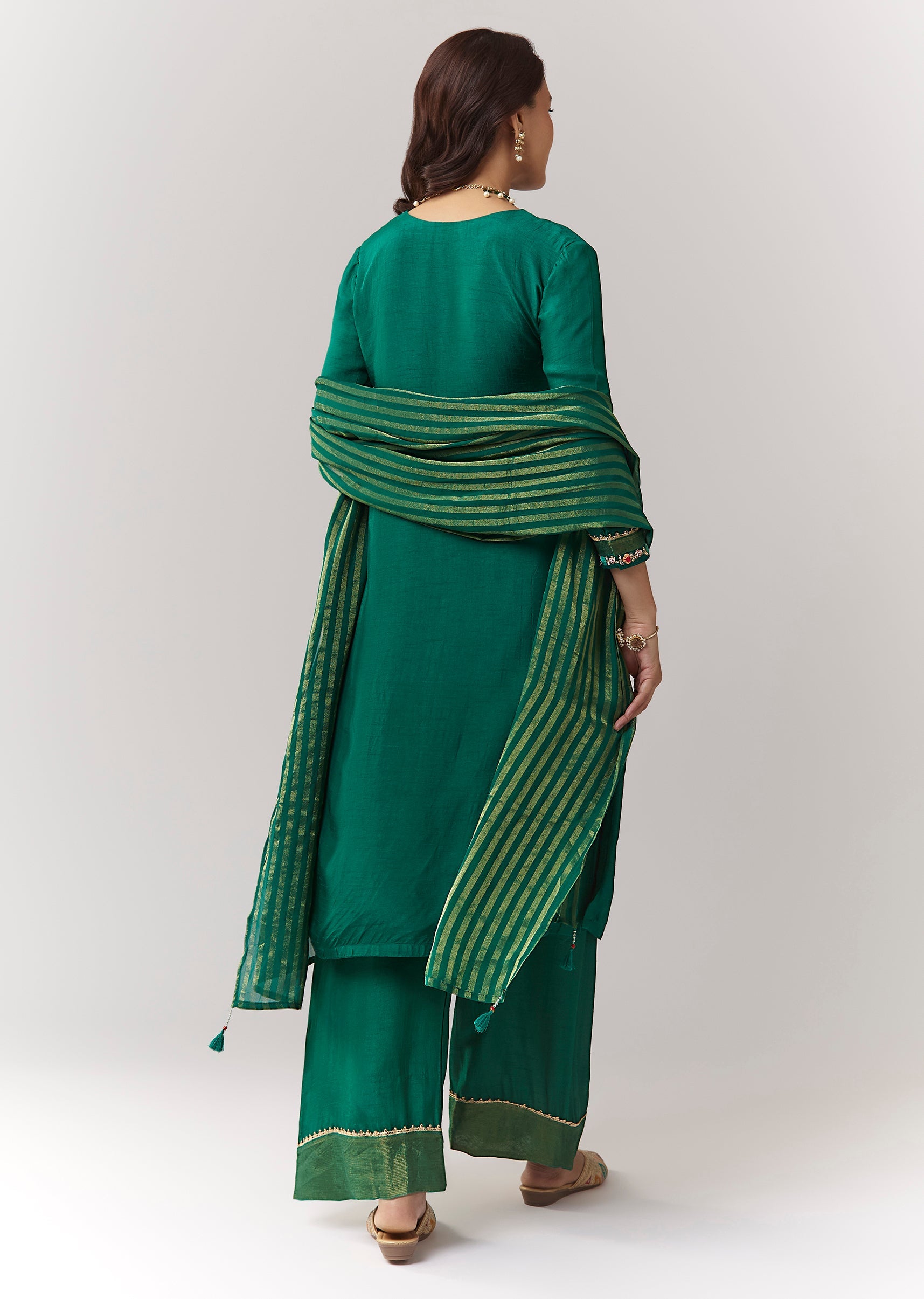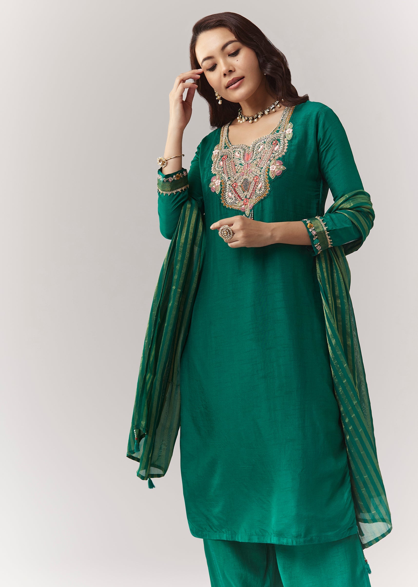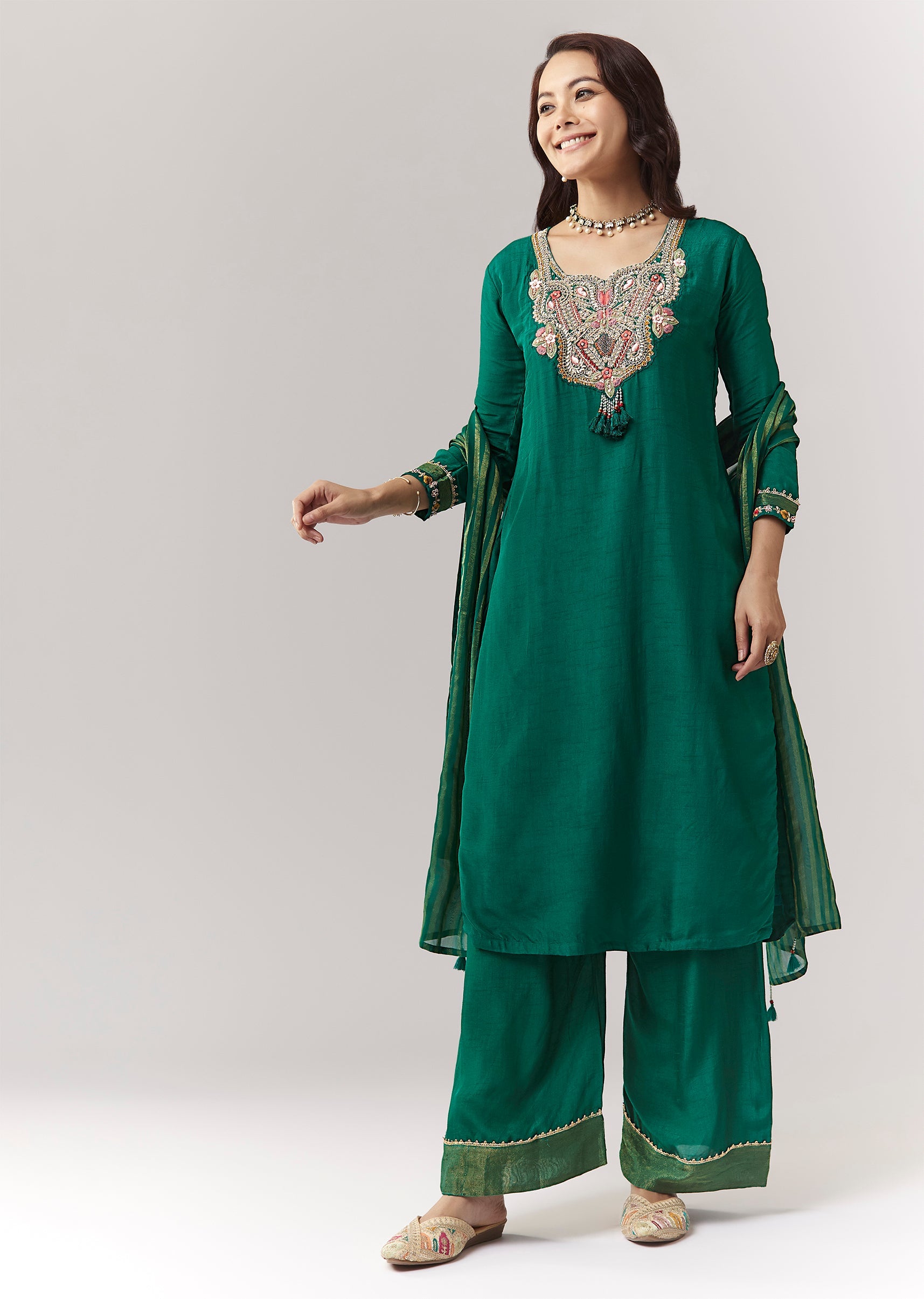 Green Zardosi Threadwork Kurta Palazzo Set With Dupatta