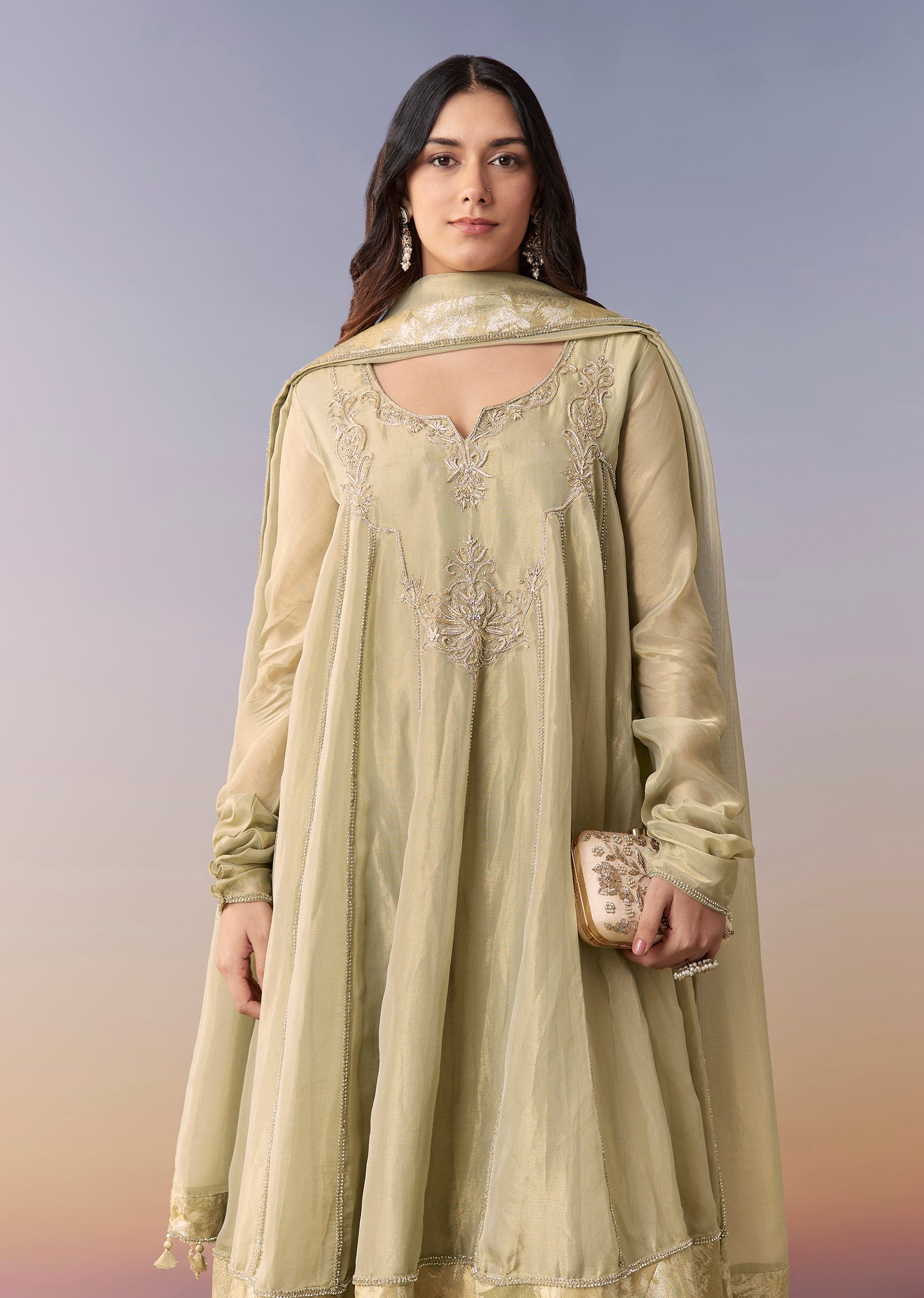 Green Zardosi Tissue Anarkali Suit Set With Pant And Dupatta