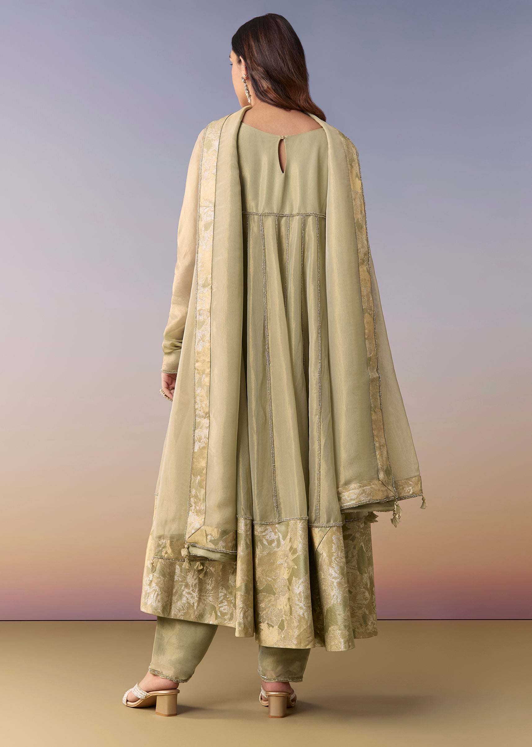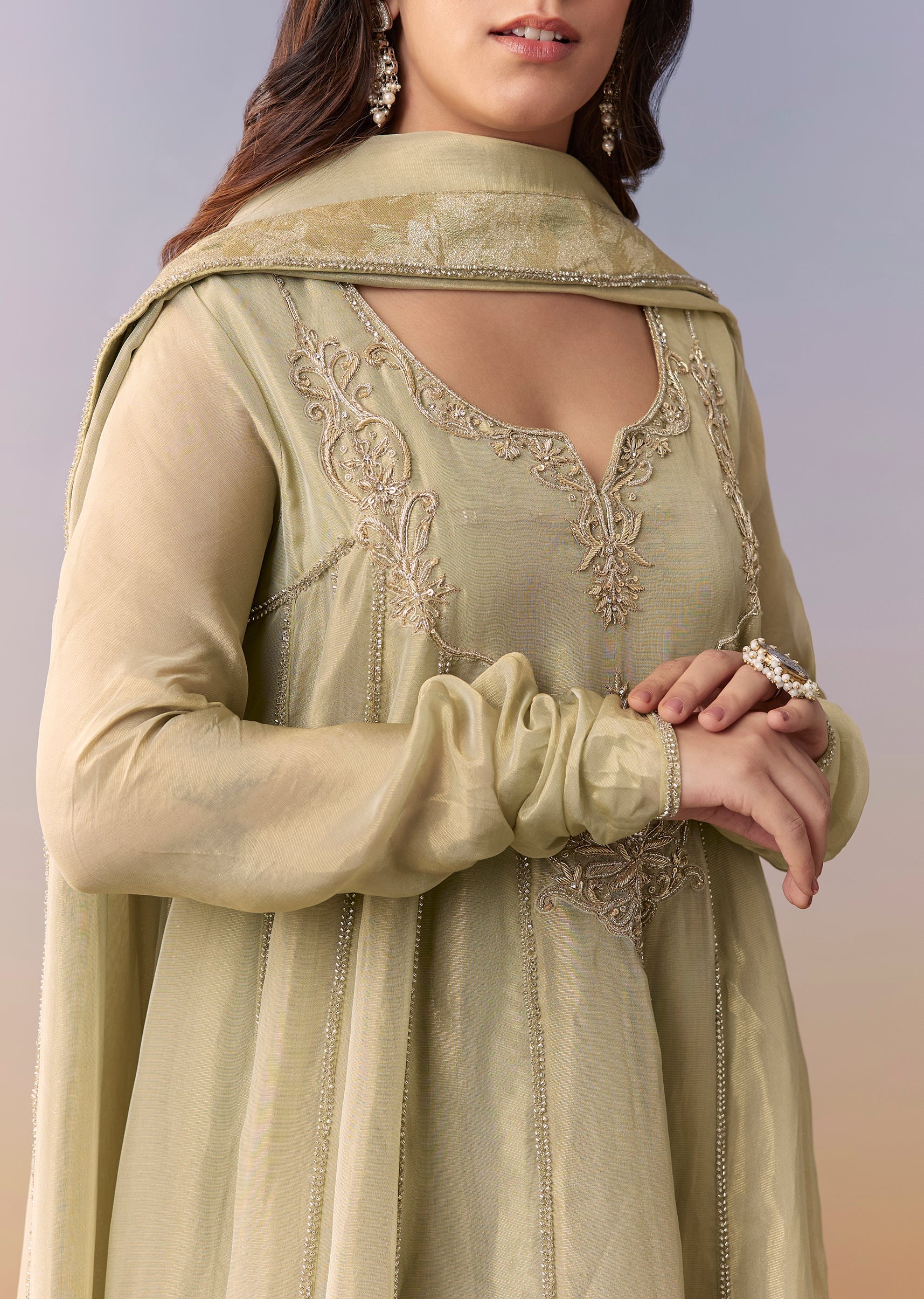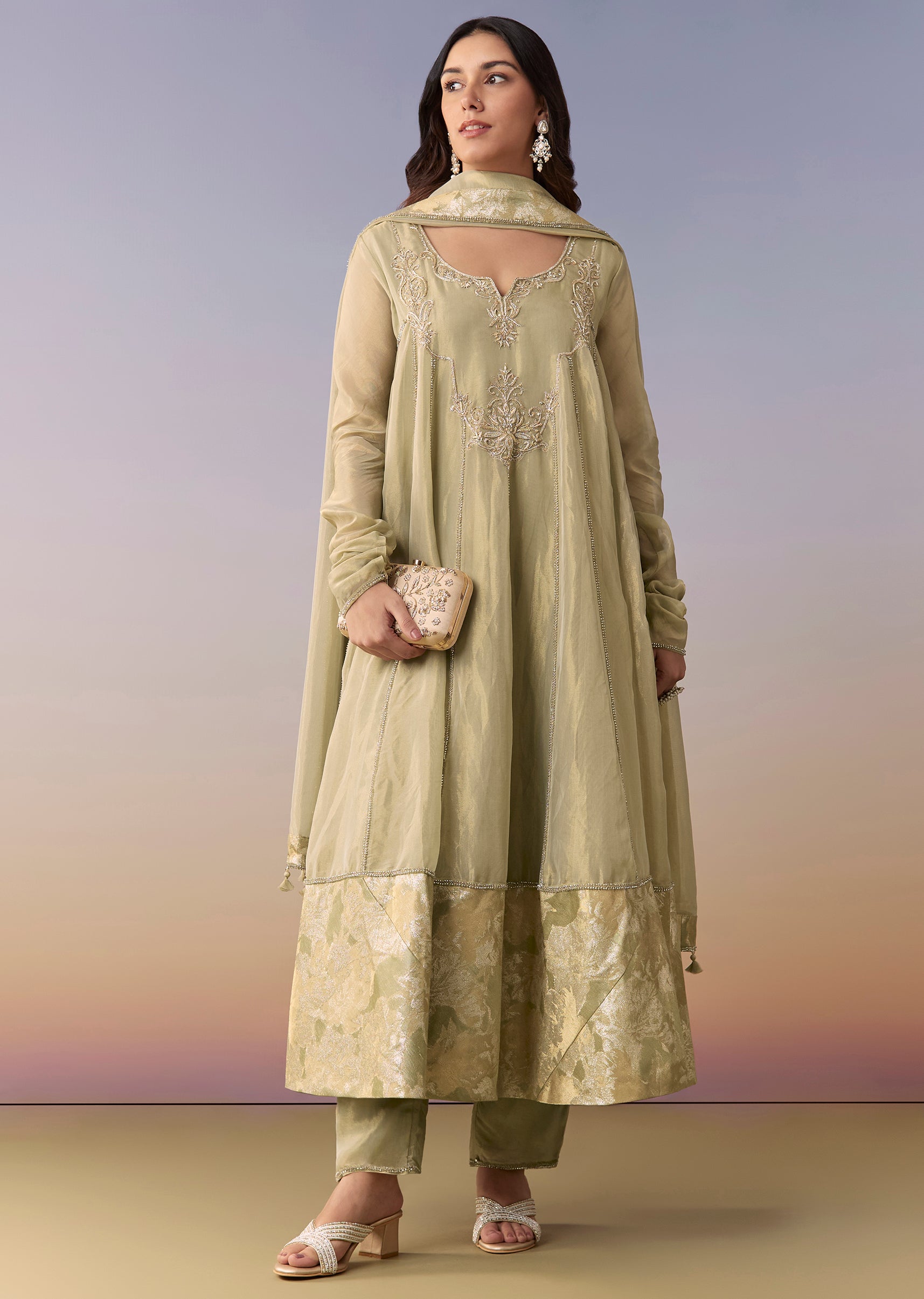 Green Zardosi Tissue Anarkali Suit Set With Pant And Dupatta