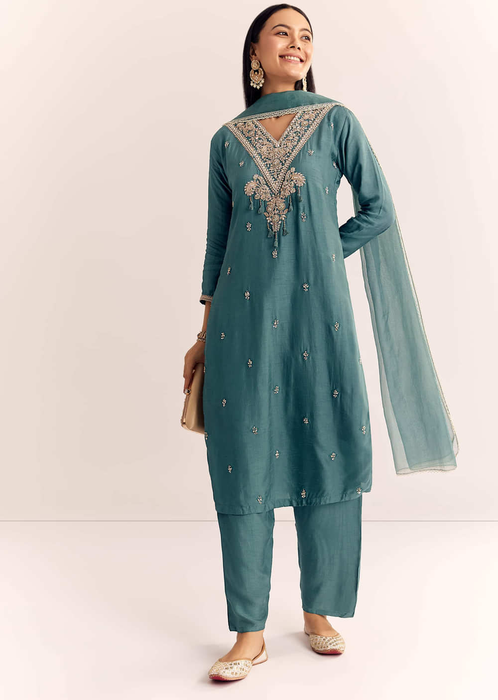 Celebrate vibrancy with this peacock green Dola silk kurta embellished with zardosi and matched with a soft dupatta. As vivid as a monsoon garden in bloom.Awarded as the Most Trusted... More Product Details