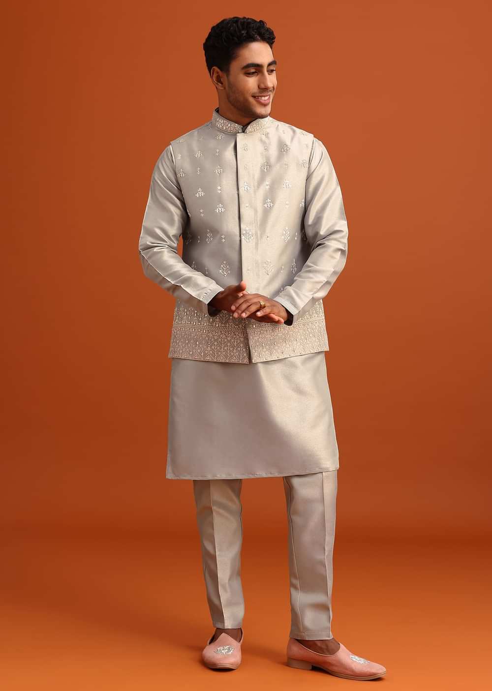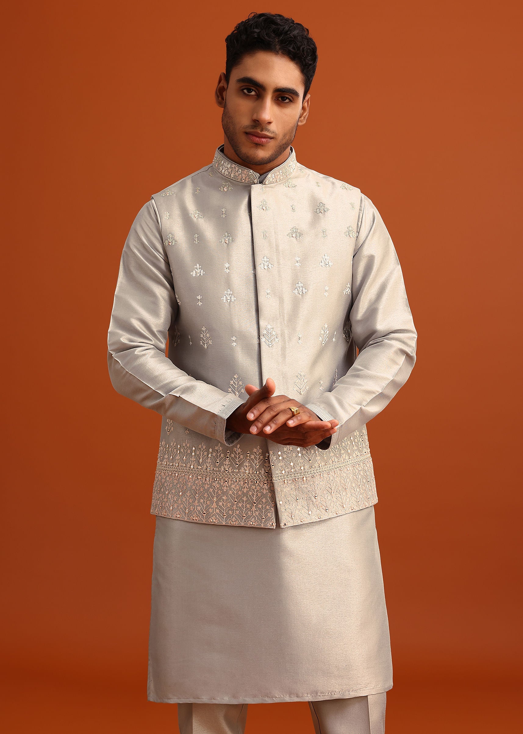 A timeless piece that will add to your versatile traditional collection is this resplendent jacket and kurta set. Crafted in a grey hue, the opulent raw silk jacket is enhanced with exquisite aari and zardozi embroidered motifs. Thoughfully designed with a classy mandarin collar and full sleeves, this silhouette will add charm to any occasion. Awarded as the Most Trusted Brand, we're delivering styles you love, just as promised.