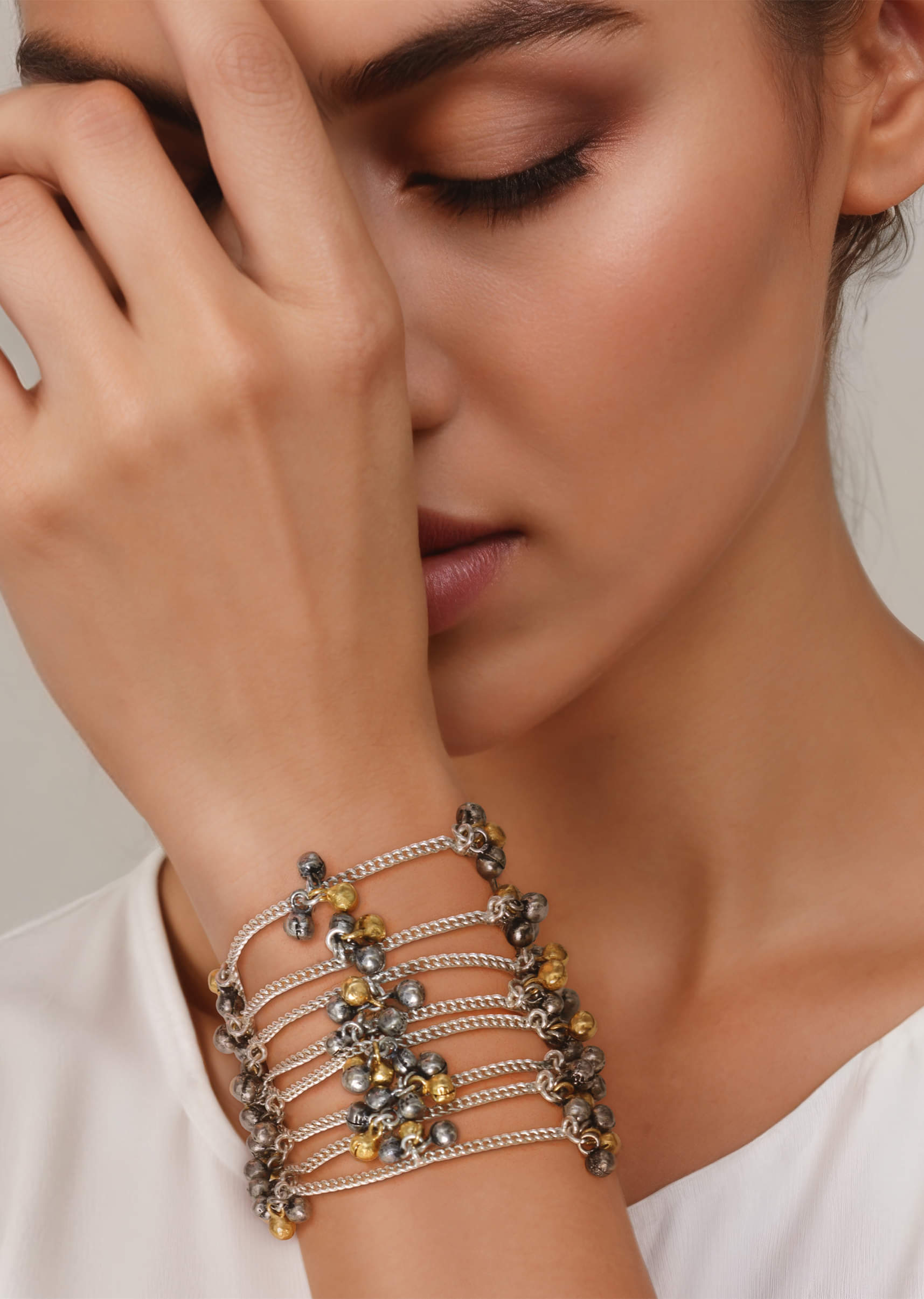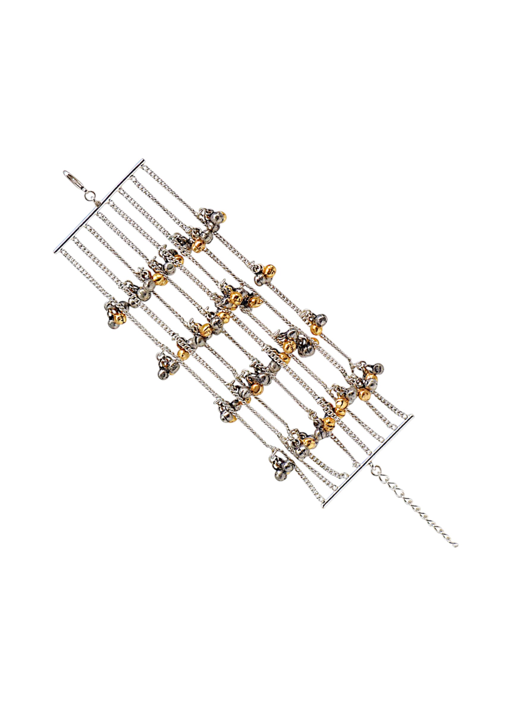 A grey and gold ghunghroo bracelet featuring delicate beads and tiny bells, creating a subtle jingle with every movement. Perfect for adding a traditional yet stylish touch to festive, bridal,... More Product Details
