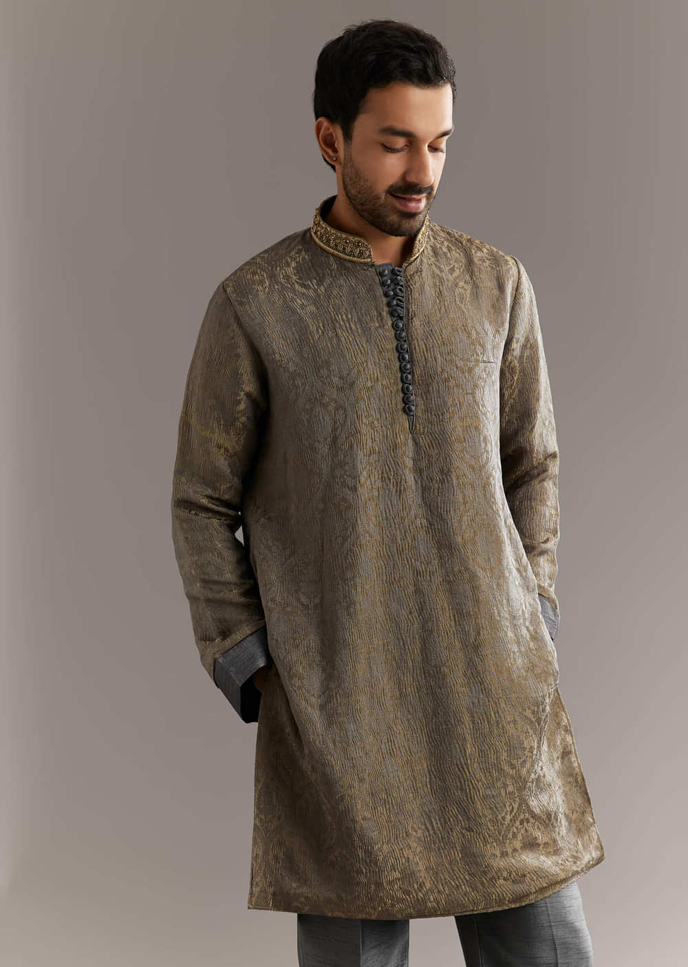 Accessorize with earthy-toned juttis and a gold pocket square.