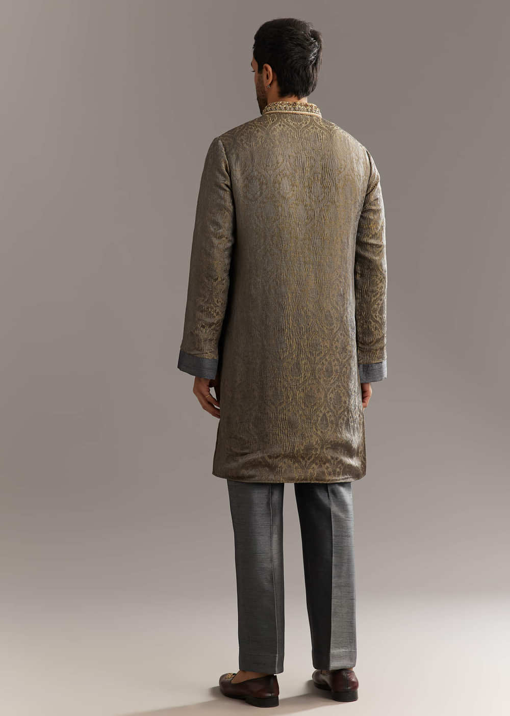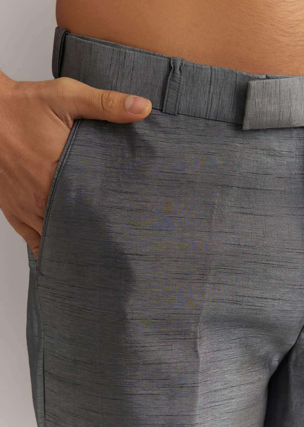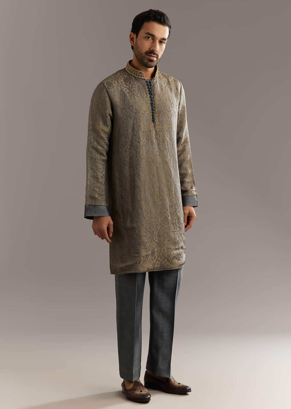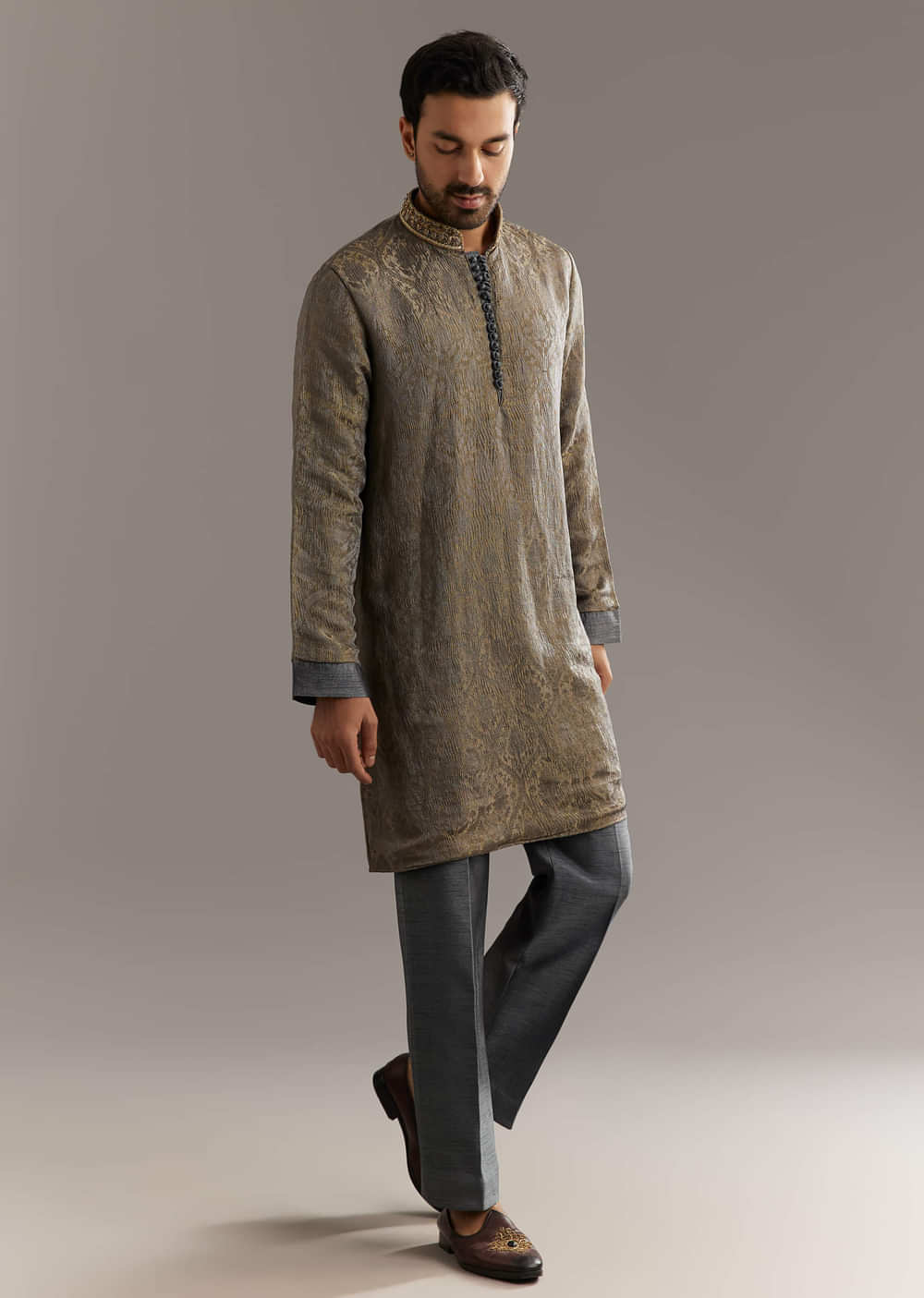 Grey Banarasi Tussar Kurta Set With Contrast Rust Embroidery