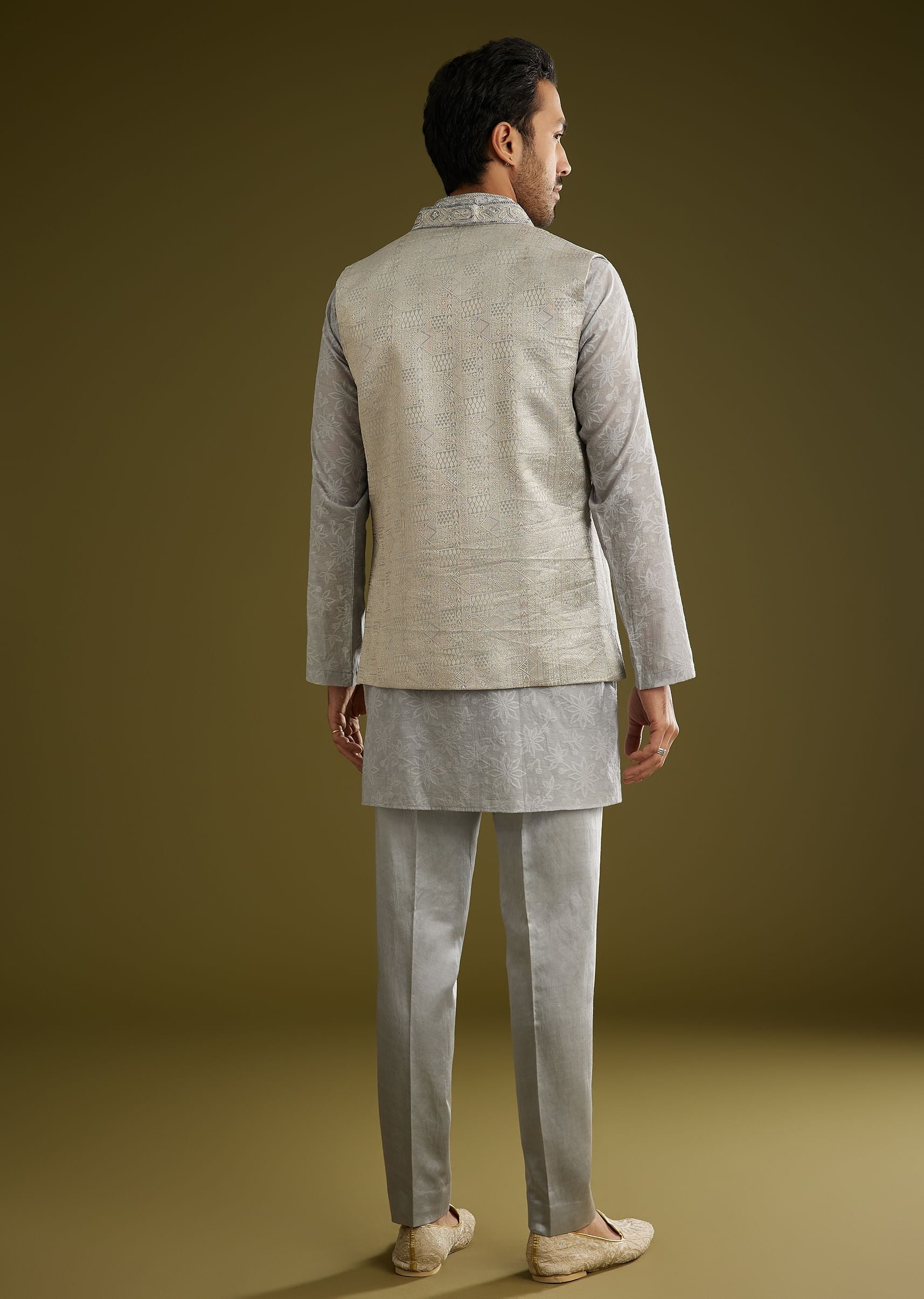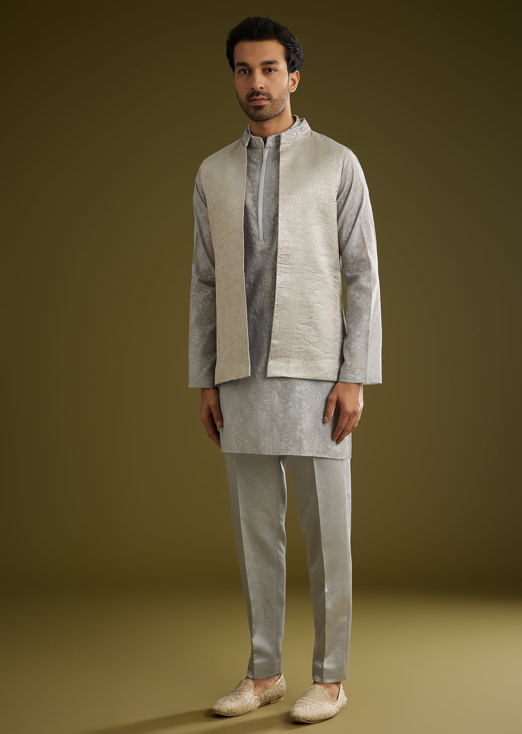 Grey Banarsi Silk Kurta Jacket Set With Hand Work