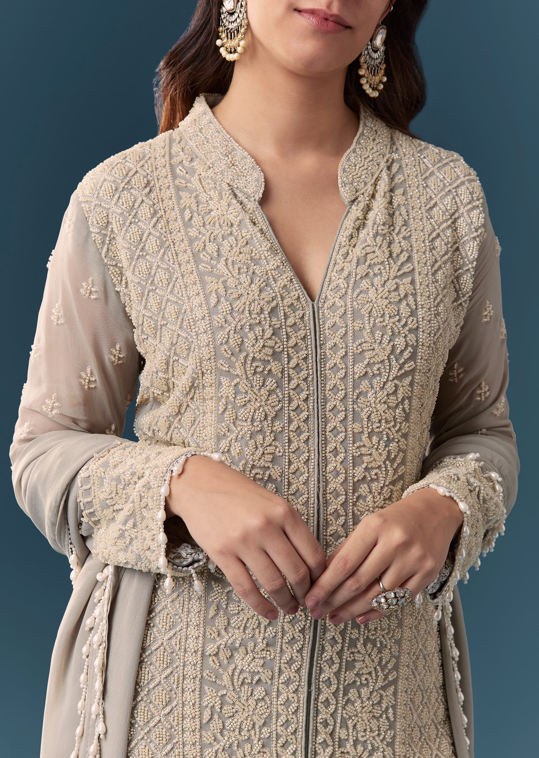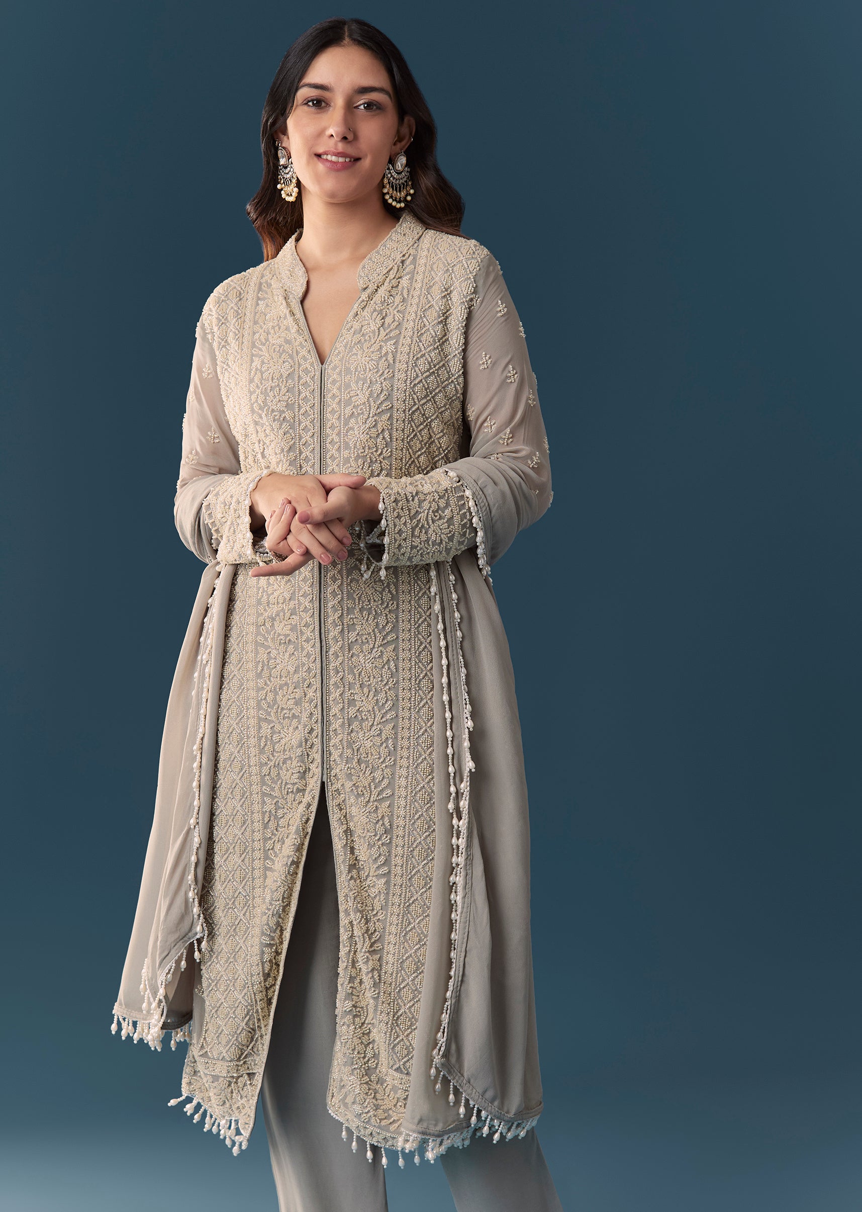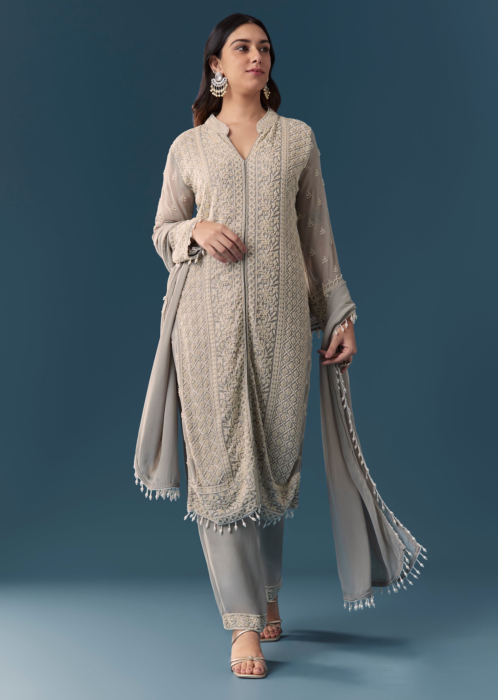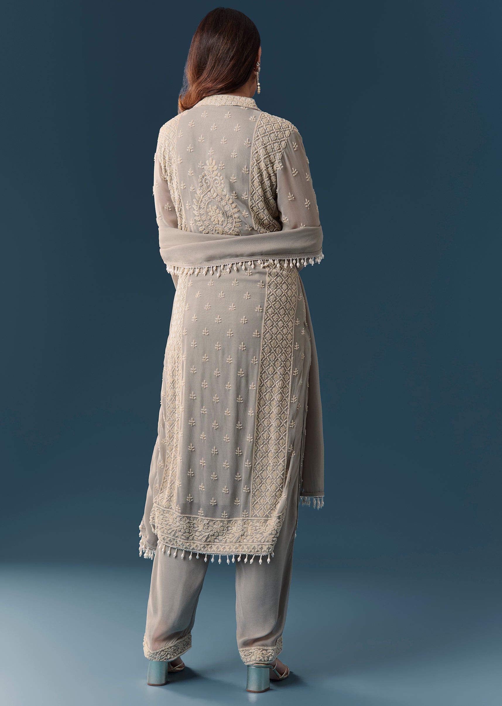 Crafted in georgette, this straight kurta set features elegant bead detailing with a mandarin collar and full sleeves. Paired with straight-fit mid-waist pants (partially elasticated) and a matching dupatta, it’s... More Product Details