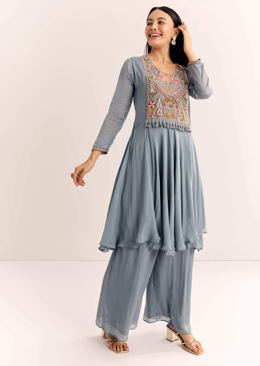 Grey Chinon Zardosi Kurta Palazzo Suit