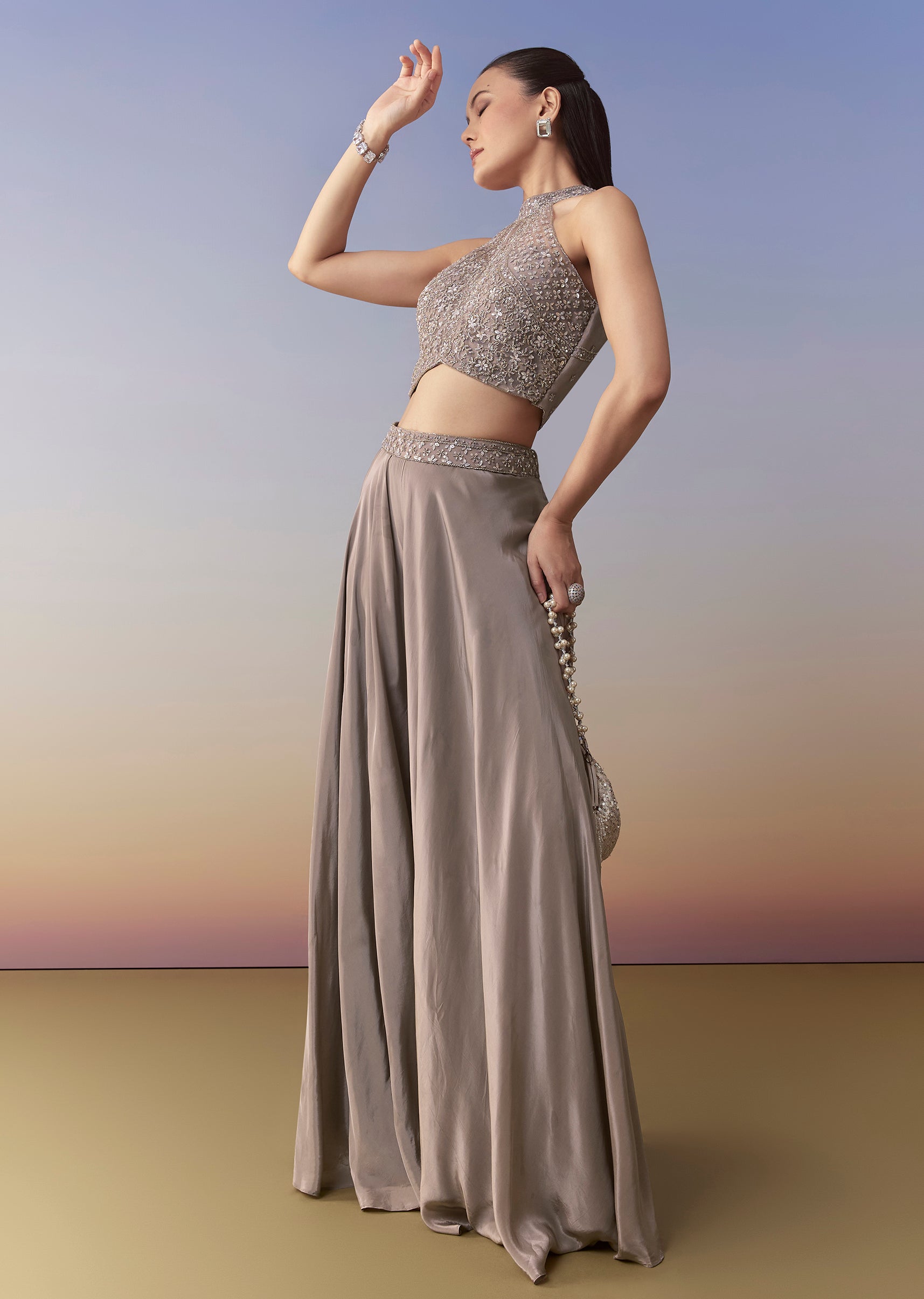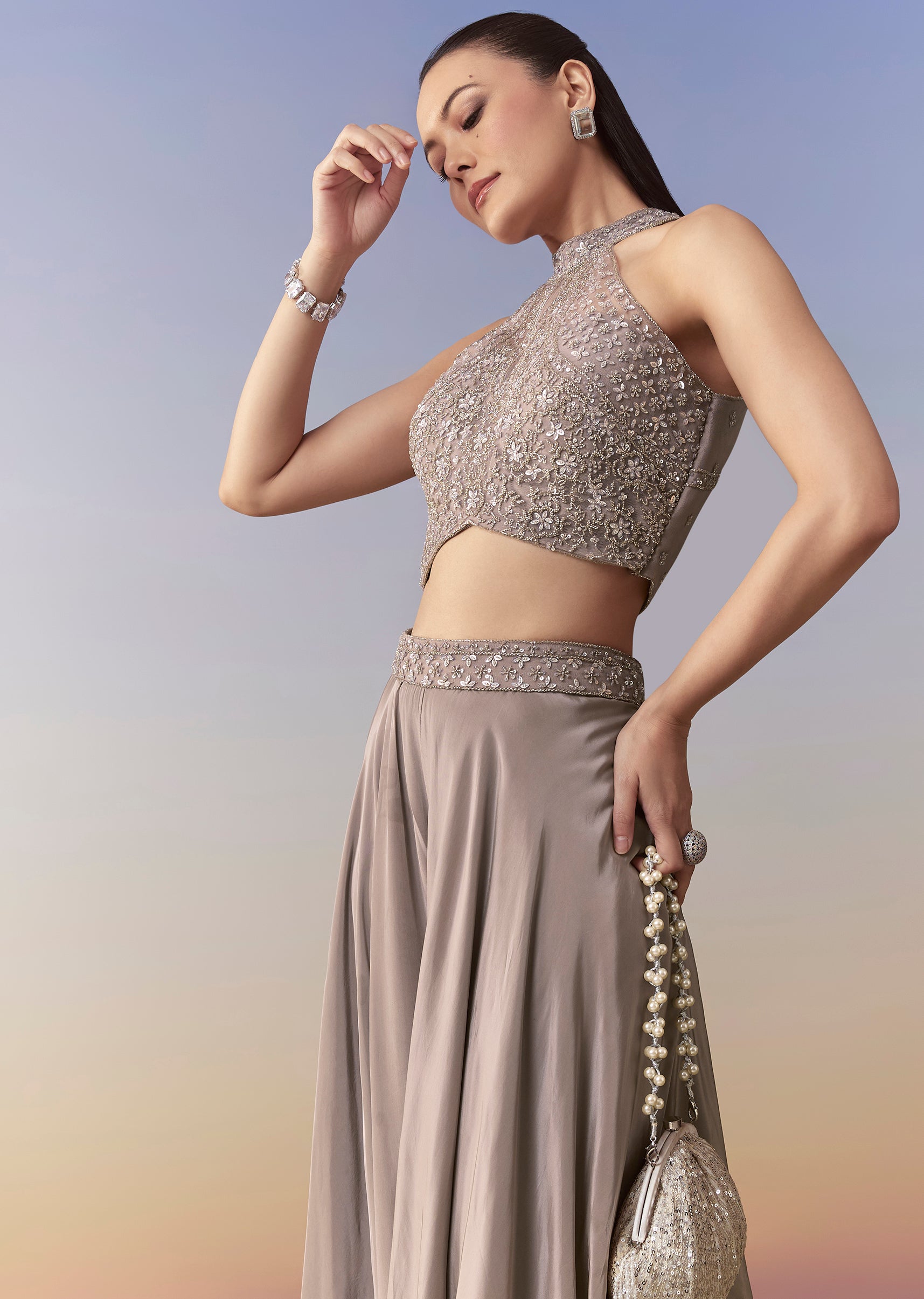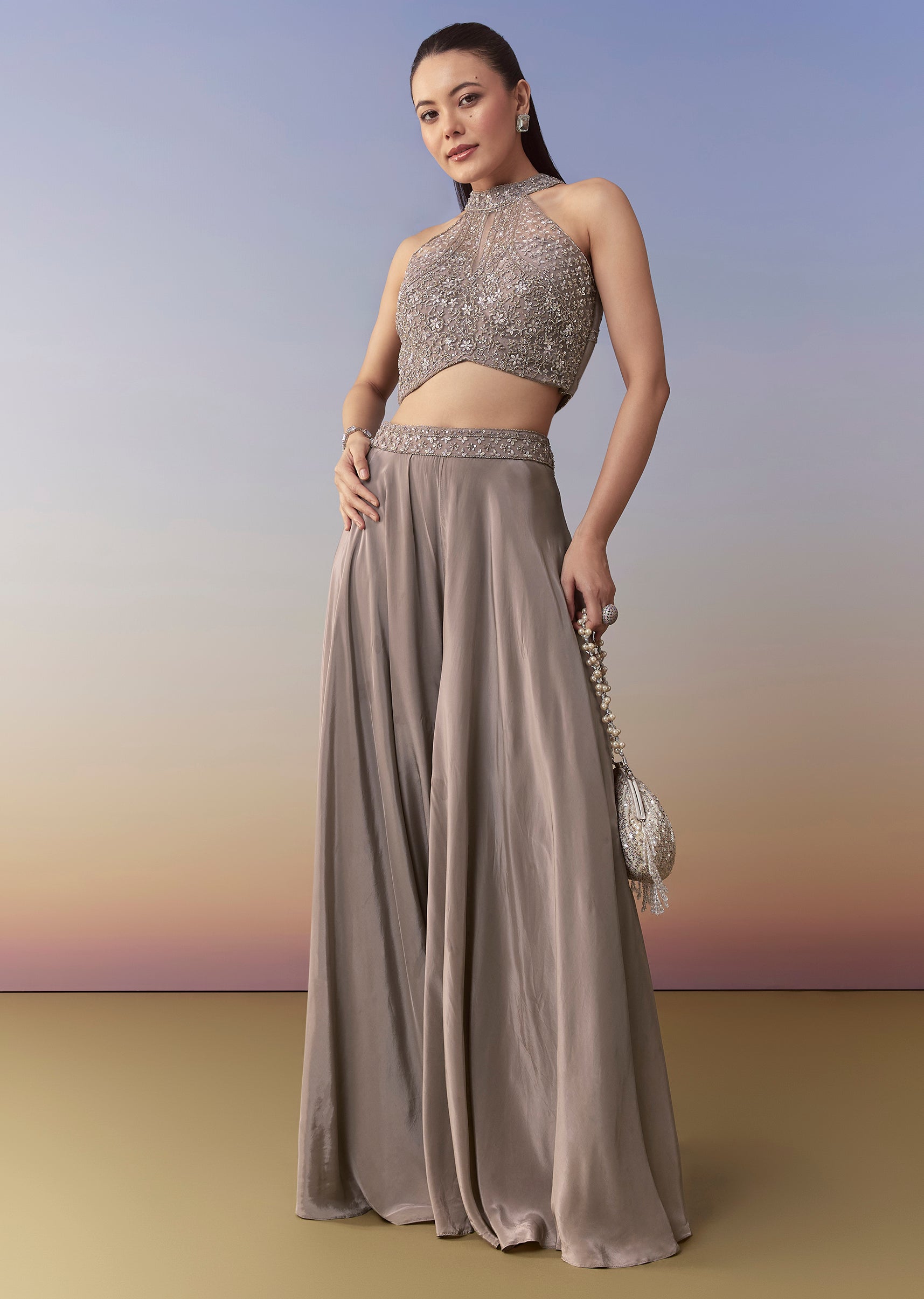 Achieve effortless sophistication with this grey palazzo set, featuring a crop top adorned with cutdana and sequin work that adds a subtle yet striking shimmer. The soft, flowy palazzo complements... More Product Details