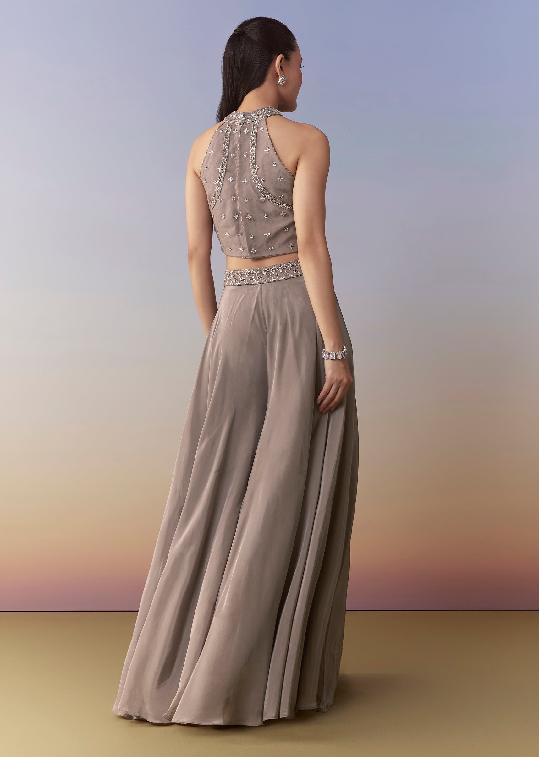 Grey Crepe Sequin Embellished Crop Top Palazzo Set