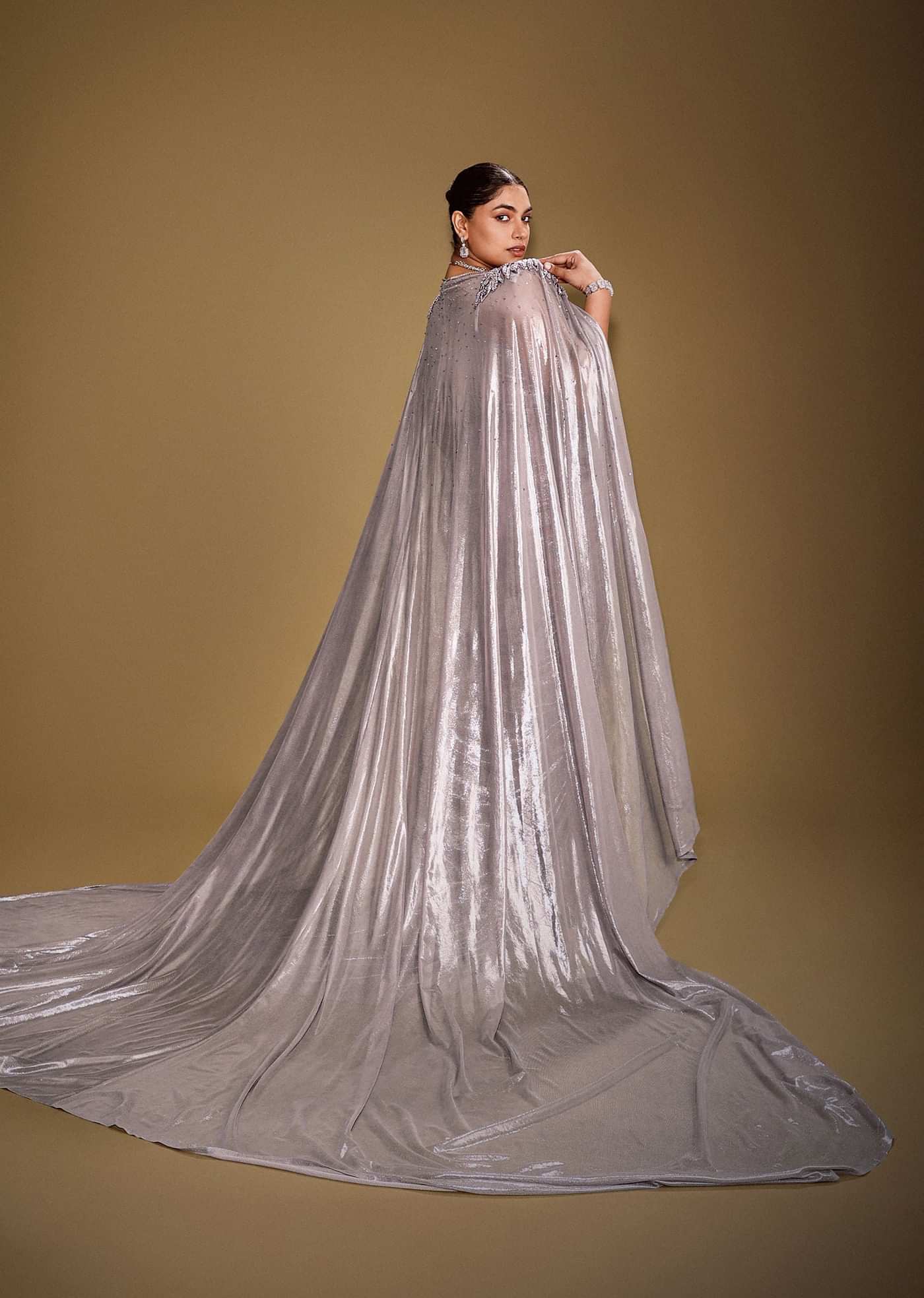 For cape gowns, ensure the cape sits snugly on the shoulders and flows without bunching, this highlights the drape and structure of the gown.