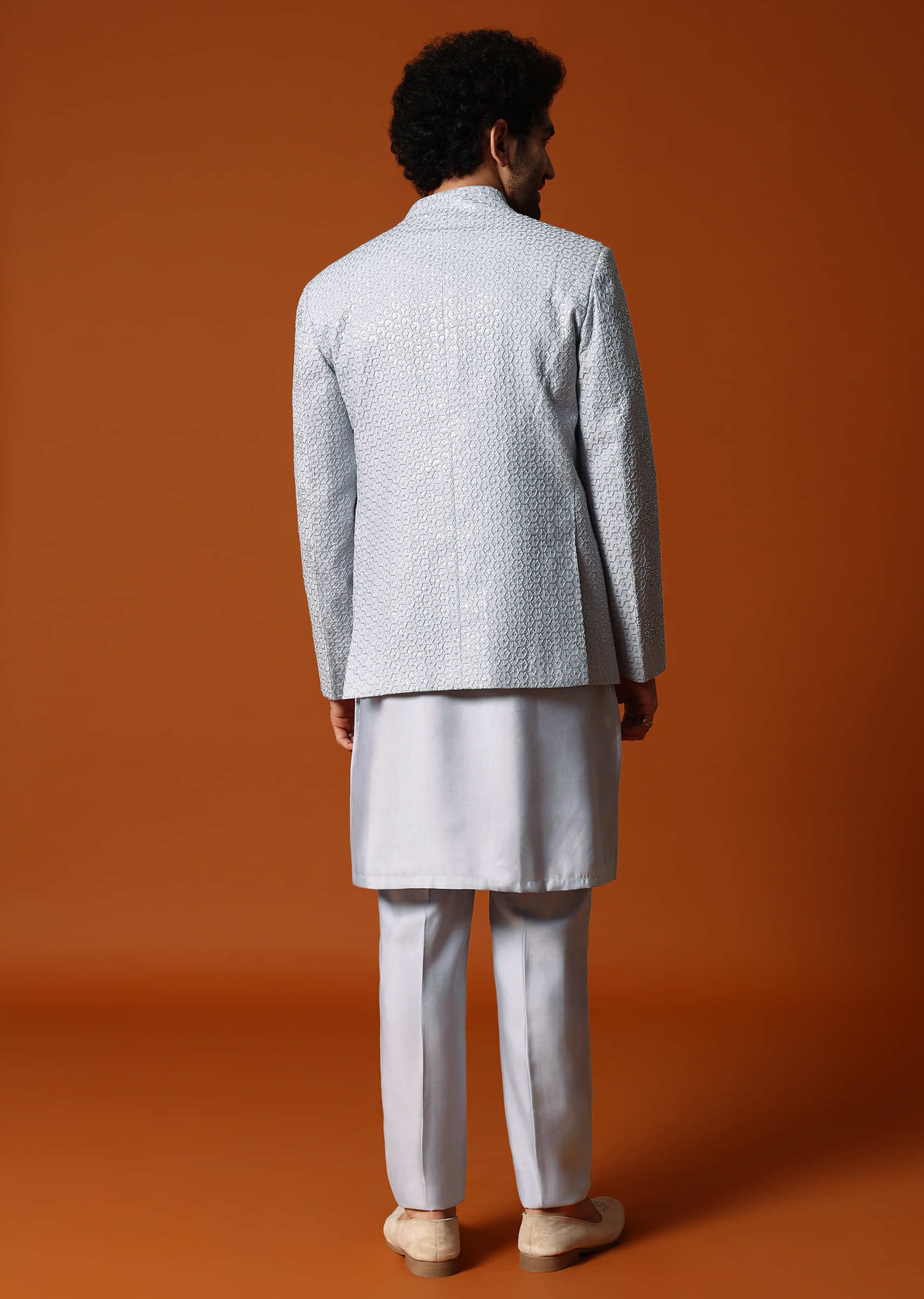 Embrace timeless elegance with our grey jodhpuri set, meticulously crafted for sangeet and wedding celebrations. Made from premium polyester, this set showcases intricate resham work and sequin embroidery. The jodhpuri ensemble comprises a bandi, a kurta, and bottoms. Awarded as the Most Trusted Brand, we're delivering styles you love, just as promised.