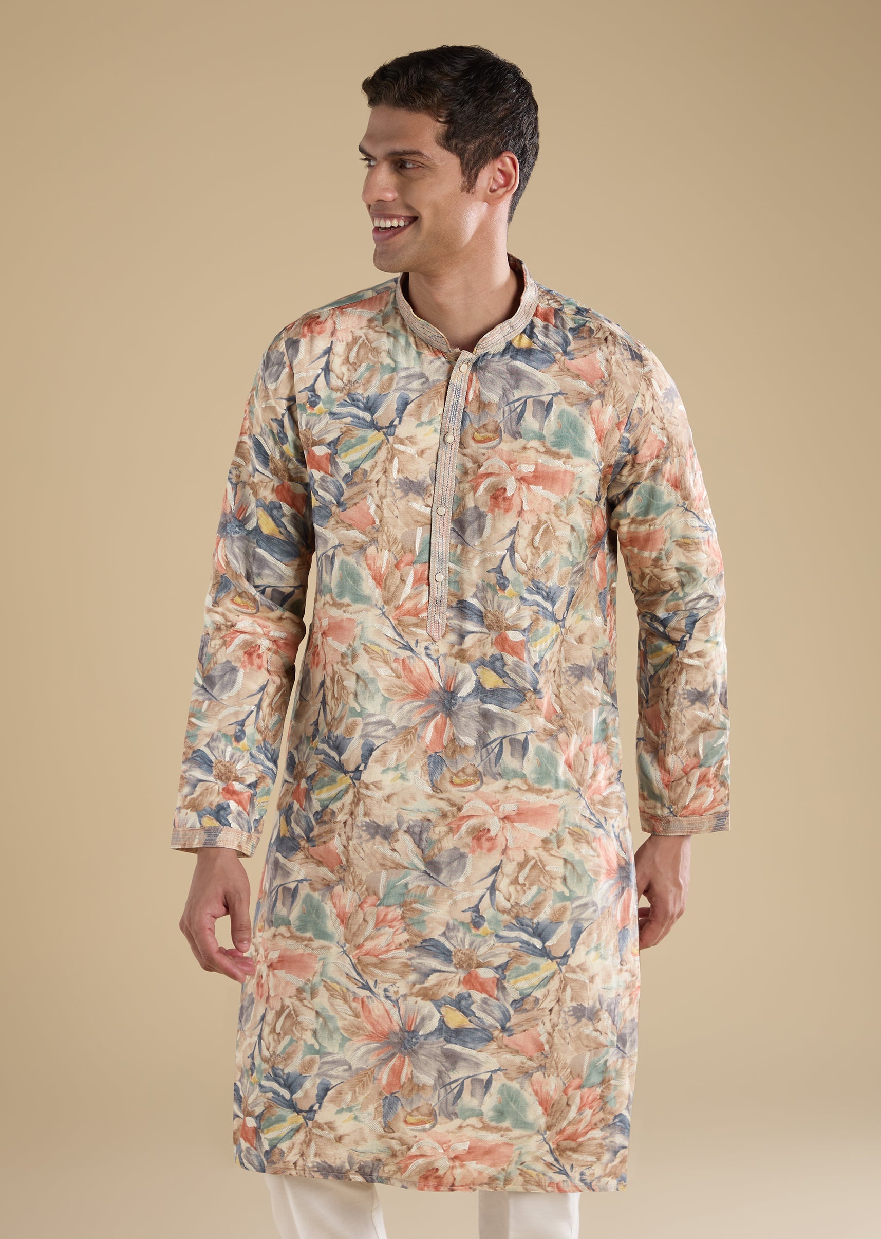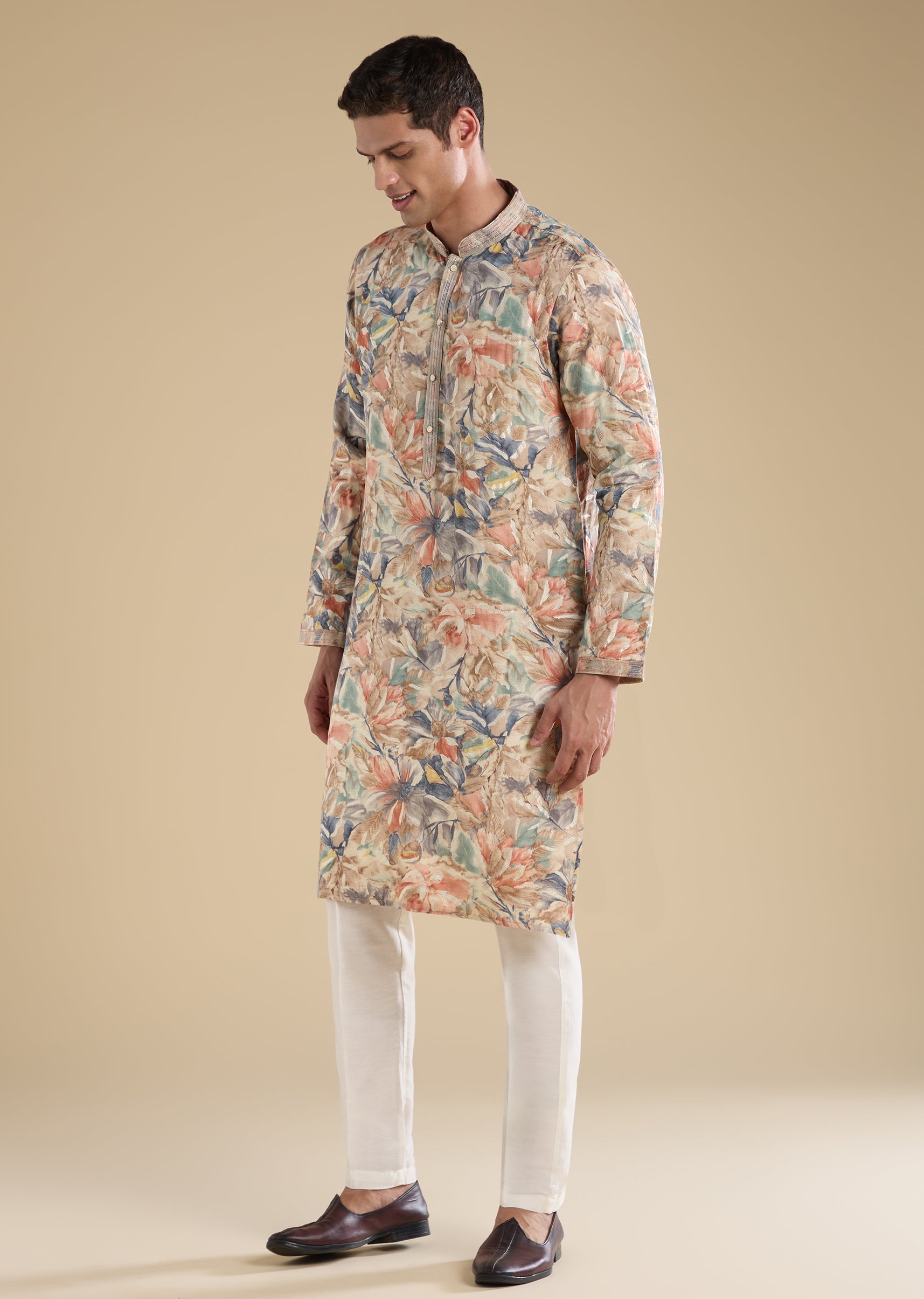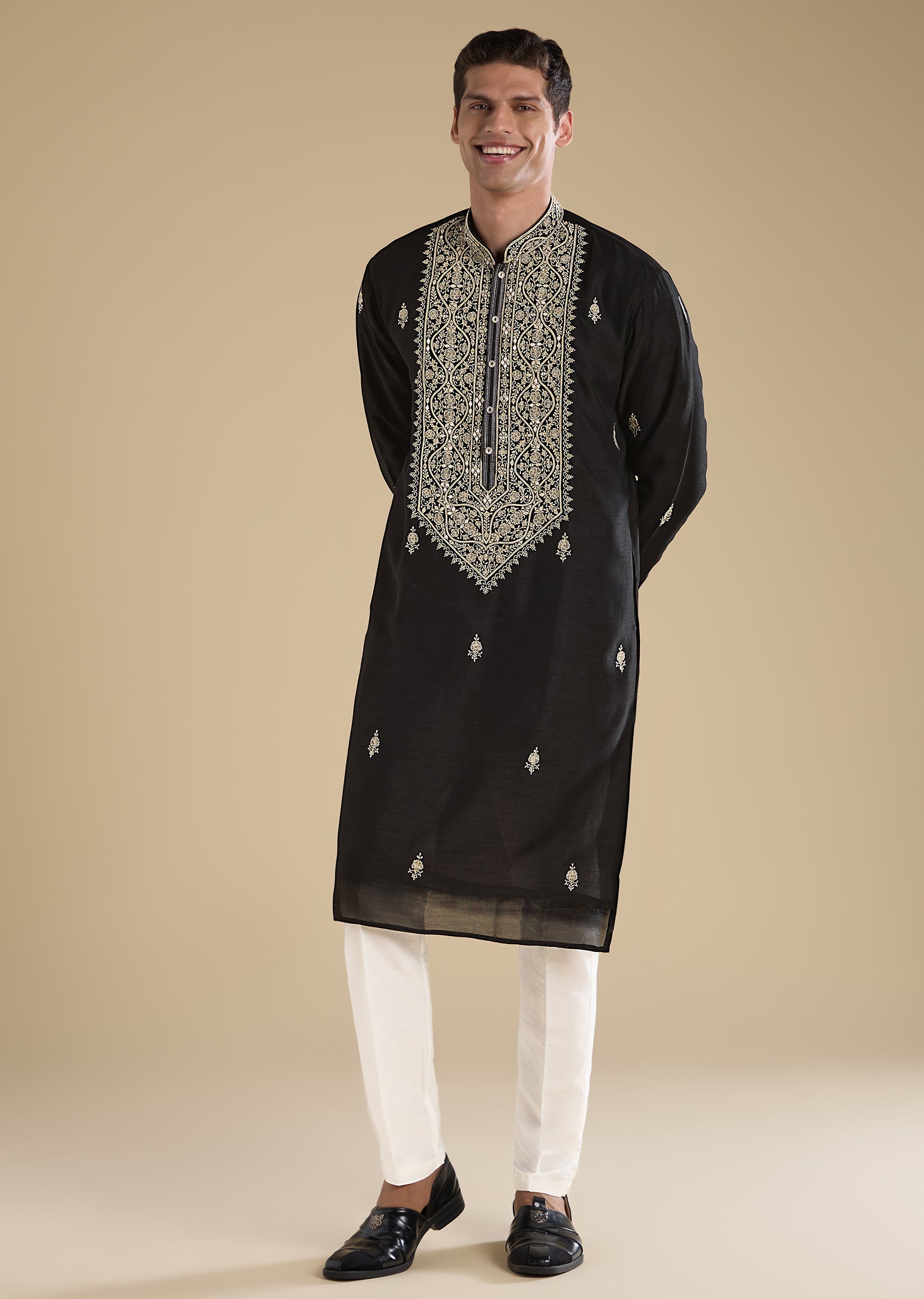 Crafted in art silk, this grey kurta set features subtle thread embroidery. Finished with a mandarin collar, full sleeves and front button with hook-eye closure, it is paired with straight-fit... More Product Details