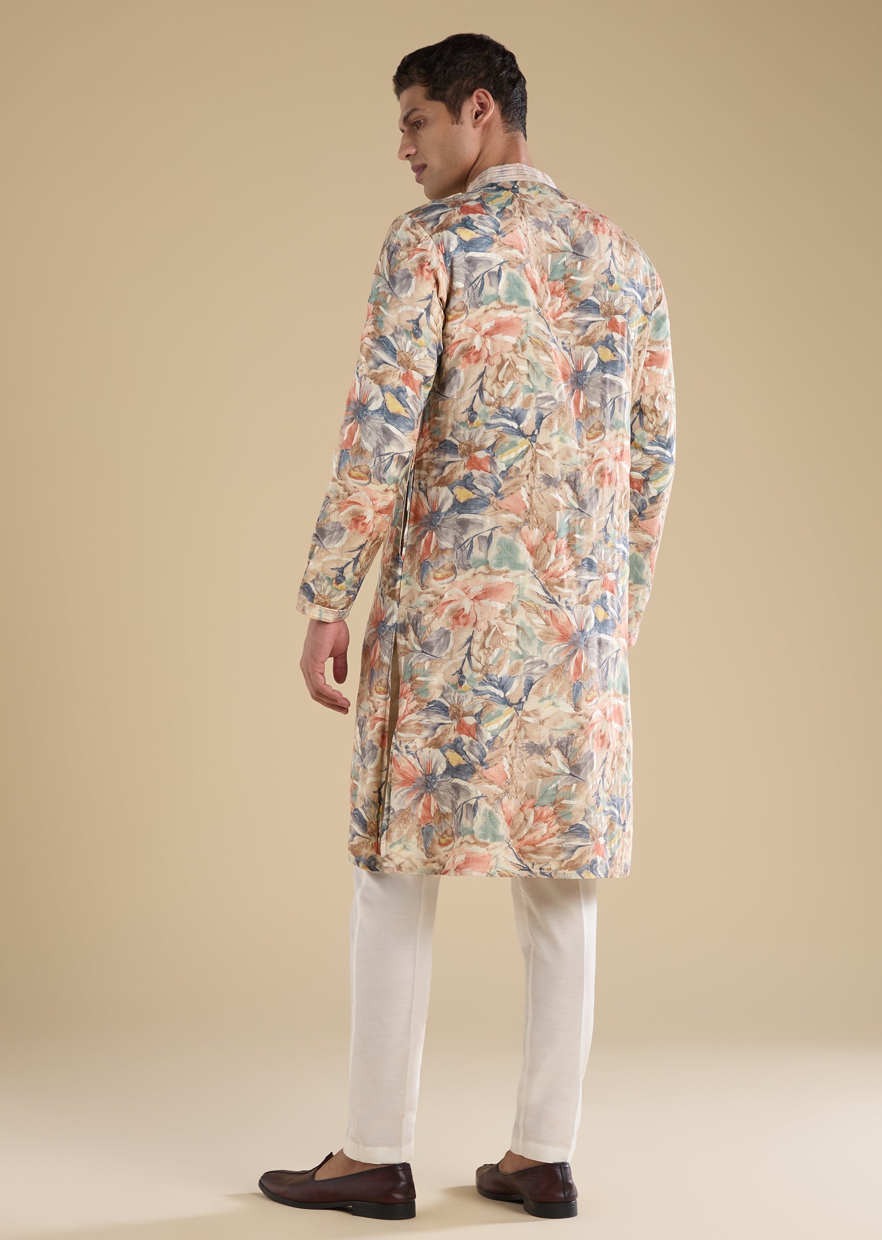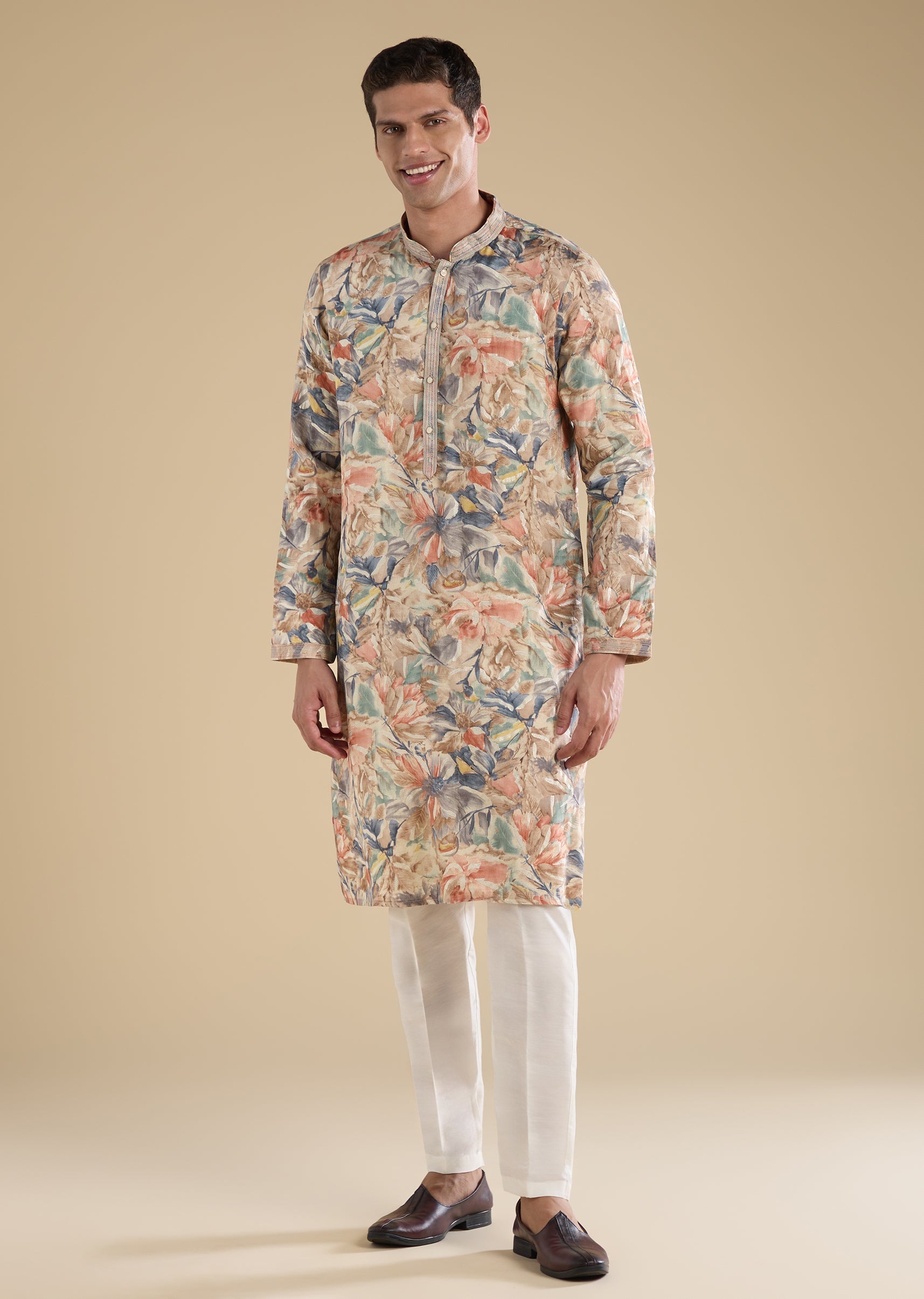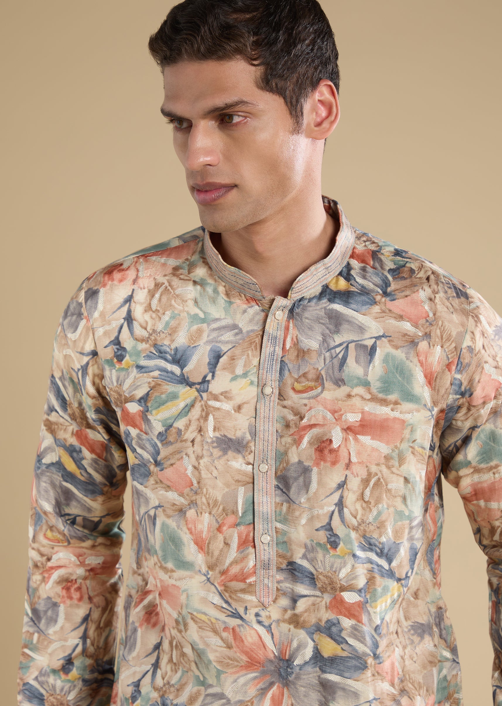 Crafted in art silk, this grey kurta set features subtle thread embroidery. Finished with a mandarin collar, full sleeves and front button with hook-eye closure, it is paired with straight-fit... More Product Details