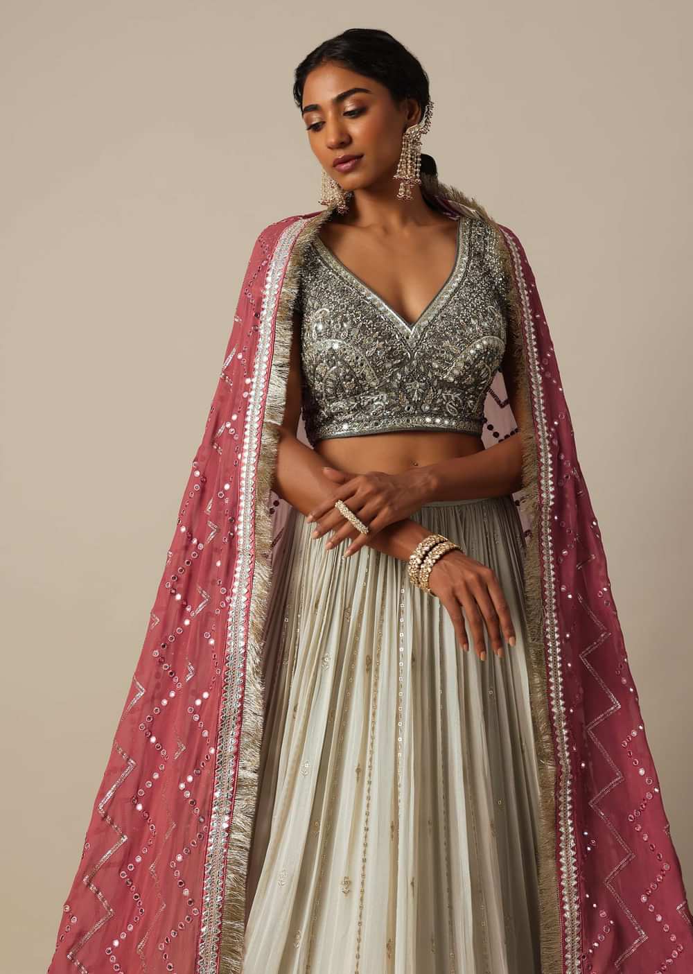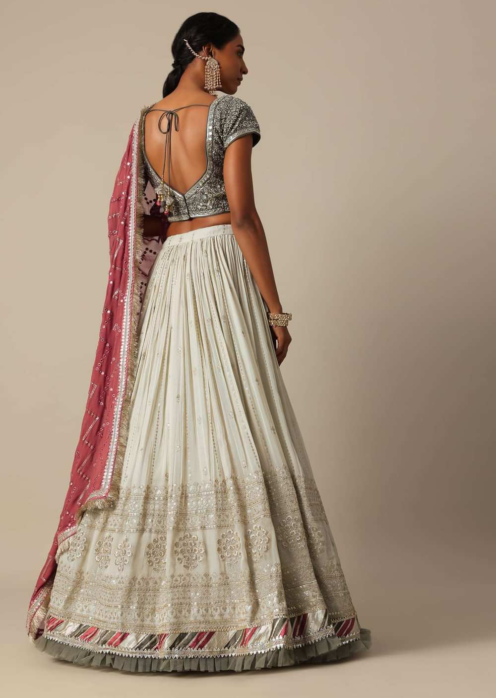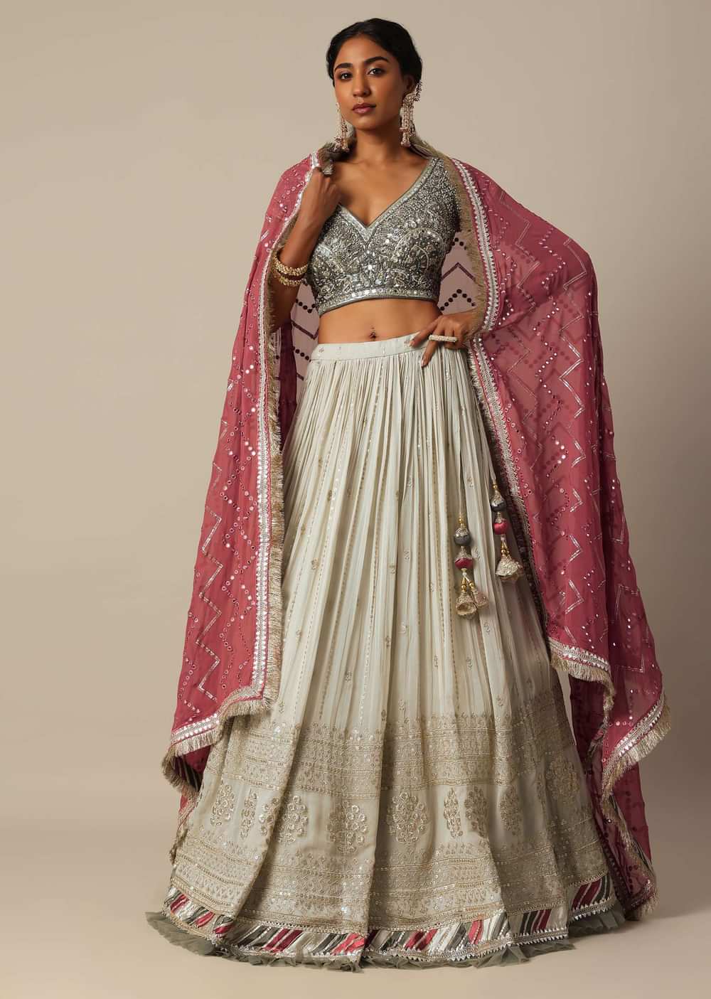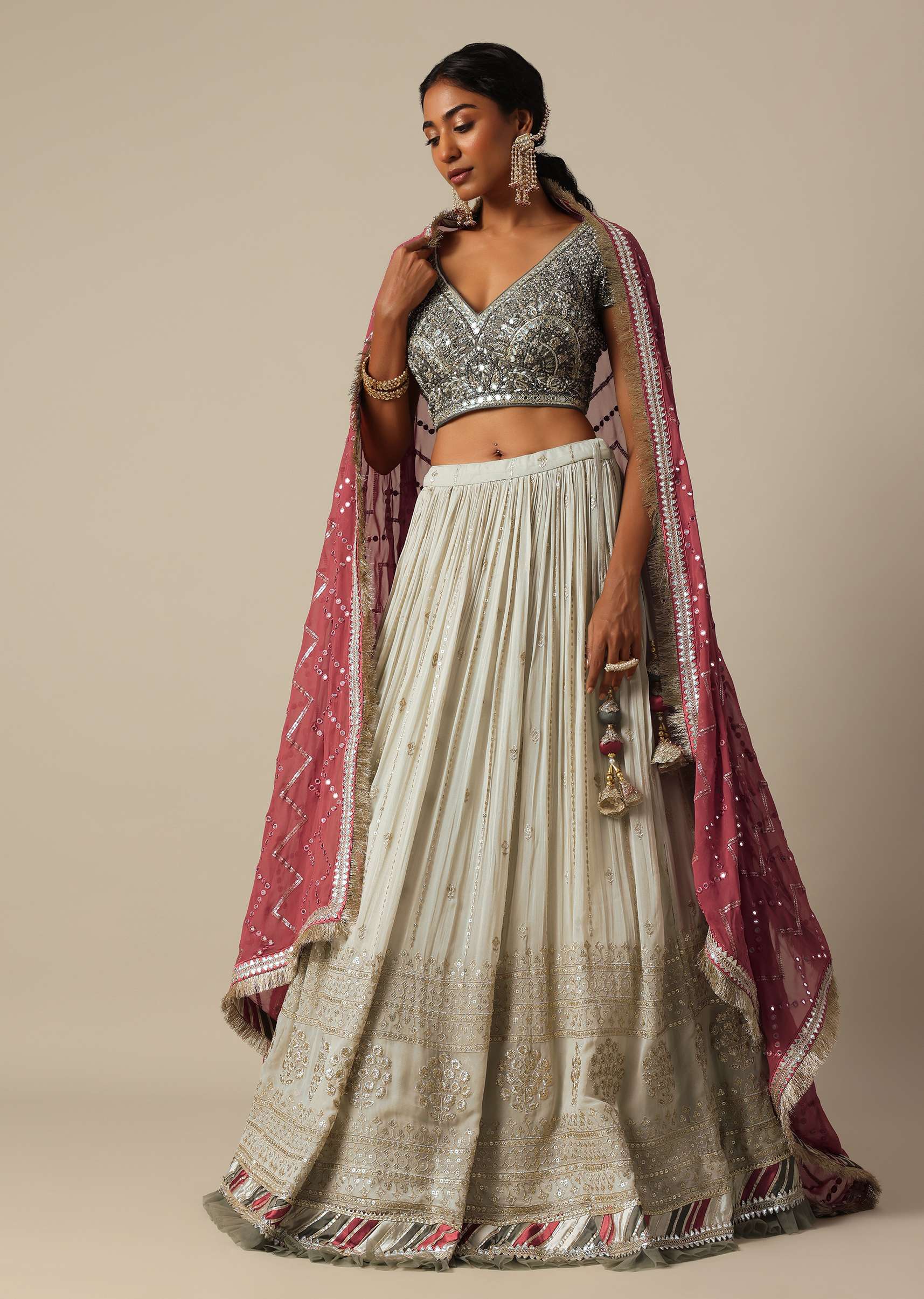 A must have in your wedding wardrobe collection is this opulent lehenga set. Decked in a grey hue, it boasts of a stylish design. Adorned with intricate zardozi work, it flaunts glimmering mirror and beaded embroidery. Featuring a V neckline blouse, this three piece set comes with a complementing stylish dupatta. Lehenga border may vary.Awarded as the Most Trusted Brand, we're delivering styles you love, just as promised.