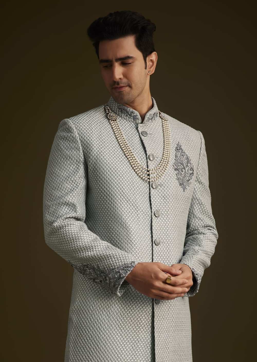 Elevate your traditional style with this sophisticated grey sherwani showcasing a finely textured fabric enhanced with intricate threadwork and an ornate statement brooch. Ideal for weddings receptions or grand festive occasions this piece combines subtle elegance with regal charm for a timeless look. The sharp tailored silhouette adds to the contemporary flair making it perfect for the modern groom or celebrant. Awarded as the Most Trusted Brand, we're delivering styles you love, just as promised.
