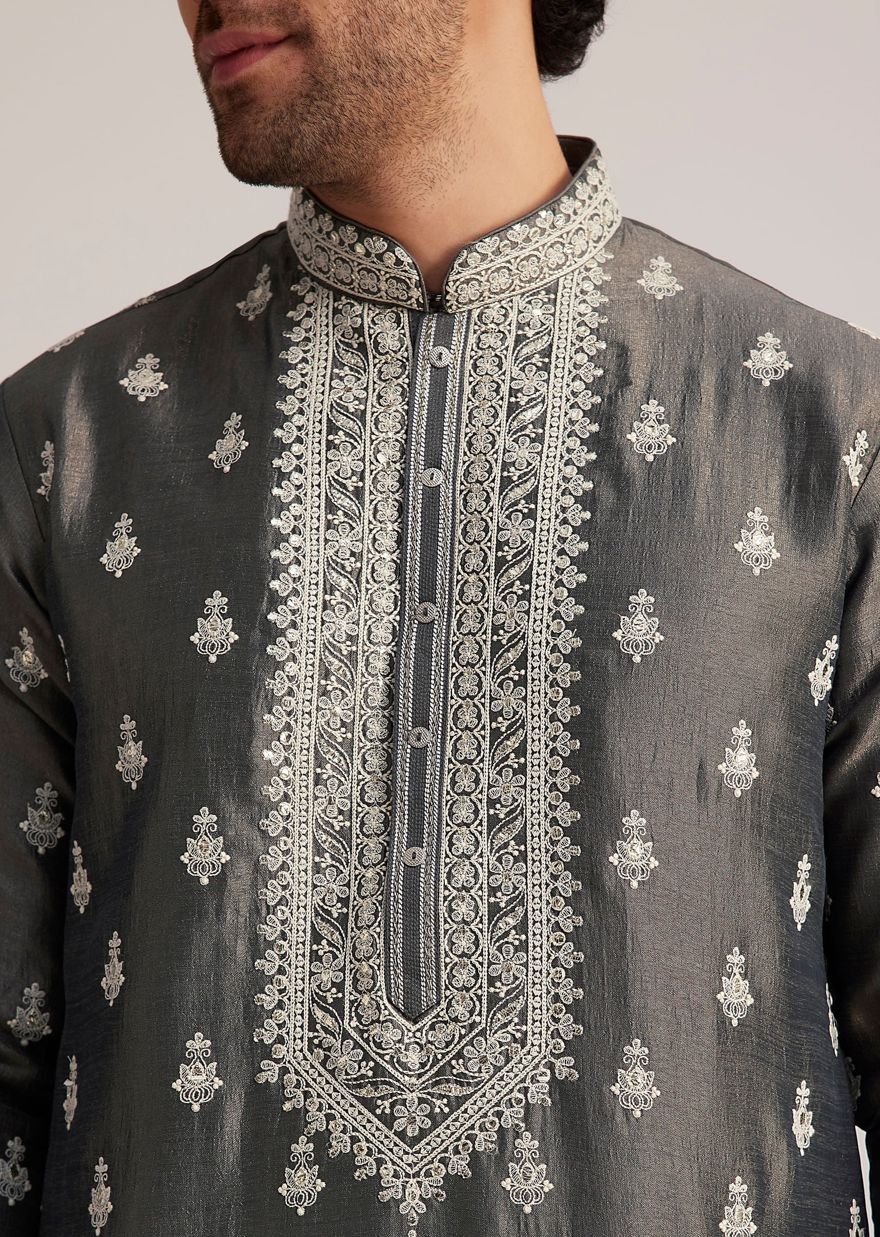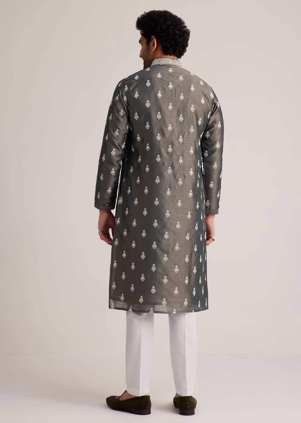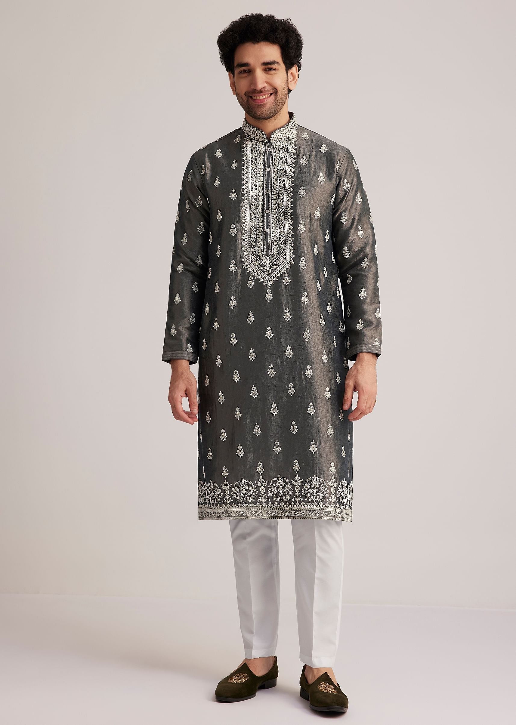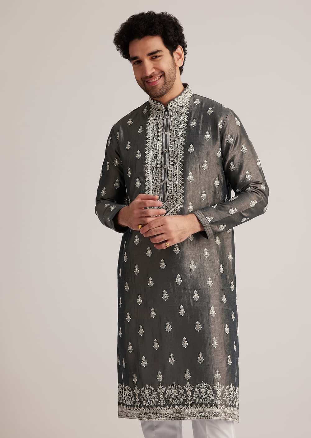 - Elevate your festive attire with this grey kurta set, featuring intricate silver embroidery that exudes understated sophistication.